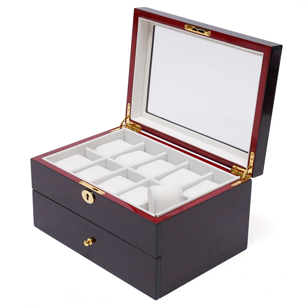 This watch box is a game-changer! The sleek sandalwood grain and glass top make it look luxurious, while the soft velvet lining keeps watches safe and scratch-free. The double-layer drawer holds up to 20 timepieces neatly, and the lock adds extra security. Perfect size for a dresser or closet—sturdy, stylish, and totally worth it!