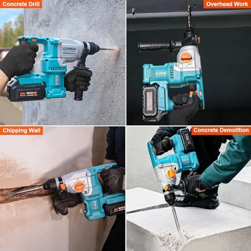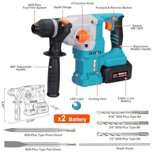 Return Policy Fast Delivery Trusted seller 20V Cordless 1-1/8" Rotary Hammer Drill SDS-Plus Brushless Motor included 2X4.0Ah Li-ion Battery with Dual Kickback Control,3.0A Fast Charger,4 Mode Variable Speed Rotomartillo for Concrete Product Description 【High-capacity 4.0AhX2 & Storage Case】20V Rotary Hammer x1, SDS-Plus Drill Bits x3, Point Chisel x1, Flat Chisel x1, High-capacity 4.0Ah Li-ion Battery x2, Super Fast 3.0A Charger x1, Carrying Plastic Box x1, User manual x1, Premium Metal Depth Gauge x1. 【Efficient Brushless Motor】Brushless motors make the motor run cooler, more efficient, and more durable by reducing motor wear.Delivers 0-1,150 RPM and 0-5,100 BPM, 2.1 ft.lbs./2.8 Joules of impact energy for fast drilling in concrete, brick, wood, metal,masonry, wall. 【High-power battery and 3.0A super fast charger】The 4.0Ah battery uses electronic control to optimize battery energy usage and extend service life. Applicable to all lithium projects. Includes ultra-fast charger with protection, fully charged in just 1.5 hours. 【Easy to Operate】:Set tool to 4 mode operations of "Drilling Only", "Hammer with drilling" ,"Hammer Only" , "Chisel Angle Adjust" for multiple applications. The forward and reverse switch and variable transmission provide user maximum control and accuracy. 【Compact and ergonomic design】Weight only 7.2 lbs for portability, and compact size allows it to access into high and tight areas. 360°adjustable auxiliary handle,enhances your experience. Shipping Returns Payment Shipping Shipping is FREE to all addresses other than APO/PO boxes in the lower 48 states. All our stock ships from US-based warehouses. Shipped via USPS or UPS (depending on location and package weight) Unless stated otherwise, all orders will ship within 24-72 hours of your payment being processed. Check our feedback to see the great reviews of FAST shipping we offer. Returns Seller does not accept returns Payment We currently accept payment via eBay managed payments only. Once payment is cleared, we will dispatch your shipment within 1-3 business days. Please refer to the "Shipping" tab for more information regarding shipping speed to your destination.