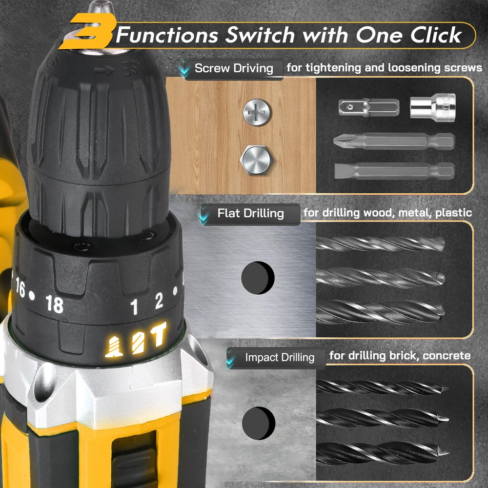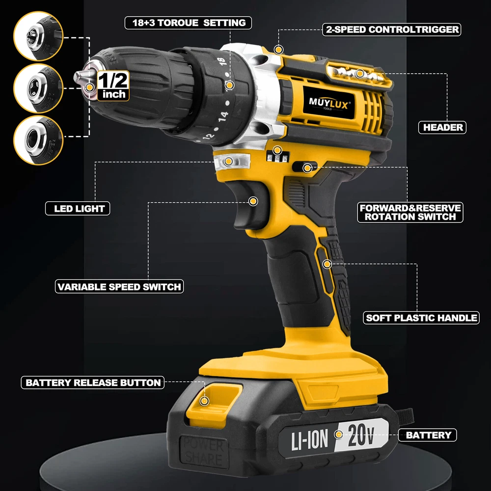 20V Cordless Drill,45Nm torque,2-speed,18+3 clutch, 2.0AH battery,fast charger