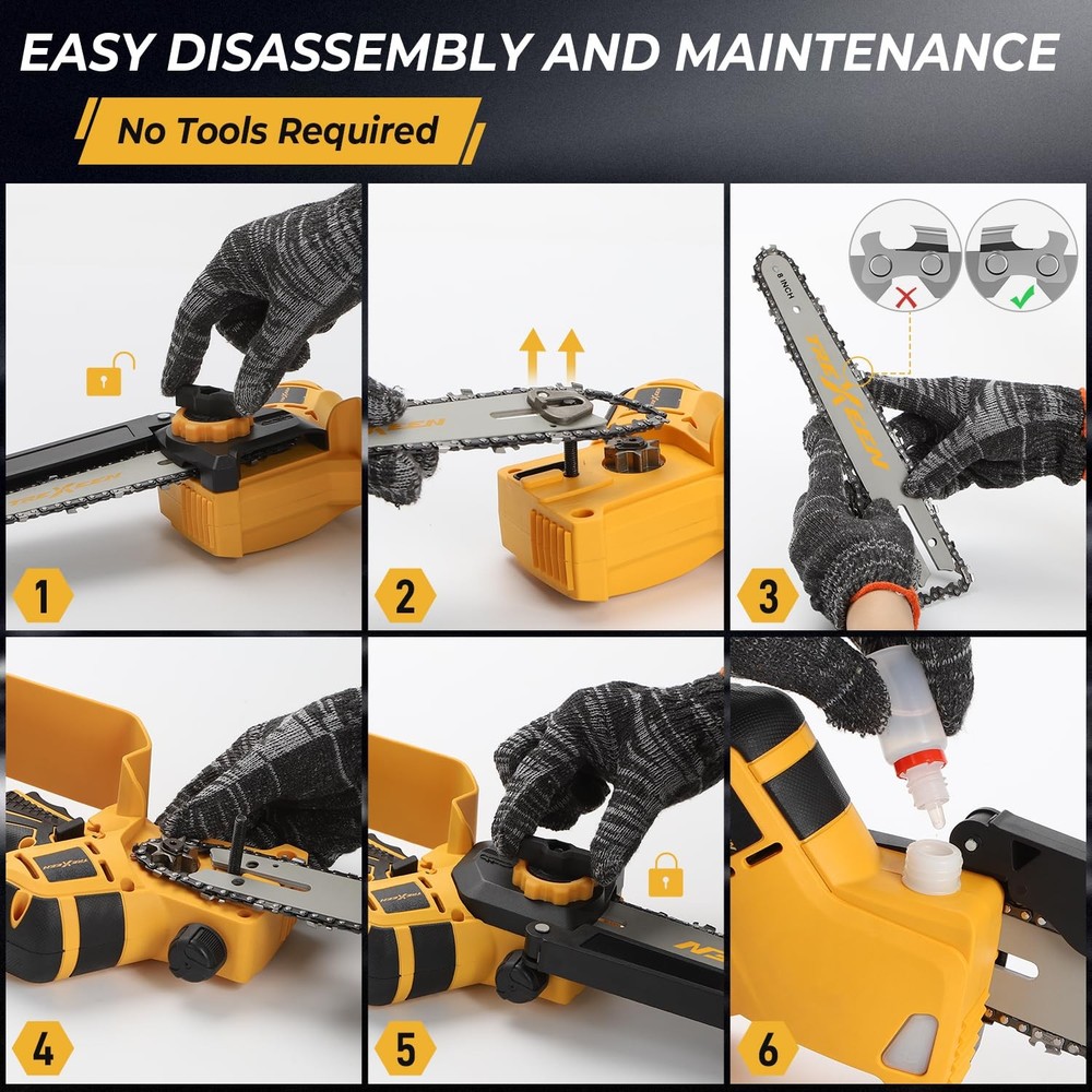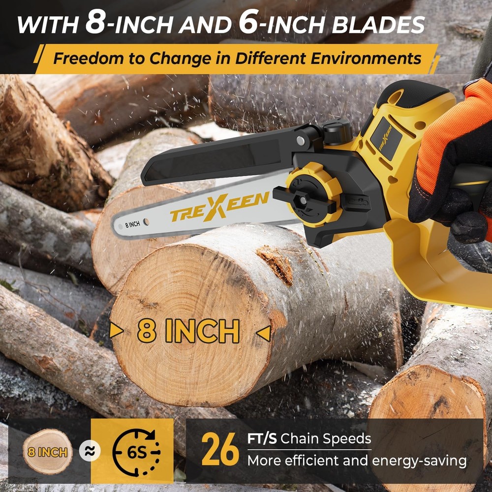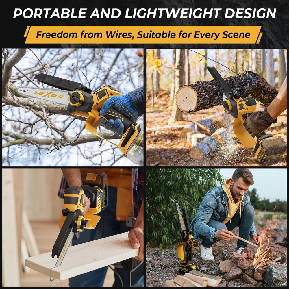 Discover the Chainsaw 20V, your ideal tool for gardening and DIY projects. This mini chainsaw, with its portable cordless design, provides you with the freedom to cut and trim without restrictions. The safety lock feature ensures worry-free usage every time, while its powerful performance easily tackles various materials. Whether you're handling small repairs at home or engaging in outdoor gardening, the cordless mini chainsaw is an indispensable assistant. Choose for a perfect blend of efficiency and safety, making your tasks simpler and more enjoyable! Compatible 20V Batteries: Specifically designed compatibility, making it easy to carry for outdoor tasks and home projects.This product does not come with batteries Safety Lock Feature: Equipped with a safety lock to prevent accidental starts, ensuring secure and safe operation for all users, especially beginners. 8-inch & 6-inch Dual-Length: Enjoy versatile cutting options with dual-length capabilities, allowing you to tackle various jobs efficiently. Powerful Performance: This mini chainsaw delivers robust cutting power, effortlessly handling gardening tasks, wood cutting, and more. User-Friendly Operation: Designed for easy use, the cordless mini chainsaw allows anyone, from DIY enthusiasts to professionals, to operate it with confidence.Perfect for gardening, home repairs, and DIY projects, this mini chainsaw is an essential tool for any toolkit.