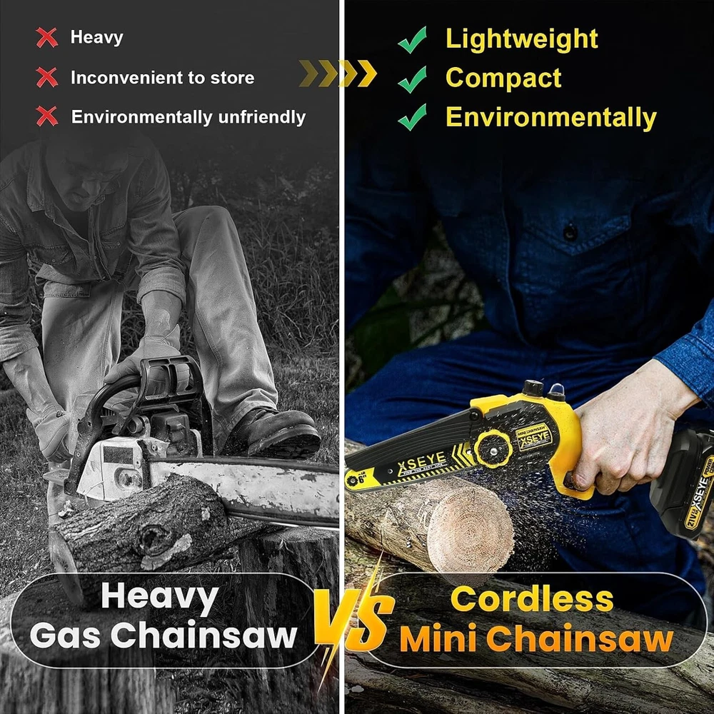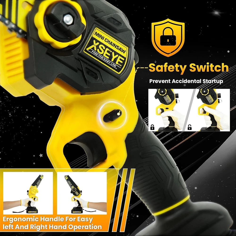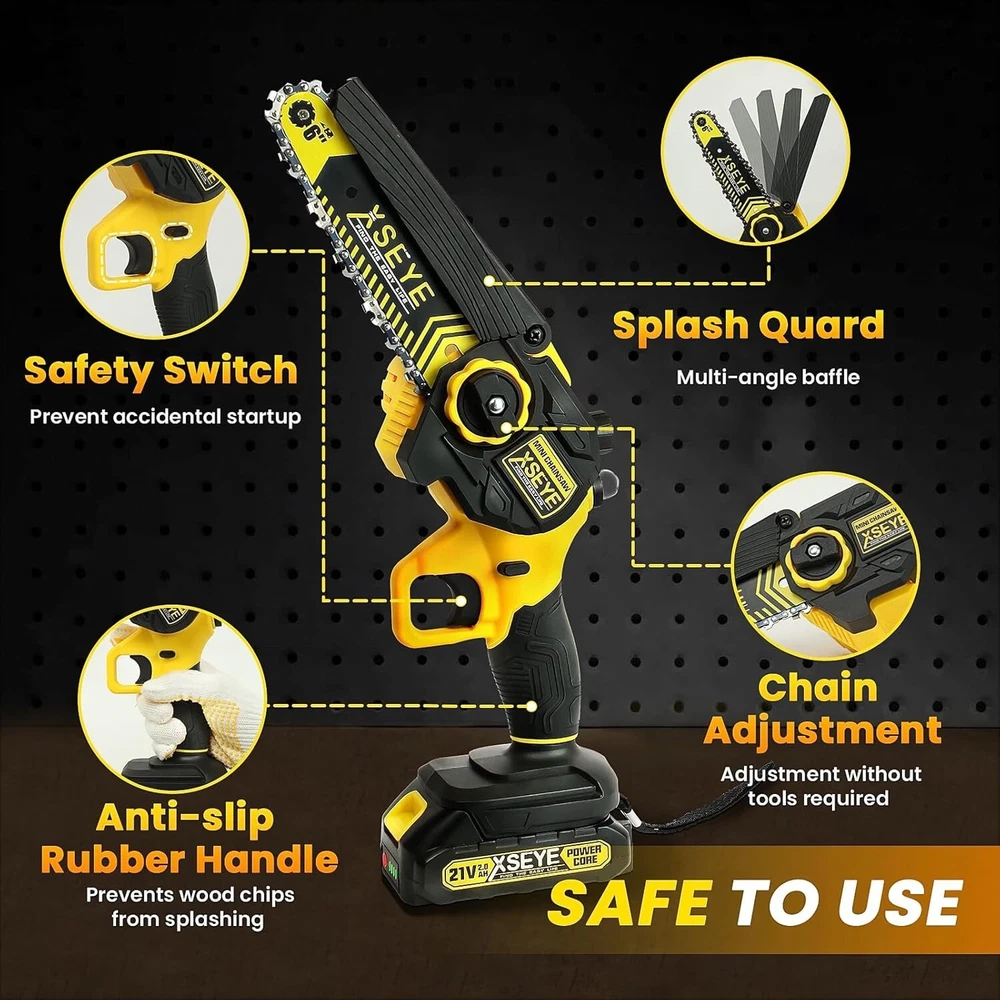 【AUTO-LUBRICATION SYSTEM】XSEYE mini chainsaw features an automatic oiling system for easy maintenance. Simply pour oil into the tank, tighten the cap, and squeeze the bulb a few times to lubricate the chain. The auto-lubrication system reduces chain wear, extends its lifespan, and ensures smoother, more efficient cutting. 【BATTERY POWER INDICATOR】This mini chain saw battery powered comes with a 21V 2000mAh rechargeable lithium-ion battery, providing long-lasting power and easy removal for convenient recharging anytime. The battery includes a power indicator, so you can easily monitor remaining usage time. Perfect for a variety of cutting tasks, the electric tree trimmer excels in wood cutting, garden trimming, pasture maintenance, backyard work, and more. 【550W PURE COPPER MOTOR】This electric chainsaw cordless features a robust 550W pure copper motor, delivering an impressive idle speed of up to 19,000 RPM for powerful performance. Equipped with a high-quality metal chain, it effortlessly cuts through branches up to 6 inches (15 cm) in diameter, as well as wood and more. Ideal for tree trimming, camping, and gardening, it makes these tasks hassle-free and efficient. 【LIGHTWEIGHT & PORTABLE】XSEYE Lightweight Mini Cordless Chainsaw weighs just 5.86 pounds and features an ergonomically designed handle for comfortable, fatigue-free one-handed use. It’s easy to maneuver and a joy to work with, making it ideal for beginners and gardeners alike. The cordless design ensures excellent portability, even in tight spaces. 【SAFETY LOCK】User safety is our top priority, which is why the mini chainsaw is equipped with a safety lock. The cordless chainsaw only activates when both the safety lock and trigger are pressed simultaneously. Additionally, a removable, adjustable splash guard on the guide plate helps prevent flying debris, while the included goggles offer excellent eye protection. 【PERFECT GIFT CHOICE】XSEYE mini chainsaw cordless is your first choice of gifts for Men Dad Him Husband Gardener Wife at Christmas Birthday Anniversary, etc. Choose this mini cordless chainsaw and bring him/her a holiday surprise! 【365-Day Warranty for XSEYE Products】 We are committed to product quality and offer a 365-day support plan—no complicated return process required. Check the "Product Description" section for helpful usage and maintenance tips. If you have any questions, our team is always ready to assist you.