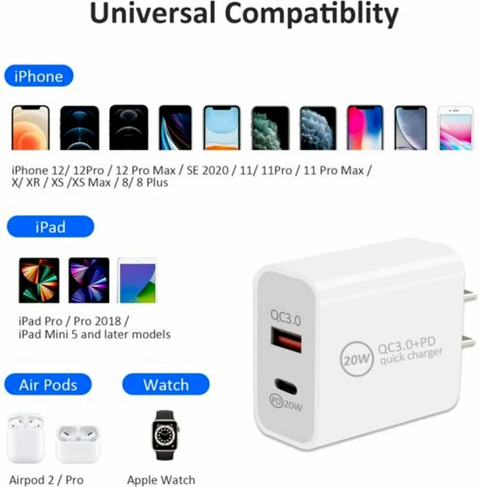 Description: 【20W Dual Port Fast Charging】Equipped with USB-C (PD Power Delivery) and USB-A (QC3.0 Quick Charge) dual port with totally 20W output, you can charge two devices at the same time 【The USB-C Port】20Watt Type-C PD Power Delivery -The latest generation fast charging technology, Charge 2.5x faster than the 5W charger, you can charge for iPhone 12 from 0 to 50% in about 30 minutes ( Fast charging List: iPhone 12 / Pro / Max / Mini, iPhone 11 / XS / X / XR / 8 / 8 Plus ) 【The USB-A Port】 QC 3.0 Quick Charge - Max speed charge your QC3.0 Enable Devices, Including for Samsung Galaxy S20/S10/S9/S8/S7, Moto, LG More Android Phones, also can charge for iPhone, iPad in ordinary speed. 【Safe and Compact】 Built-in smart chip will prevent over-current, overcharging, overheating and high temperature to protect your device safety. The USB C Charger small and exquisite, you can take everywhere. For iPhone Charger Cable: Full Support with iOS versions and all future updates Strong and durable premium material support upto 5500 times bending High coverage aluminum foil makes data transmission is not disturbed by external signals Gold-plated C48 terminal and tinned copper material ensures charging performance increased by 30% Fast Charging speed and High Speed transmission Compatible with Devices: For iPhone SE 2020/13/12/11/ Pro/Max/iPhone Xs/Max/XR/X/8/8 Plus For iPhone 7/ 7 Plus / 6s Plus / 6s / 6 Plus For iPhone 5s / 5c / 5 / SE For iPad Pro / iPad Air / Air 2 For iPad mini 2 / mini 3 / mini 4 For iPad 4th gen For iPod Touch 5th gen / iPod Nano 7th gen and Beats Pill+ Package Included: 2X 3ft/6ft USB Cable (Optional) 2X Dual Port Adapter (Optional)