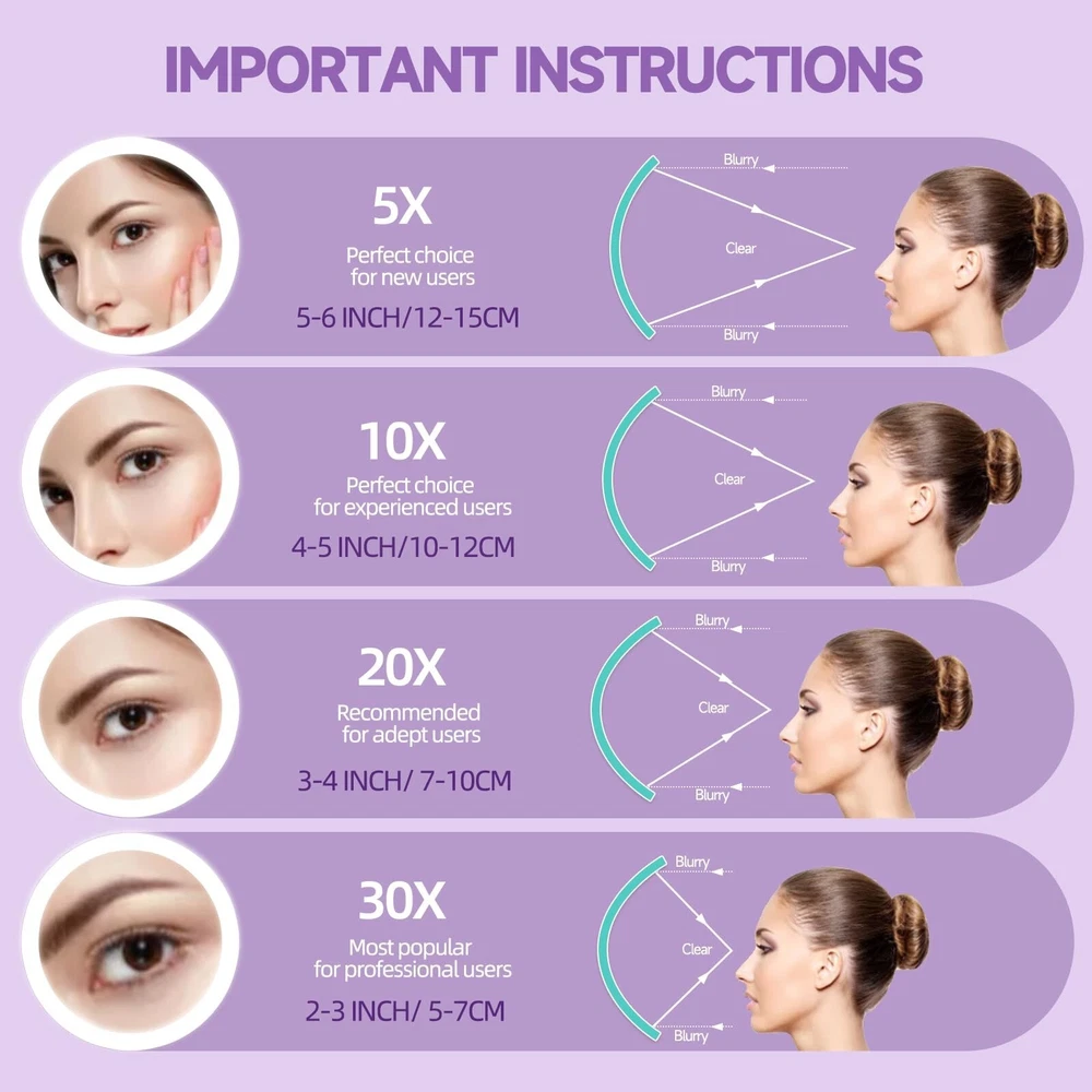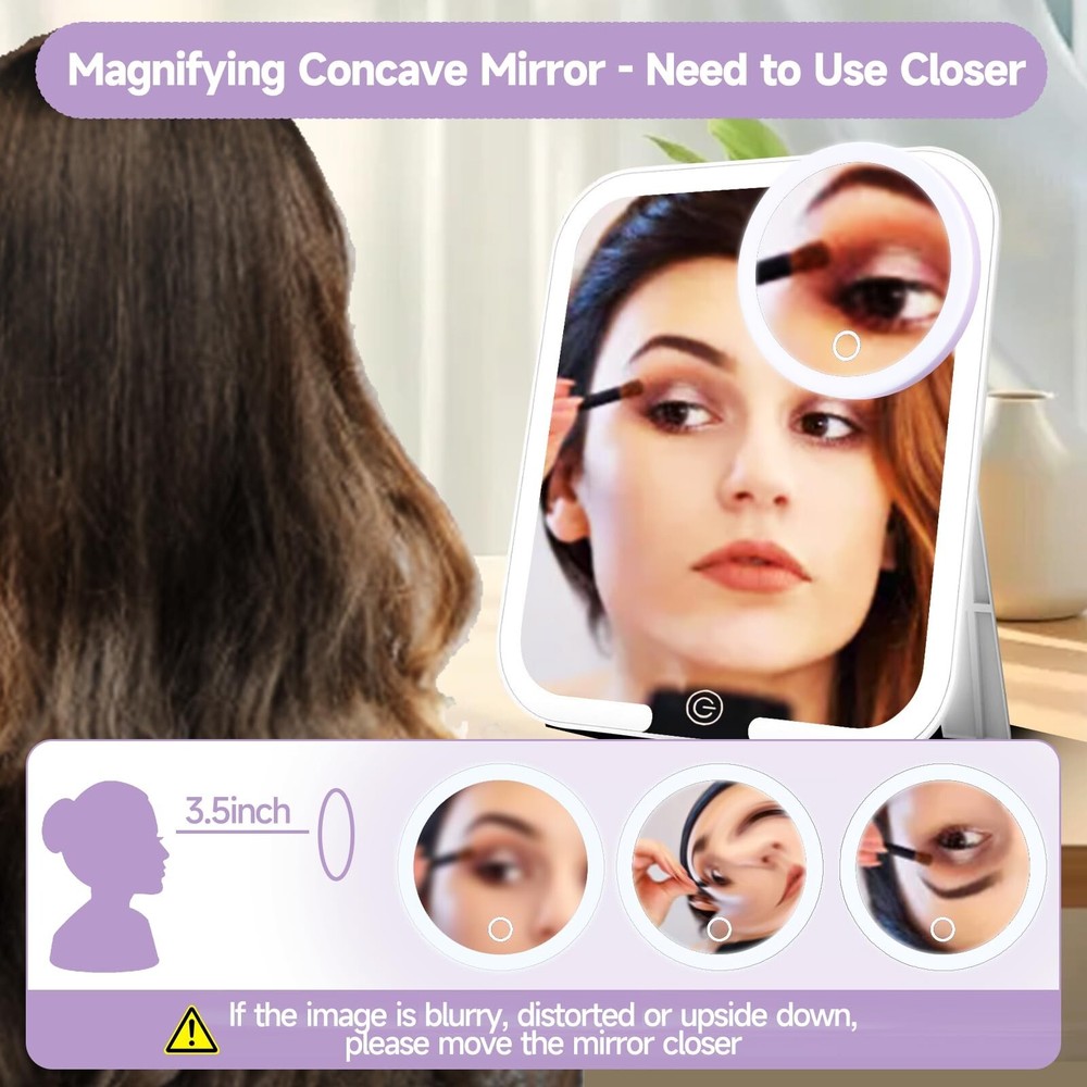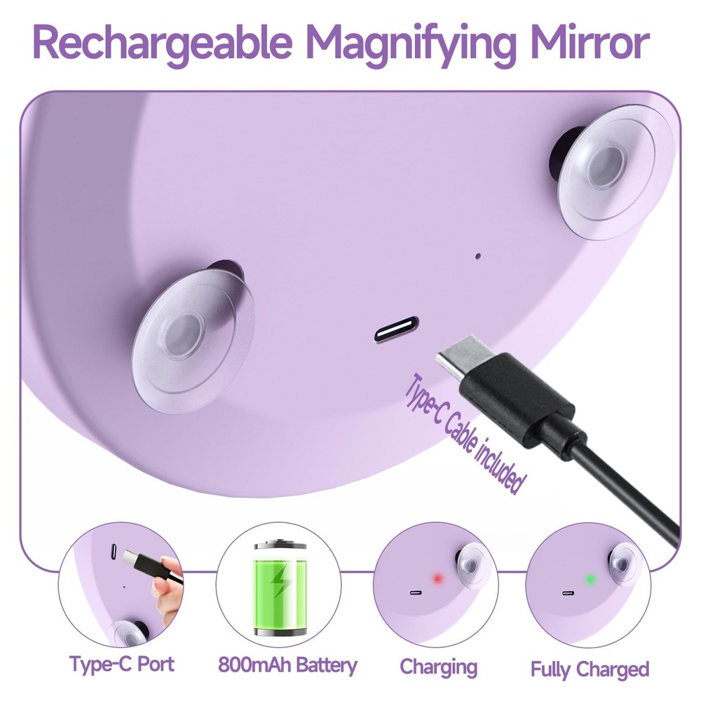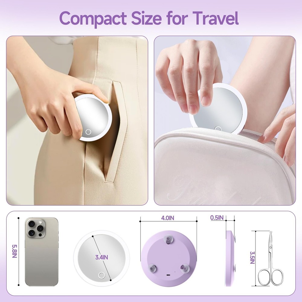 Travel Magnifying Mirror with Light 20X, 4inch Rechargeable Lighted Magnified Mirror with Suction Cups, Small Magnifying Mirror 20x High Magnification Compact Pocket Makeup Mirror with Scissors Product Details Color: 20x-purple Size: 4"L x 4"W Brand: Suupvaor MPN: Does not apply UPC: Does not apply EAN: Does not apply Brand: Suupvaor Room Type: Bedroom, Bathroom, Dressing Room, Living Room, Hotel, Travel Shape: Round Product Dimensions: 4"L x 4"W Frame Material: Acrylonitrile Butadiene Styrene (ABS) Brand: Suupvaor Room Type: Bedroom, Bathroom, Dressing Room, Living Room, Hotel, Travel Shape: Round Product Dimensions: 4"L x 4"W Frame Material: Acrylonitrile Butadiene Styrene (ABS) Style: Modern Mounting Type: Wall Mounted, Portable, Handheld Finish Type: Polished Surface Recommendation: Wood, Glass, Ceramic, Plastic Special Feature: LED Lighted, Pocket Size, Magnifying Color: 20x-purple Specific Uses For Product: Makeup, Personal Grooming Number of Pieces: 1 Number of Items: 1 Frame Type: Framed Item Weight: 70.8 Grams Assembly Required: No Frame Color: Purple Manufacturer: huizhoushiheimidianzikejiyouxiangongsi Frame Size: 20X Size: 4"L x 4"W Item Weight: 2.5 ounces Batteries: 1 Lithium Ion batteries required. (included) Date First Available: May 28, 2024 20X-FOR SPECIFIC FACIAL NEED The 20X magnifying mirror with light is powerful. The pores of the face are clearly visible, making it ideal for focusing on specific parts of your face or eyes. For users with certain usage experience, 20X magnification is suggested. It is a concave mirror, please get CLOSE to the mirror ( 2-3inchs) and focus on the MIDDLE AREA to get a clear image. If image is distorted or upside down, please move the mirror closer, the mirror itself has no quality problems. TRAVEL READY Portable and lightweight design makes this small travel magnified mirror 20X easy to store and convenient to take with you wherever you go. Compact mirror size: 4*4inches; Weight: 0.15lbs. This 20X magnified mirror with light and grooming scissors travel set is specially designed for people with delicate facial needs and blurred vision, Its a great gift choice for elders-parents, grandparents and beautiful girls. ADJUSTABLE BRIGHTNESS This 20X lighted magnifying mirror provides you with natural daylight, helps you to clearly see how your delicate makeup will look in any lighting situations. Control the brightness through long pressing the touch sensor with our Seamless Dimming Technology. RECHARGEABLE Say goodbye to disposable batteries and dangling cords! Your USB rechargeable magnifying mirror with light will shine bright for up to 5 hours at the max-brightness per full charge ( Type-c charging cable included). PREMIUM GROOMING SCISSORS Made of stainless steel structure to ensure long lasting performance, can be used for personal care, facial hair removal, ear, nose and eyebrow trimming.
