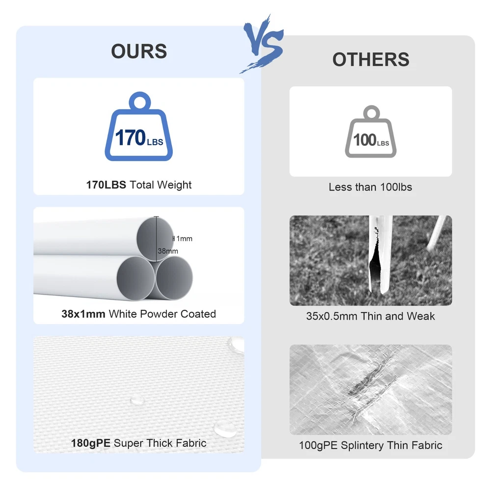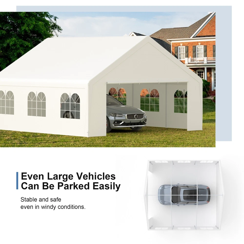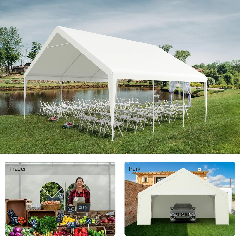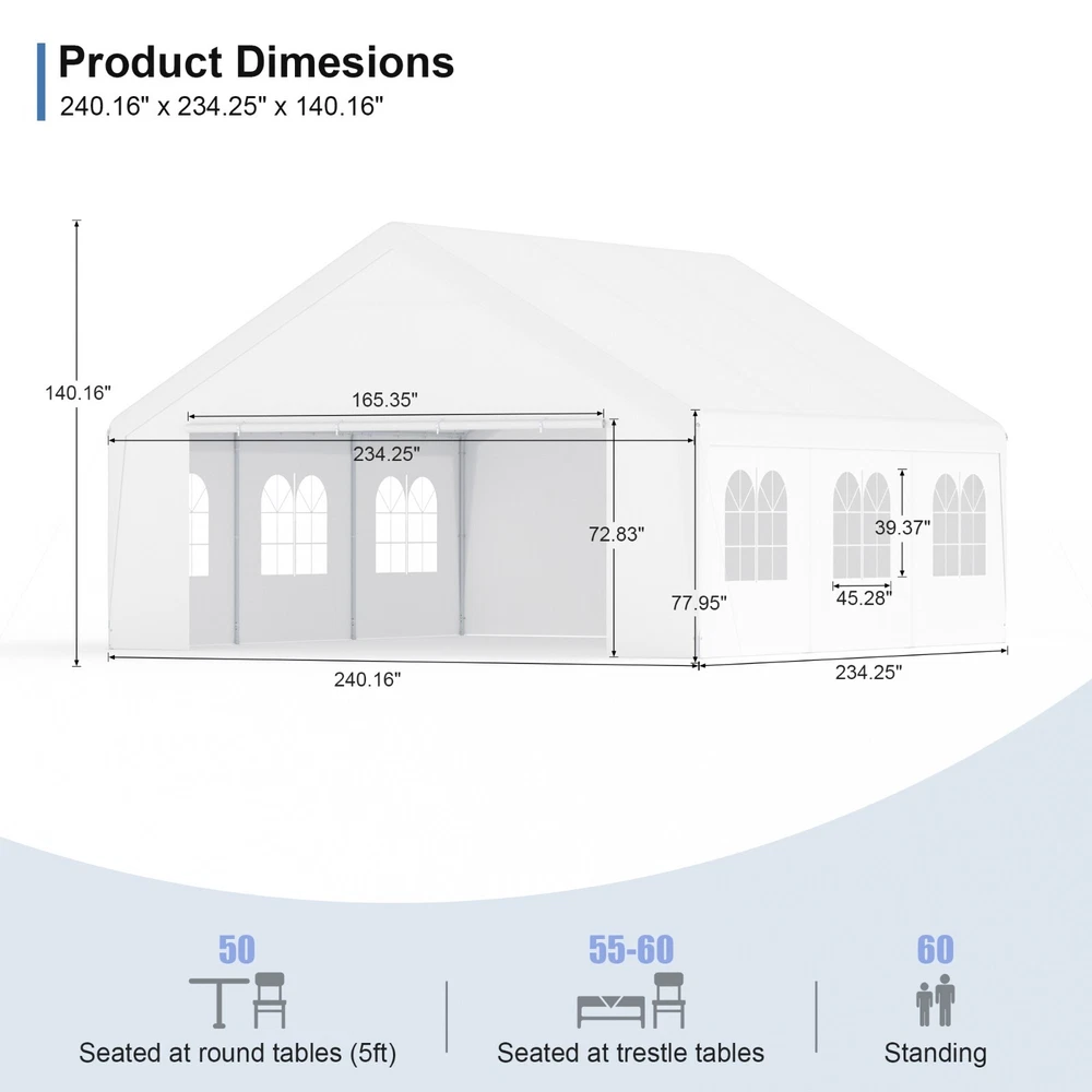 FEATURES: • Heavy-duty structure: High quality trust&corrosion resistant white powder coated steel frame with compression lock, more secure and stable. • Super large field: 20X19.5FT large space allows you to give more play to the site layout. • Weather resistant: Heavy-duty 180g PE top , waterproof, with UV protection. • Humanized design: The windows will not make you feel depressed when you stay inside. People outside can also see the situation inside. • Versatility of use: It is applicable to various occasions, such as commercial, business, party tent, wedding tent, etc. • Easy to install: Complete accessories and detailed installation instructions are provided for you to get started quickly. • NOTE: Please avoid using in harsh weather conditions and avoid irreversible damage to the product. • NOTE: Ships and arrives in 2 separate boxes. Delivery times may vary per box. Please contact after-sales service for any problems,and we will reply within 24 hours. SPECIFICATIONS: • Color: White • Material : Powder Coated Steel & 180g PE • Pipe Size: Φ38mm, thickness 1 mm • Connector Size: Φ42mm, thickness 1.2 mm • Overall: 20' W x 19.5' D x 11.7' H • Overall Product Weight: 170 lb. • Roof Hanging Weight Capacity: 5 lb. ITEM INCLUDED: Assembly Instructions, Base, Connector, Hardware, Ropes, Stakes .