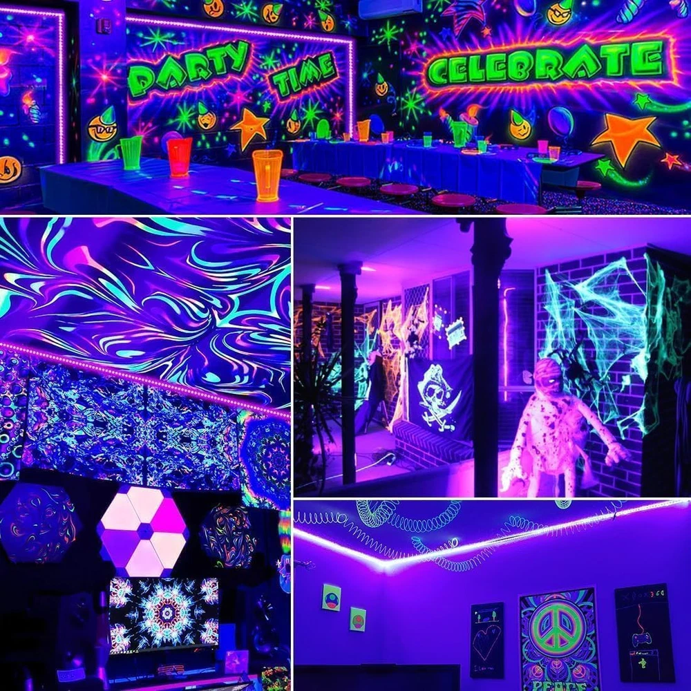Absolutely love how versatile this black light strip is! The remote makes it super easy to switch between modes and adjust brightness. It's flexible enough to bend into any shape and creates a fantastic glow for parties or decor. Safe, low heat, and super fun to use!