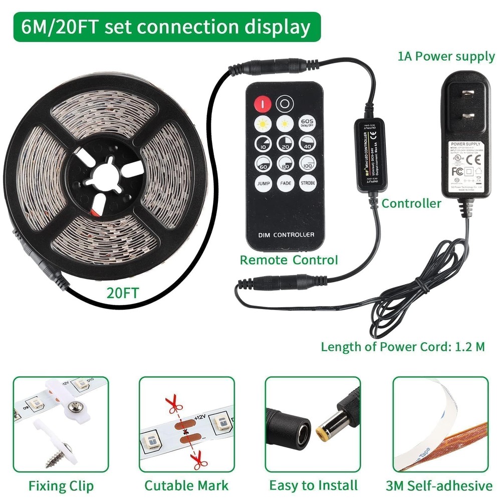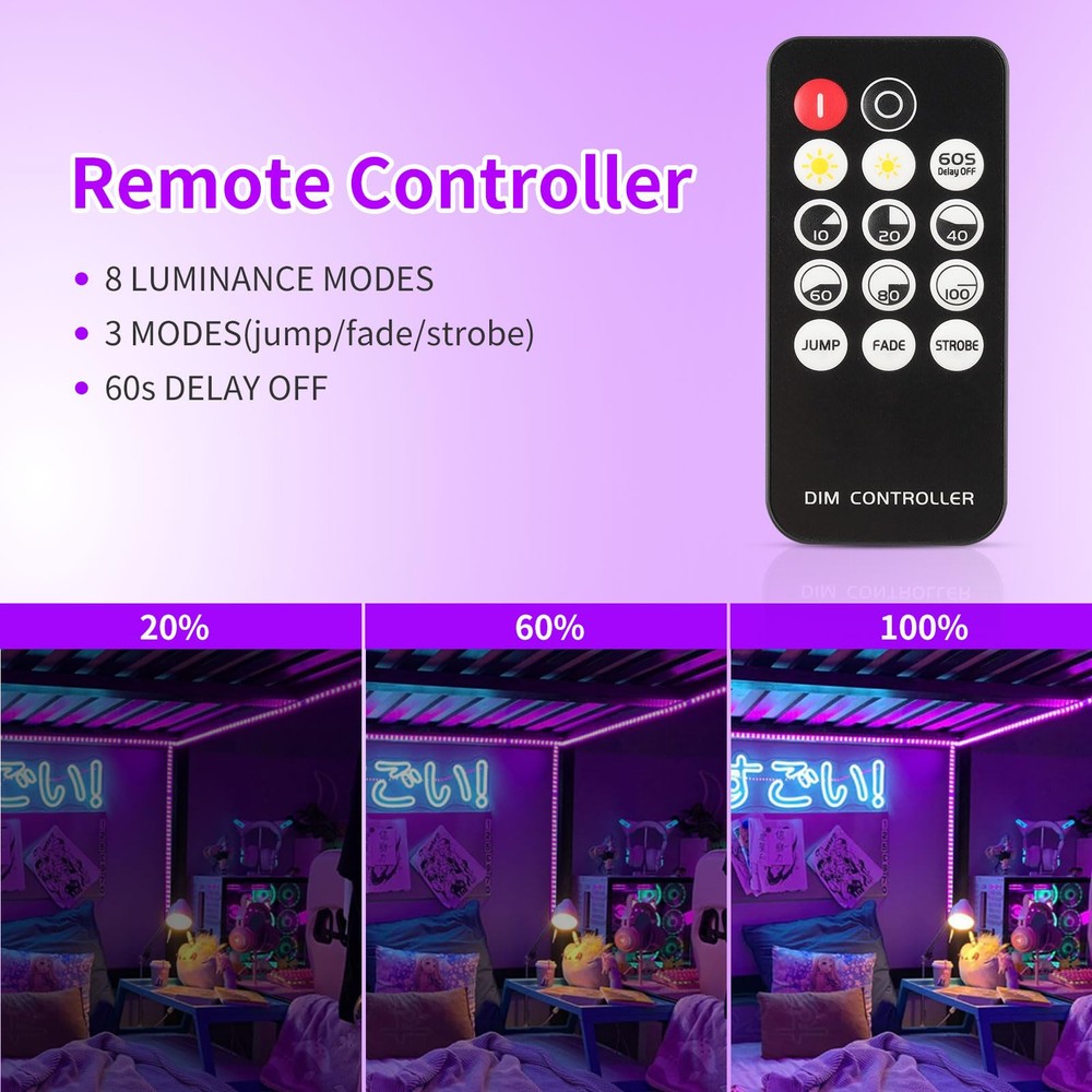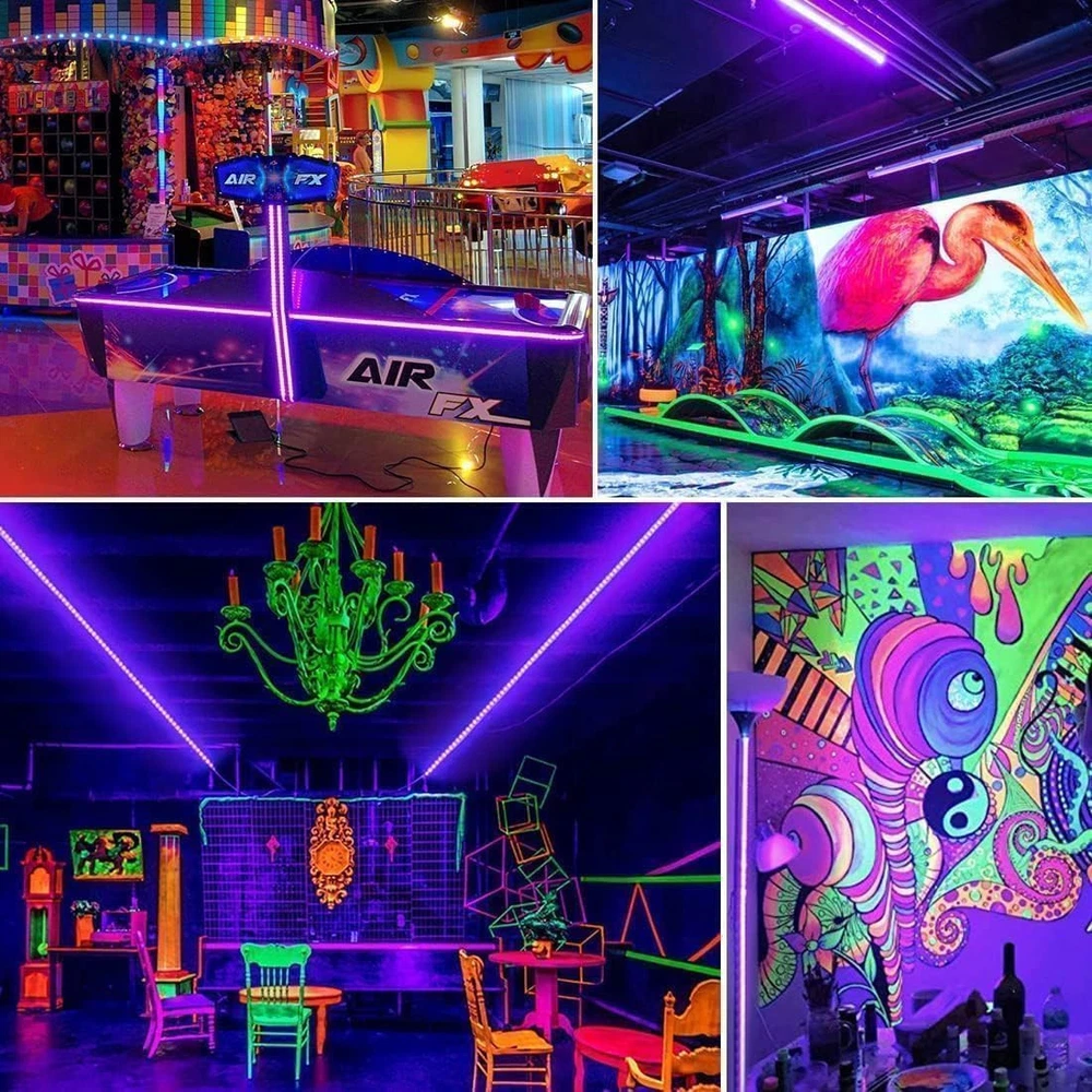 Adjustable Brightness: The black light bar has a remote control with 3 functions including brightness adjustment for versatile usage. 3 Light Modes: The light bar provides 3 lighting modes (JUMP, FADE, STROBE) to suit different occasions. Safe and Easy to Use: The black light has a 12V voltage, low heat, and harmless wavelength of 385-400nm for indoor use. Flexible Design: The 20ft black light bar is easy to bend and fold to create desired shapes and can be cut without damaging the strip. Versatile Applications: The black light can be used for indoor decoration, lighting projects, and various commercial and home purposes.