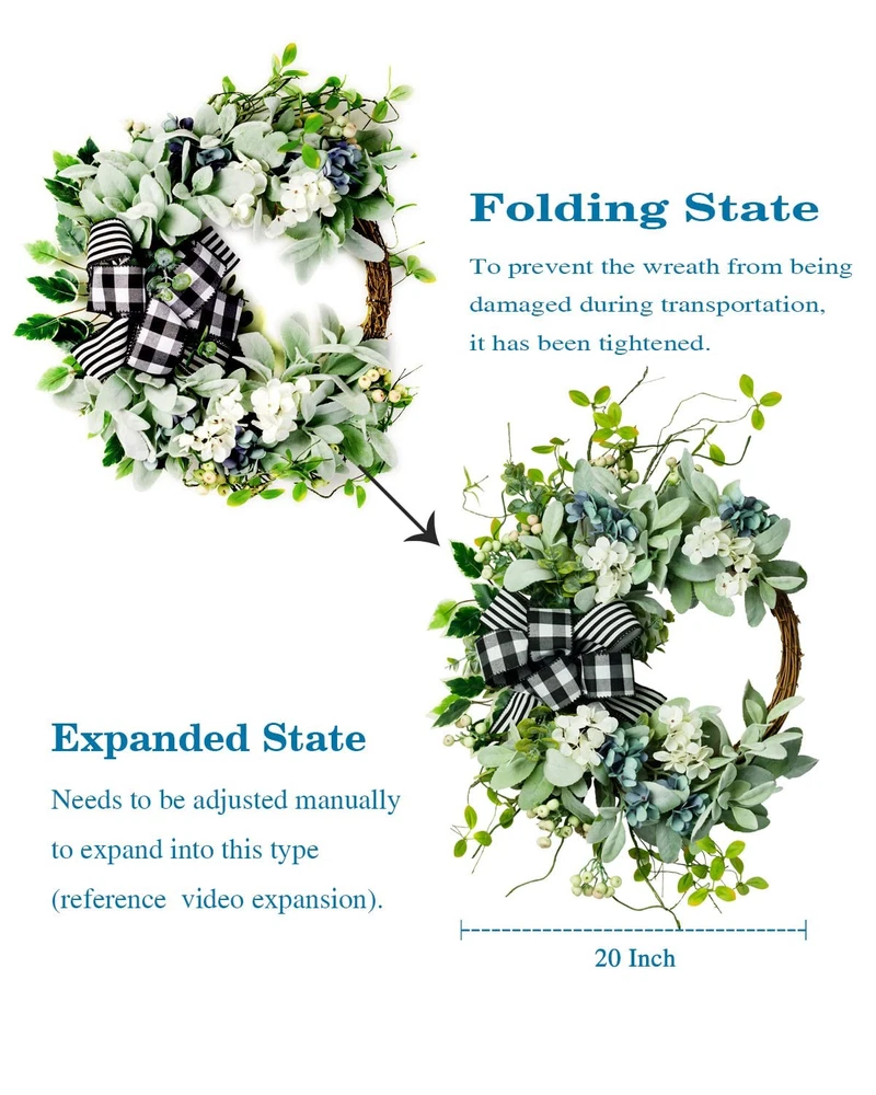 WE WALKED ALL THE WAY JUST TO MEET YOU Our wreaths are designed by professional designers, wreath creates a romantic look that makes for a wonderful style, high-quality floral materials, and are handcrafted The wreath will never wither: in order to use the garland better, please avoid direct sunlight and rain Handmade: Please allow small errors Excellent after-sale service: If you have any problem after receiving the garland, please , we will solve it in time. Your satisfaction is our greatest wish! Wreaths for Front Door: This lamb’s ear wreath is perfect for year-round decor on your front door or in your home. Unique half-covered design, the neutrality of this wreath and the farmhouse-inspired bow make it easy to incorporate into nearly any decor scheme Farmhouse Wreath Year Round: The Green wreath is handmade from almost natural berries, branches, hydrangea and green leaves, and there is a rattan ring on the back for fixing. Perfect interpretation of the beauty of nature Front Door Wreath for All Seasons: The wreath can be used indoors or outdoors. It can be hung on the front door, living room, fireplace, cabinet, wall, window, shelf and other places you like. If used outdoors, keep out of direct sunlight and rain Artificial Wreaths for Outdoor: Our year-round wreaths are handmade by experienced workers and come in a nice gift box, with seamless hooks, which is convenient for dear customers to send gifts and save Front Door Decor: The wreath is about 20-22 inches, to prevent the wreath from being damaged during transportation, it has been tightened, lambs ear leaves can be bent, and you can adjust and expand the wreath by referring to the video