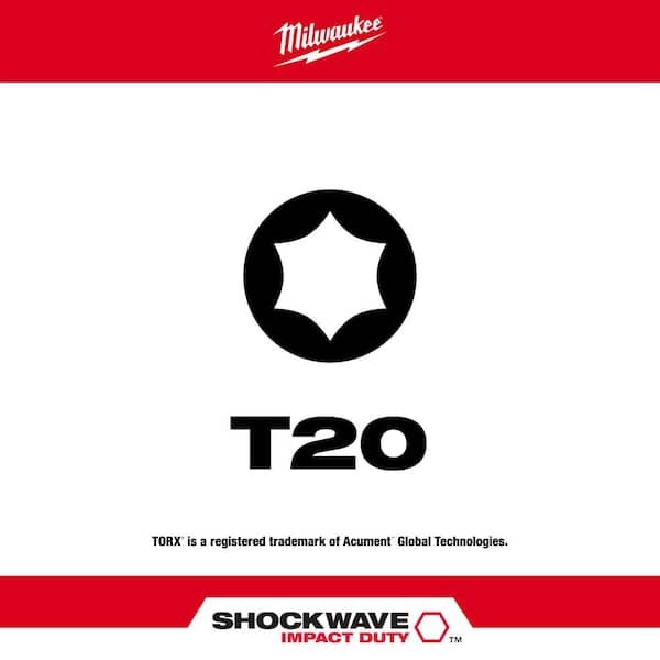 The MILWAUKEE SHOCKWAVE Torx #20 2" Impact Duty Steel Screwdriver Bits are engineered to be the Most Durable, Best Fitting driver bits on the market. The Wear Guard Tip delivers increased wear resistance which protects the fit over the life of the bit. The Shockzone is optimized for for each tip type and length of driver bit to absorb peak torque and prevent breaking. The Custom Alloy76 has a customized steel and heat treatment per tip type to extend the life of the driver bits, providing up to 50X life vs. competitive impact driver bits. The SHOCKWAVE driver bits are built to deliver extreme durability for the most demanding applications.