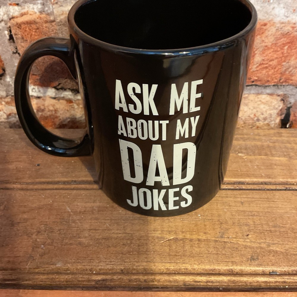 Sip your morning brew in style with the "Ask Me About My Dad Jokes" Coffee Mug, a playful addition to any kitchen or coffee nook. Made by Primitives By Kathy, this mug features a witty White Lettering on a Black background that's sure to spark a conversation among friends and family. The mug has a 20-ounce capacity, perfect for your favorite hot beverage, be it coffee, tea, or hot chocolate. Its sturdy construction ensures that your drinks maintain their temperature while you enjoy the humor it brings to the table. Good in the Microwave and Dishwasher Add a touch of humor to your daily routine with this charming and functional mug.
