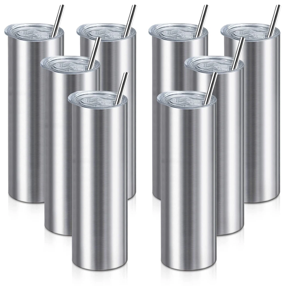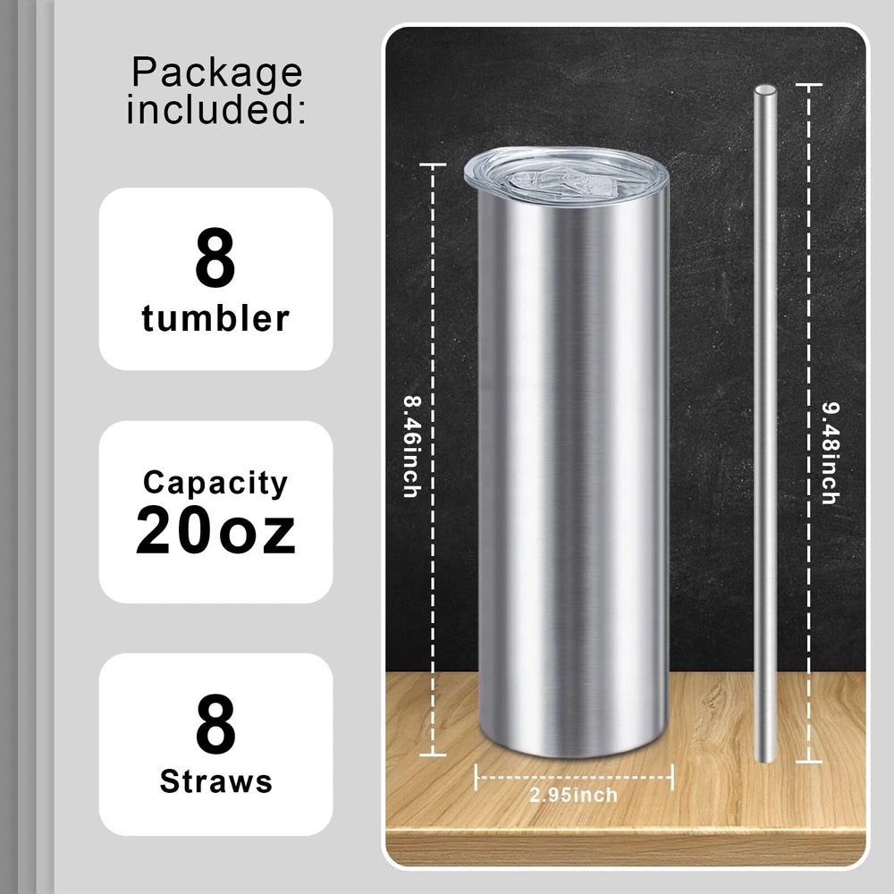 20oz Straight Skinny Tumblers Bulk,Stainless Steel Tumbler with Straw,8 Pack Double Wall Slim Insulated Tumbler for Travel,Coffee,Tea, Beverages,Diy Gift For Men Women Friends(Silver) Description: Features: VACUUM INSULATIONXccMe stainless steel tumbler adopts double-walled vacuum technology that can keep your on-the-go beverages hot for 6+ hours or cold for 12+ hours HIGH QUALITY:These 20oz skinny stainless steel tumblers are made of high-grade 18/8 Food Grade Stainless Steel,boast anti-rust,lead free stainless steel and easy wash allowing for multi-season use! PERSONALISE:The slim and straight tumbler shape design is very suitable for decals and resin craft.It is very suitable as gift for bridesmaids,bachelor parties and birthday parties. BPA FREE LID:The eco-friendly lid is completely BPA free, silica gasket seals to achieve maximum spill proof capability. The splash proof sliding cover is straw friendly. APPLICATIONS:It is very great for your daily commute, as well as the office, the beach, pool, outdoor sporting events, tailgate parties, and camping.Moreover it is a good choice for gift. Product Details: Brand: XccMe Color: Silver 8pack Special Feature: Leak Proof Style: Personal customization Theme: Food Brand: XccMe Color: Silver 8pack Special Feature: Leak Proof Style: Personal customization Theme: Food Recommended Uses For Product: Travel, Home Included Components: Lid Straws Specific Uses For Product: Hot/Cold Drinks Shape: tumbler Pattern: Solid Product Care Instructions: Dishwasher Safe Age Range (Description): Adult Material Feature: Insulated Reusability: Reusable Unit Count: 8.0 Count Product Dimensions: 6"W x 0.5"H Material Type Free: BPA Free Number of Items: 8 Package Type: Standard Packaging Finish Type: Glossy Manufacturer: XccMe UPC: 783103778976 Item Weight: 11.8 ounces Country of Origin: China Date First Available: April 6, 2020 On Nov 20, 2024 at 21:12:33 PST, seller added the following information: