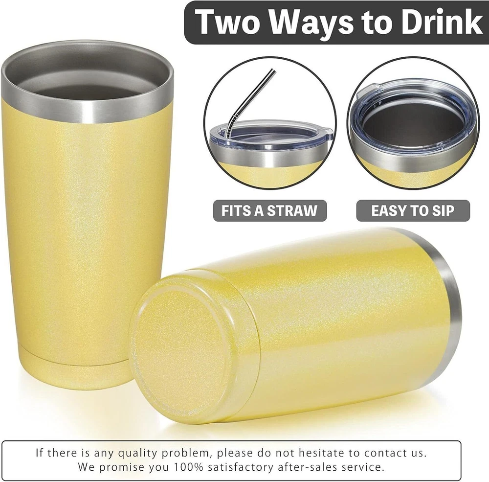 About this item DOUBLE WALL VACUUM INSULATION: Enjoy Beverage Cold or Hot Under normal temperature, it can keep a tumbler of ice cake for 12h until the ice totally melt, or hot coffee warm for 6h DURABILITY- 18/8 food grade stainless steel body, No BPA, healthier than plastic cup. The insulated tumbler never sweat due to the Vacuum insulated design. Powder coating on the outside fits more comfortably in your hand, looks good, anti-slip APPLICABLE TO VARIOUS OCCASIONS - MEWAY vacuum travel tumbler great for outdoor adventure, road trips, sports event, also the perfect travel cup to bring coffee from home to work or fill a tumbler of drink before you go to bed to drink through the night EASY CLEANING: hand washing is recommended, electro-polished interior doesn't transfer flavor & no metal aftertaste, you don't have to worry about your morning coffee or afternoon teas being ruined [Package included]12*20 oz glitter tumbler,12*splash proof cover with hole, 12*straight steel straw, 12*bend steel straw,6*cup brush,6*straw brush Color Rainbow Yellow Special Feature Manual Style HU-XI-201 Theme Food Recommended Uses For Product Travel Occasion Party Included Components Cups Specific Uses For Product Cold Drinks, Hot Drinks Shape Tumblers Pattern Solid Product Care Instructions Machine Wash, Hand Wash Only Material Feature Insulated Reusability Reusable Unit Count 12 Count Product Dimensions 3"W x 6"H