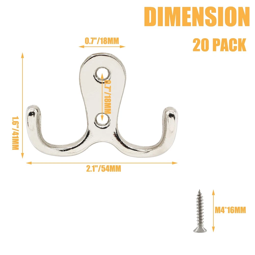 Modern coat hooks are compact and decorative for screwing on installation in the bathroom, bedroom and office. Double hooks for hanging caps, hats, towels, clothes, keys, bags and etc. Wall hooks for hanging heavy duty are easy to install by screwing on the wall, closet, wooden board directly. Specifications: Size: 1.6" x 2.1"/41mm x 54mm(L*W) Mounting Hole Spacing: 0.7"/18mm Wall Mounted Width: 0.7"/18mm Screws Included: M4*16mm Style: Double Pronged, 2 Mounting Holes Material: Zinc Alloy Color: Brushed Nickel Quantity: 20 Pieces Note: Due to manual measurement, please allow a deviation of 1 - 2mm. Please check our product size carefully and read the product size descriptions before purchasing to avoid possible unpleasant shopping experience. Package Included: 20 x Brushed Nickel Coat Hooks, with M4*16mm mounting screws. Size: 1.6" x 2.1"/41mm x 54mm(L*W), Mounting Hole Spacing: 0.7"/18mm. Heavy Duty Coat Hooks: Made of solid zinc alloy, the wall mounted coat hooks are rustproof, corrosion resistant and durable, with strong bearing capacity up to 35lbs. Double Wall Hook: Designed with double pronged hooks for hanging, the wall mounted hooks for hanging are perfect for storage in bedroom, bathroom, living room, kitchen and closet. Easy to Install: Screw in coat hooks for wood are easy to install with wall mounting screws. Directly screwing the wall hooks on the closet, door for hanging coat, towel, clothing and etc. Satisfaction Oriented: If you don't absolutely love them let us know and we will strive to improve your shopping experience! We are so confident you will love our products.