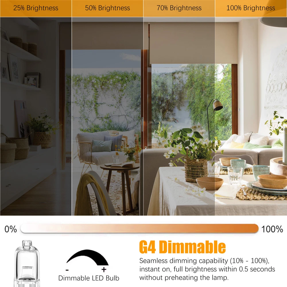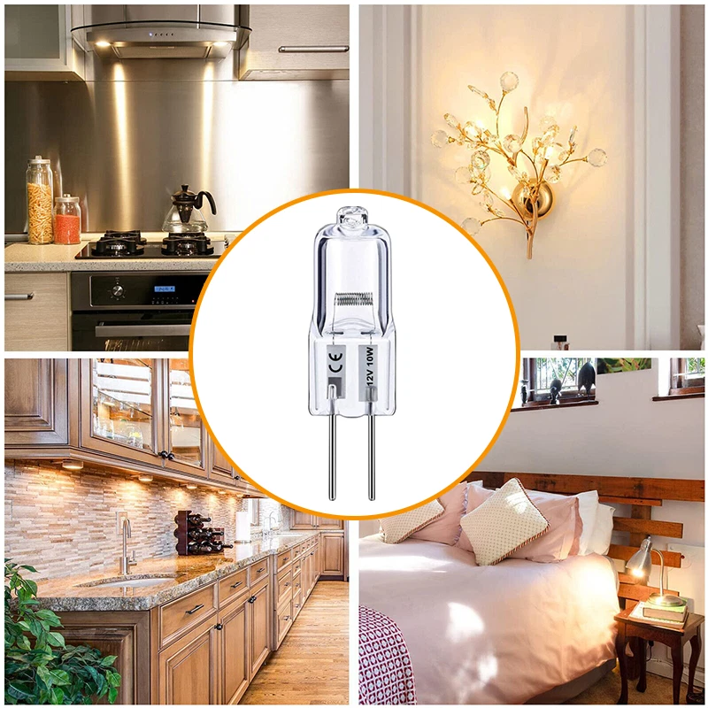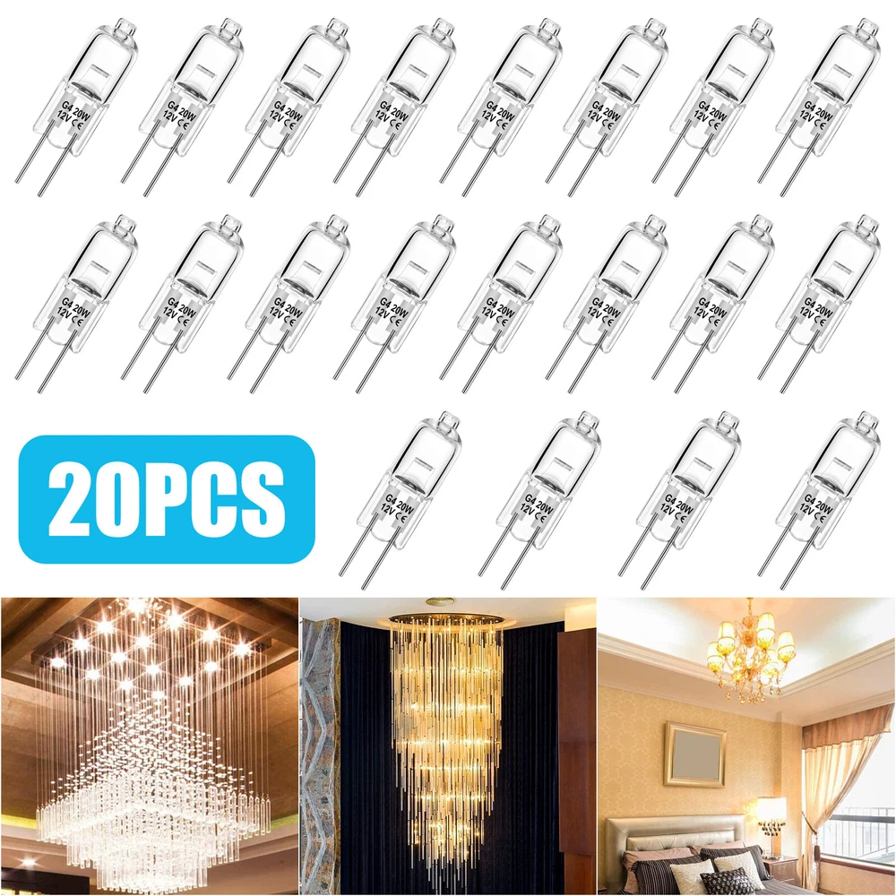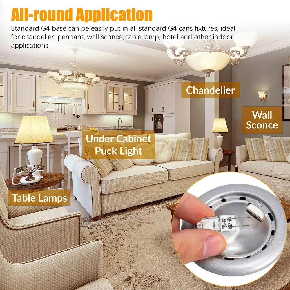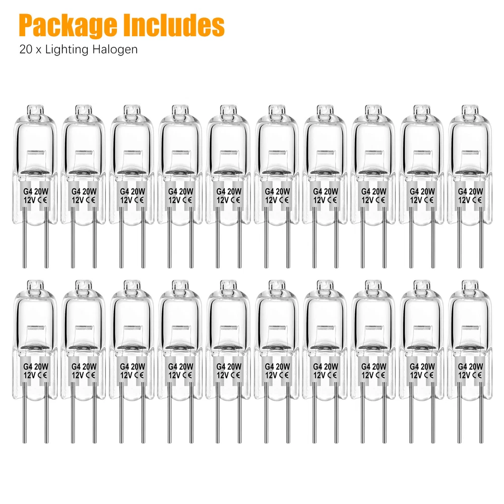 Product Feature 【Long Lasting Lifetime】 : G4 12v 20w light bulbs, made of high-quality tungsten filaments, enjoy 2,500 hours lifespan, this G4 bulb can switch on and off about 6000 times, saving you the cost of frequent bulb replacement. No lead or mercury, No UV or IR Radiation, Safe for you and your family. 【Excellent Performance】 : High output 300 lumen, 2800K bright warm white, CRI100. G4 bulb 12v 20w brings you warm lighting conditions like sunlight. The CRI up to 100 can restore the real color of the object, G4 light bulb makes the place where the light touches look more colorful. 【G4 Dimmable & Ins tant on】: T3 G4 bulb, seamless dimming capability (10% - 100%) suitable for any atmosphere or decoration. Instant on, this halogen G4 12v 20w can achieve maximum brightness in 0.5 seconds without preheating the bulb. 【360° All-around Lighting】: 360° all around lighting, no blind corner or shadow, the G4 light provides you with a wider and clearer lighting experience. Standard G4 base can be easily put in all standard G4 cans fixtures, ideal for chandelier, pendant, wall sconce, table lamp, hotel and other indoor applications. Product Specification Voltage 12V Wattage 20W Lumen 300lm CCT 2800K Warm White Shape T3 Tubular JC Lifetime 2500 hours Dimmable Yes Base G4 bi-pin with 4mm pin distance Package Included 20 x Light Bulbs