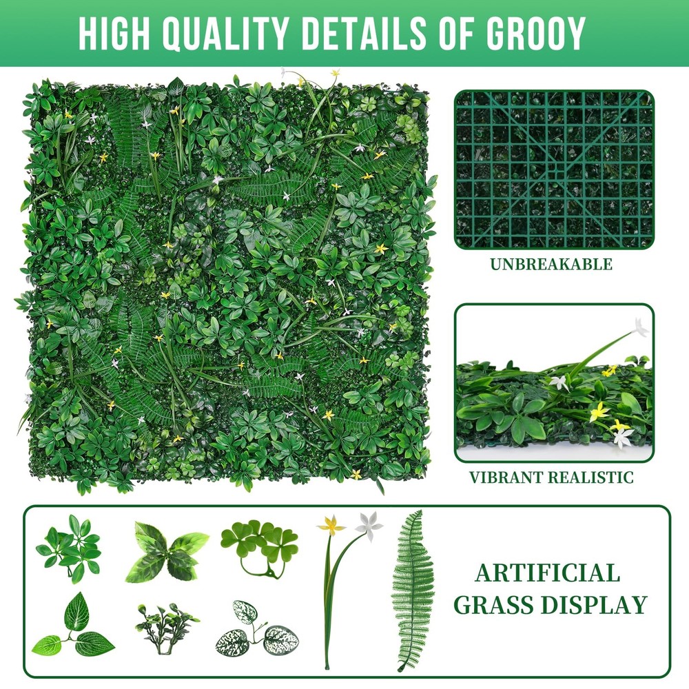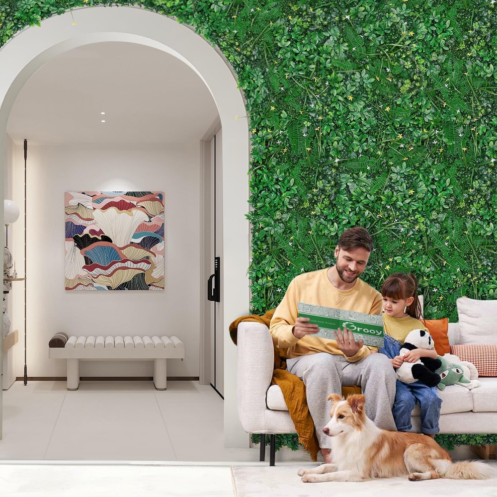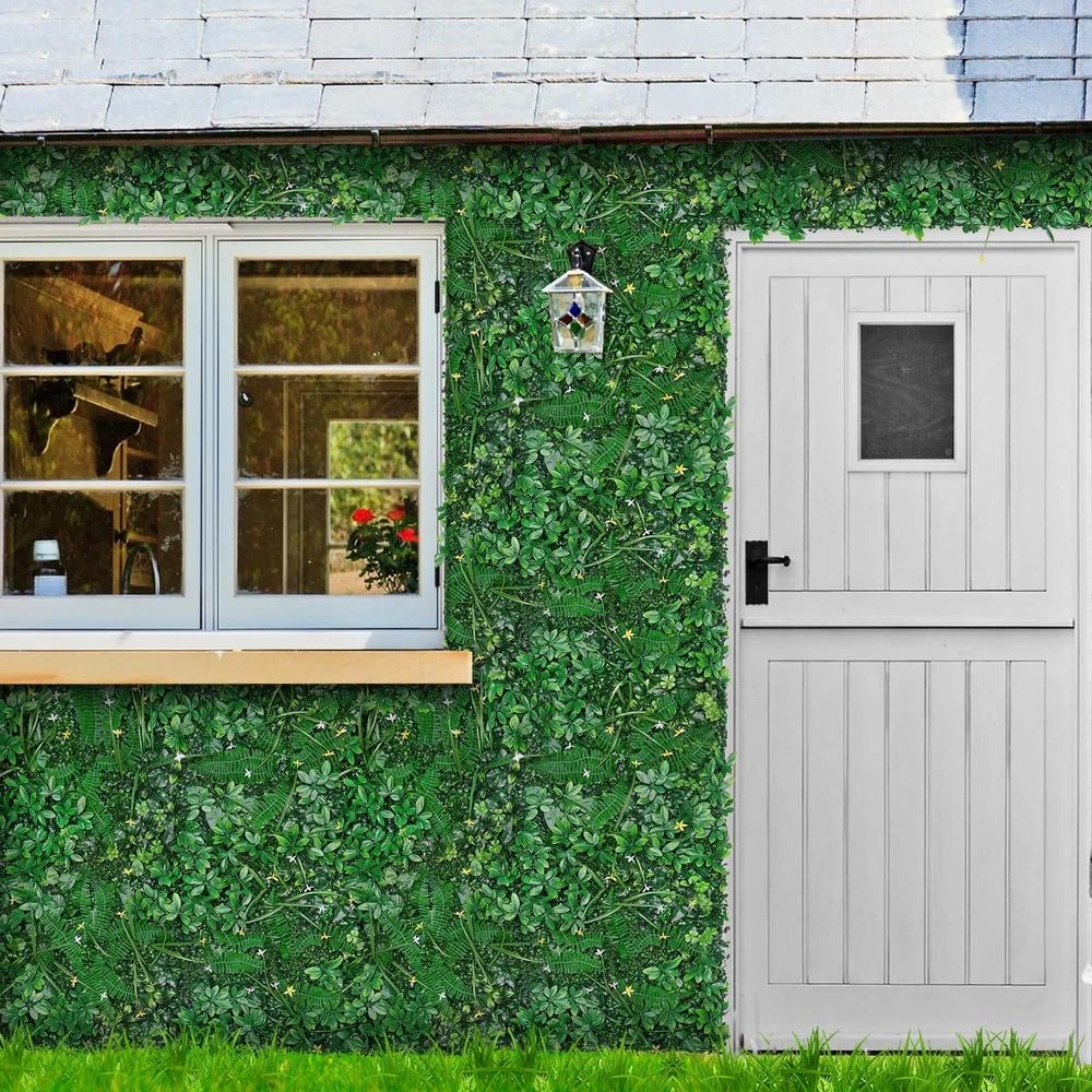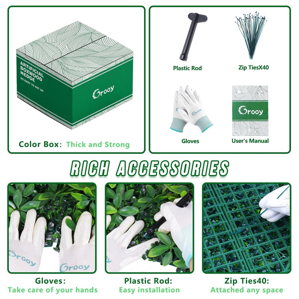 The boxwood panels, greenery wall backdrop, fake grass wall, grass wall decor, privacy fence panels, outdoor privacy wall panels, artificial wall greenery decor, boast a remarkable combination of safety. These artificial green walls can be effortlessly installed in any desired location within a short timeframe, eliminating the need for watering, trimming, or cleaning. Moreover, the grass wall panels maintain an immaculate shape and vibrant color throughout their entire lifespan. This artificial grass serves as a thoughtful means of establishing a barrier, ensuring enhanced privacy. Each fence panel can be easily customized into any desired shape using scissors, allowing for versatile applications. Setting up a photo backdrop for various occasions such as birthdays, parties. Beyond their aesthetic appeal, artificial green wall decor can serve multiple purposes, including creating living walls, providing visually engaging backgrounds, or concealing structures that may not seamlessly integrate into your design. Exterior applications extend to patios, porches, privacy screens, wooden fencing, yards, even stage backdrops. On the interior front, these green backdrop grass panels find their place in balconies, living rooms, study areas, terraces, bathrooms, office workspaces, and reception desks, among other spaces. 🌿【No Sparse, Unique Design, Realistic】Even indoors, one can feel the connection to nature. Our fake grass wall panels provides an authentic and dense privacy hedge panels without any visible gaps. The realistic appearance of these decorative artificial grass panels adds a unique touch to your space. 🌿【Premium Greenery, Built to Last】Artificial Boxwood Hedge Panels are made tough, using the latest in High-Density Polyethylene (HDPE). No matter the blazing sun or stormy weather, they'll stay vibrant and lifelike, adding a touch of nature that lasts. 🌿【Easy Assembly & Customization】Each pack includes 16 pieces (20”x20”) with 40 zip ties, gloves, a plastic rod, and an installation guide for a quick and easy setup. No DIY skills needed. Customize panels effortlessly with basic cuts and shapes. Secure them using zip ties or drill for tougher surfaces. 🌿【Versatile, Inside and Out】These artificial wall grass panels are versatile and suitable for both indoor and outdoor spaces. Perfect for porches, patios, backyards, living rooms, balconies, or office workspaces, they elevate the aesthetic appeal of any environment. 🌿【Certified Safety and Warranty】's Greenery Grass Wall are SGS-certified, meeting stringent safety standards for homes, gardens, and businesses. UV-tested for lasting quality, thus the artificial grass backdrop can be used outdoors and no fade. 🌿【Friendly Reminder】Shipping may temporarily affect the leaves, resulting in sparse areas on the panel. After 1 or 2 days of rest, the leaves will regain their natural appearance. Gently combing the leaves before installation ensures a more natural look.