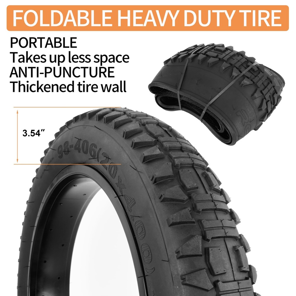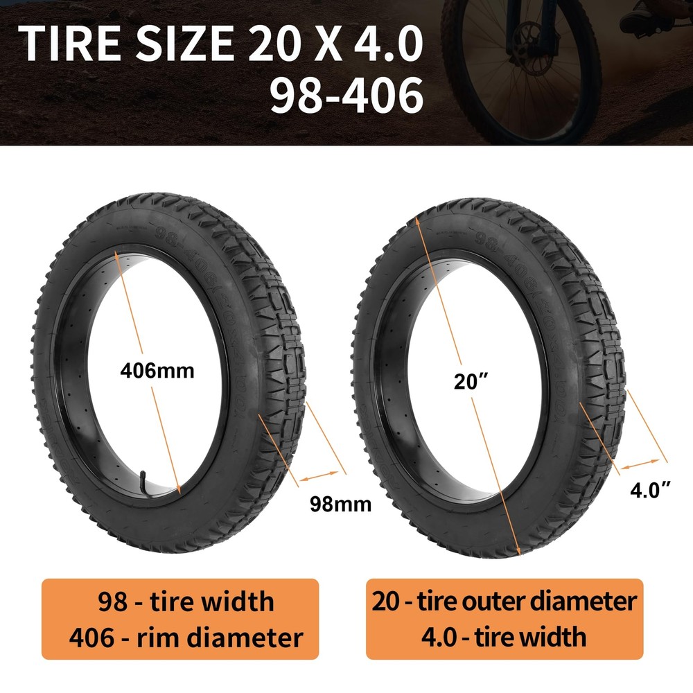 Heavy Duty 20x4 98-406 E-Bike Fat Tires, High-Performance Wear-Resistant 20X4.0 Fat Tire and Tube Sets for 20 Inch E-Bike Mountain Snow Bike Tire - 2Pack 20X4.0 (98-406) E-BIKE FAT TIRE - These 20X4 fat bike tires are not only suitable for e-bikes but also for mountain bikes, snowmobiles and other types of bikes. Note: Please check the details and size carefully before purchase HEAVY DUTY FOR ULTIMATE DURABILITY - Each heavy-duty 20 inch fat bike tire is made of high-quality rubber and puncture-resistant technology, with a thick tread depth of 4mm to help prevent road debris from puncturing the tire; the 20x4-inch all-terrain fat tire handles every ride with ease EASY TO HANDLE ALL KINDS OF RIDING SURFACES - The unique tread design of this 20X4 fat tire allows the rider to travel freely through forests, mountains, beaches, deserts, gravel and other rugged surfaces. Combines the high performance of off-road cornering and stability on dirt roads with the smoothness of street driving WIDE RANGE OF PRACTICAL ACCESSORIES - The 20x4 Rim Tape is used between rim and tube to perfectly protect the tube of the bike; These two tire levers have high toughness and sufficient elasticity enough to allow you to quickly maintain your tires; Beautiful aluminum alloy inflatable valve cover prevents dirt and dust from entering the tube AFTER-SALES SERVICE - If you have any questions about the quality of the product we provide you with 1 year service, in order to provide you with better service and satisfied with the product you can contact us in time; you need to provide relevant pictures and information so that we can quickly reply! AFTER-SALES SERVICE - If you have any questions about the quality of the product we provide you with 1 year service, in order to provide you with better service and satisfied with the product you can contact us in time; you need to provide relevant pictures and information so that we can quickly reply! Shipping We offer FREE shipping on all orders! We ship within Three business days of payment, usually sooner. We use a selection of shipping services such as UPS, FedEx, USPS etc. We only ship to the lower 48 states, no APO/FPO addresses or PO Boxes allowed. Local pickups and combined shipping options are not provided at this time. Return You can return a product for up to 30 days from the date you purchased it. Any product you return must be in the same condition you received it and in the original packaging. Please keep the receipt. Payment We accept payment by any of the following methods: PayPal Please pay as soon as possible after winning an auction, as that will allow us to post your item to you sooner! Feedback Customer satisfaction is very important to us. If you have any problem with your order, please contact us and we will do our best to make you satisfied. Contact Us If you have any queries, please contact us via ebay. We usually respond within 24 hours on weekdays. Please visit our eBay store to check out other items for sale! Thank you for shopping at our store.