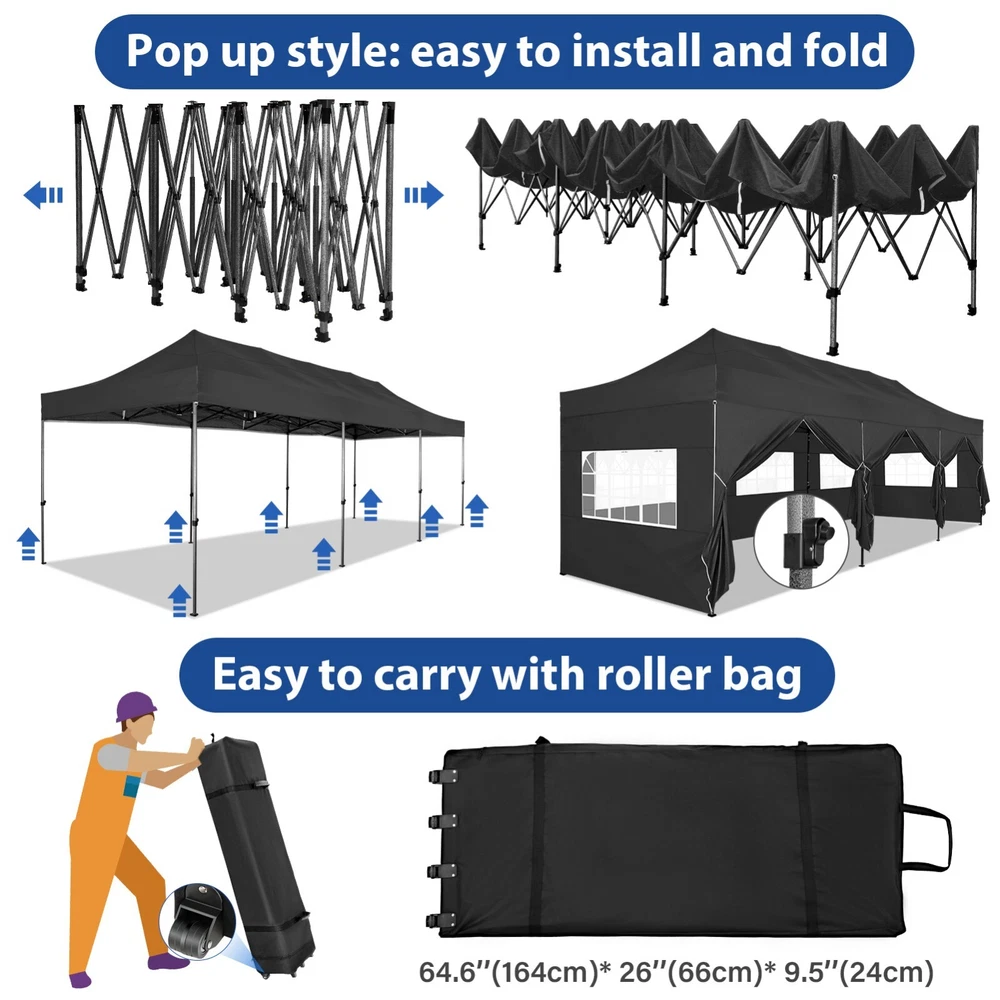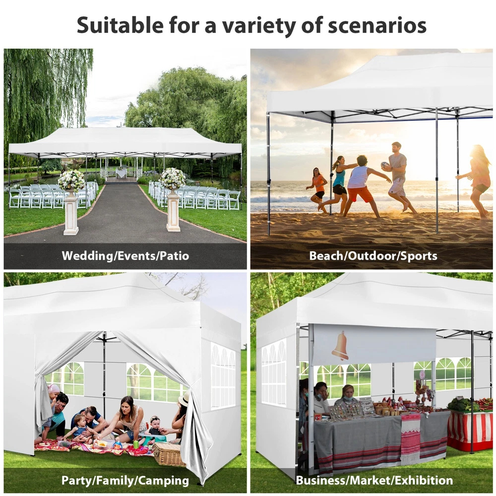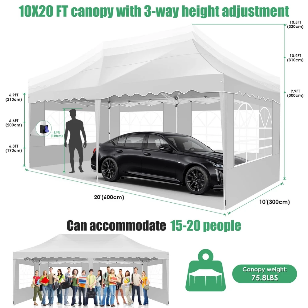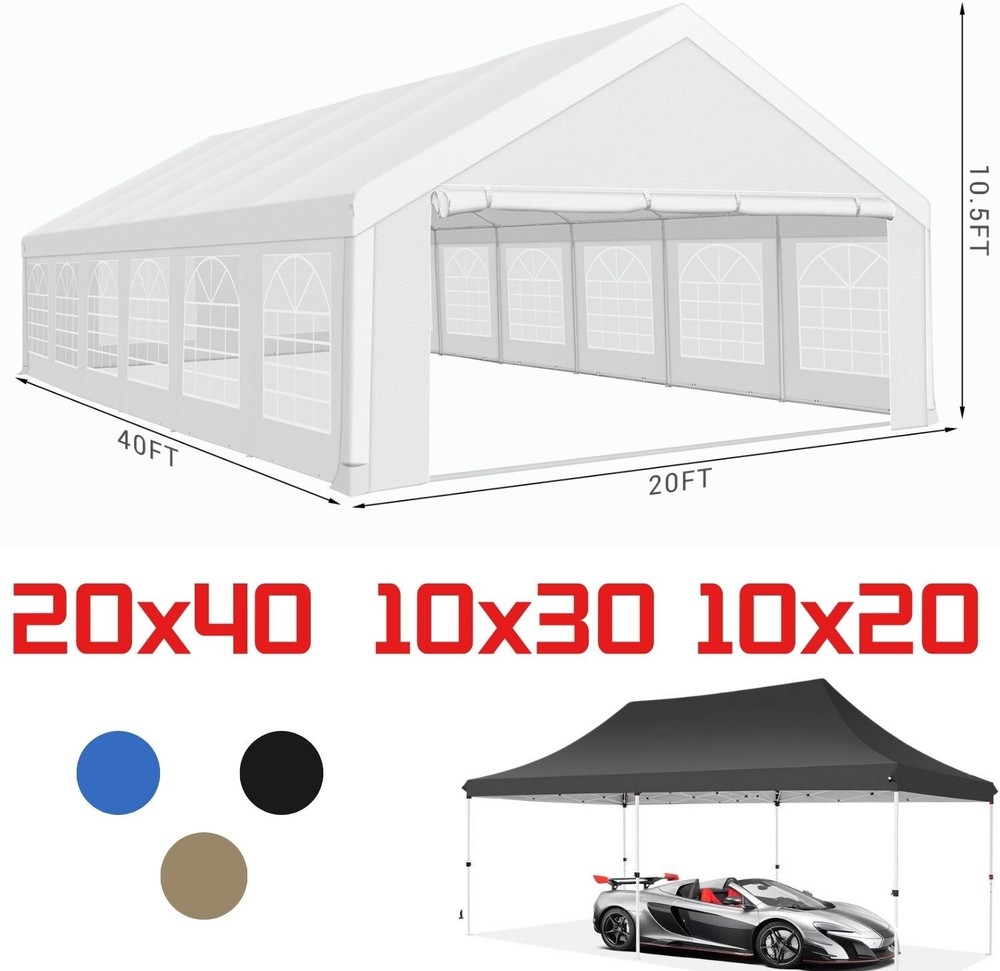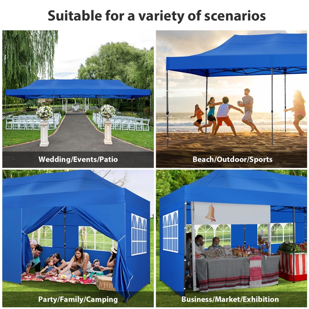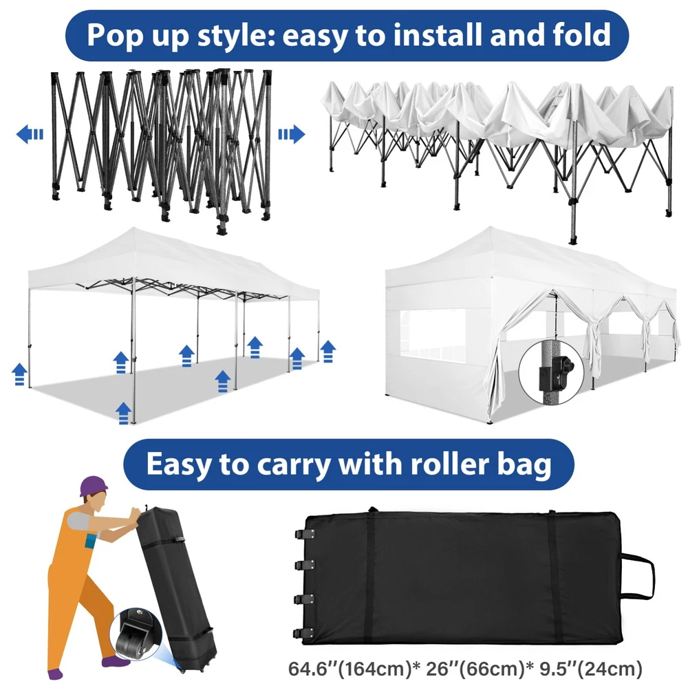 Description Heavy Duty 20x40 Event Tent Large Shelter with Removable Sidewalls, Carpas para Fiestas Commercial Outdoor Canopy Wedding Tent Carport, UV 50+, Waterproof About this item 💐 【 Heavy duty Structure & Closed Extra Ground Bars 】party tents 20x40 made from 1.5inch diameter all metal tube frame with elegant white paint coating, preventing chipping, peeling, rust, and corrosion. The stable triangular roof and closed ground link structure make the product more stable and less likely to shake than similar models on the market. Pegs and wind ropes, to make the event tents much safer and more stable. (Please do not use it when the wind is strong). 💐【 20x40 FT Extra Large Size & Versatile Usage 】20x40 tent can hold up to an estimated 50 people for for parties, or weddings, and can also be used as a carport or outdoor storage tent. Straight leg design and cathedral style roof offers an open-air feel for a variety of outdoor activities. Great for tent party, outdoor events, outdoor shelter. 💐【 All Season Tarp & Cathedral Windows 】 This heavy duty party tent top cover is made of heat-sealed, triple-layer 160g polyethylene fabric can Block 99% of Harmful UV Rays, which is waterproof and windproof, rainproof, dustproof and anti-snow, tear resistant etc. Waterproof PVC cathedral windows on the sides provide the tent with bright light and a good view. 💐【 Removable Sidewalls & Excellent Ventilation 】Our wedding tents Comes With 6 removable sidewalls with 12 PVC church windows and 2 zipper doors with windows. The number of the sidewall can be installed freely as needed. Roll-up zipper door and detachable sidewalls for even better ventilation, providing cross ventilation and venting on hot days. Also provides warmth on cold days. 💐【 Easy to Assemble & Warranty 】This waterproof outdoor wedding gazebo does not require additional installation tools. Connectiong with spring bottom simple and easy to use for quick installation. Any problem with any part, you can contact our customer service, we continue to provide you with after-sales service. Please note that this party tent is NOT FIREPROOF, so please keep it away from any fire source. Specifications: Color: White Size:20×40×10.5ft Product Weight: 300lb Weight Bearing: 2000lbs Waterproof: 100% Waterproof Sun Protection Index: UPF 50+ Cover Material: 160g PE Cloth Frame Material: Heavy Duty Metal Wide Usage: Perfect for Parties, Wedding, Camping, Storage, Shelter, marketing events, etc . Party Tent Size 20'X40' Roof style & Canopy material Peak Style Roof & Heat-sealed Triple-layer PE Tarp, Waterproof, UV protection and Tear resistant Pole material Elegant White Painted Steel Pipe, diameter 38mm, thickness 1.0mm, preventing chipping, peeling, rust, and corrosion. Sidewalls 6 Detachable Window Panels with 12 PVC Church Windows; and 2 Detachable Door Panels With Roll- up Zipper Door & 4 PVC Church Windows Party Tent Height 11.5FT to the top, 6.6FTto the edge; Window size: 4.3*4.7FT Note This party tent is NOT FIREPROOF, please stay away from the fire source. More Stability Art-welded Tube Connector; Elastic ball strap fasten the canopy to the frame; Pegs and wind ropes; Weight bags at the four corners of the canopy can add stability Variety Of Applications Perfect for Outdoor Patio Event Parties, Commercial Business Exhibition, Outdoor Wedding Parties, Storage tent, Carport, and so on. For Carport For Commercial Exhibition For Storage Tent For Wedding Tent 10'x30' / 8 Sidewalls 3 x 9m Pop Up Canopy Commercial Tent Eight Sides Three Doors Waterproof Tent Sun Shelter ✨About this item 🌟【Heavy Duty Upgraded Frame】The frame of 10x30 Pop Up Canopy Tent is commercial grade full truss construction made of durable powder coated stainless steel. 32mm/1.26 inch widened pipe diameter, 0.7mm/0.03 inch thickened wall thickness, Stronger and more stable than other normal gazebos on the market. The middle support pole structure can hold up to 220 lbs on a single pole and can withstand up to level 4 wind (18mph), using the included sandbags, ropes and nails for increased carport stability. 🌟【Best Quality Fabric and Sidewalls】10x30 Heavy duty canopy tent is made of 420D Oxford cloth with two layers of PU coating, UPF 50+, blocks 99% of UV rays. Heat-sealed seam technology is used, 100% waterproof, 1500mm waterproof pressure, waterproof effect is better than other general tents. 8 PU coated sidewalls connected by a whole strip of velcro and zipper to attach to the frame top and legs for securing, removable, you can install as many sidewalls as you want, convenient and practical. 🌟【Easy Set up, 3 Adjustable Heights】2-4 people can easily set up and take down 10x20 outdoor party tent canopy in minutes without tools, it can easily accommodate 20-25 people. Just remove the fully assembled frame and top from bag, place fabric over frame, stretch legs, and you're done. Wedding tent gazebo is available in 3 different heights (86.6'', 90.5'', 94.5'') for your choice to ensure adequate headspace. Best thumb latch system is easy to lock and release without pinching your fingers. 🌟【Portable 4 Wheels Roller Bag】Since 10x30 heavy duty pop up canopy tent with sidewalls has a weight of 136 lbs, we offer you a solid and durable 600D Oxford cloth PVC coated roller bag. It has 4 large wheels for standing feet and reinforced handle for easy movement and transportation. Tents for parties, weddings, BBQ, trade shows, sporting events, disaster relief or any outdoor event. Waterproof canopy gazebo are commonly used in commercial areas, playgrounds, patios, beaches, farms, gyms, etc. 🌟【WHAT'S INCLUDED】1x Commercial grade 10x30 Pop up Tent Frame, 1x 10'x30' Canopy Top Cover, 8x PU Coated Panels (5x Sidewalls with Window and 3x Sidewalls with Zipper), 4x 420D Oxford cloth PVC coated Sandbags, 4x Ground Pegs, 6x Wind Ropes, 1x Roller bag, 1x Manual. If you have any questions and doubts, please feel free to contact us, we will 