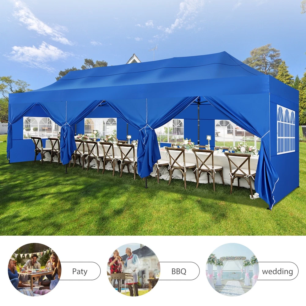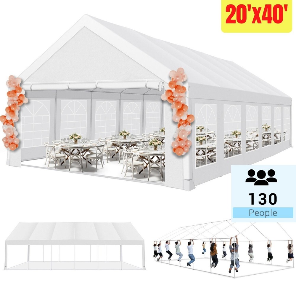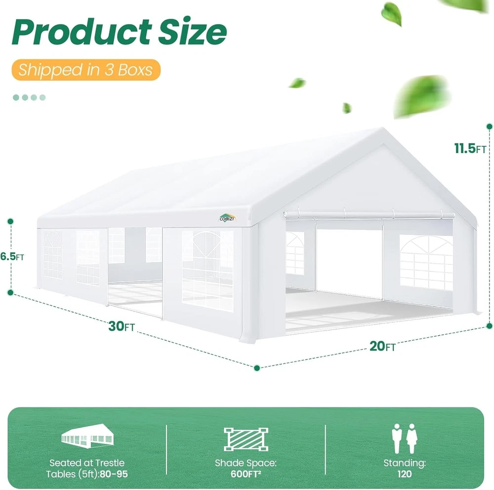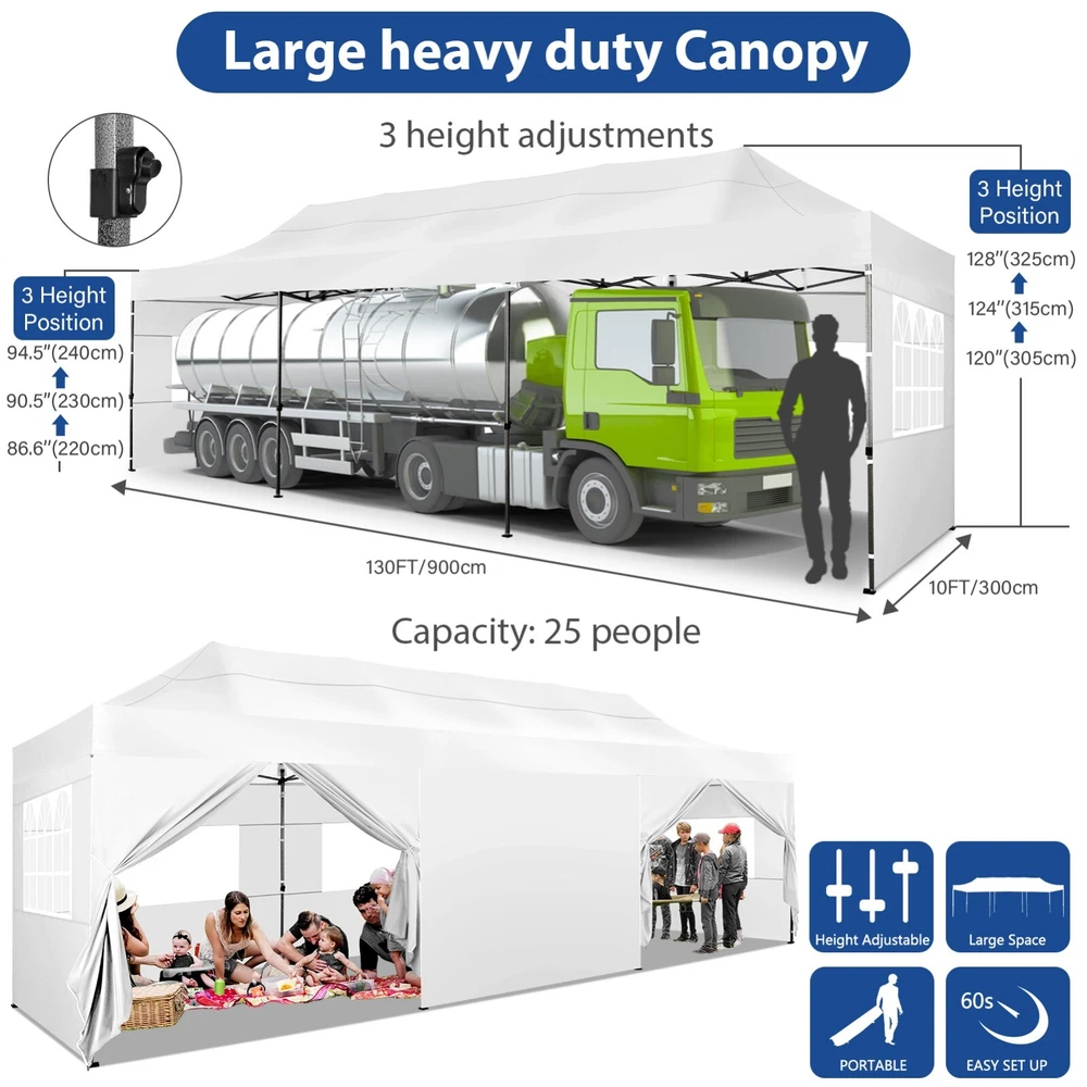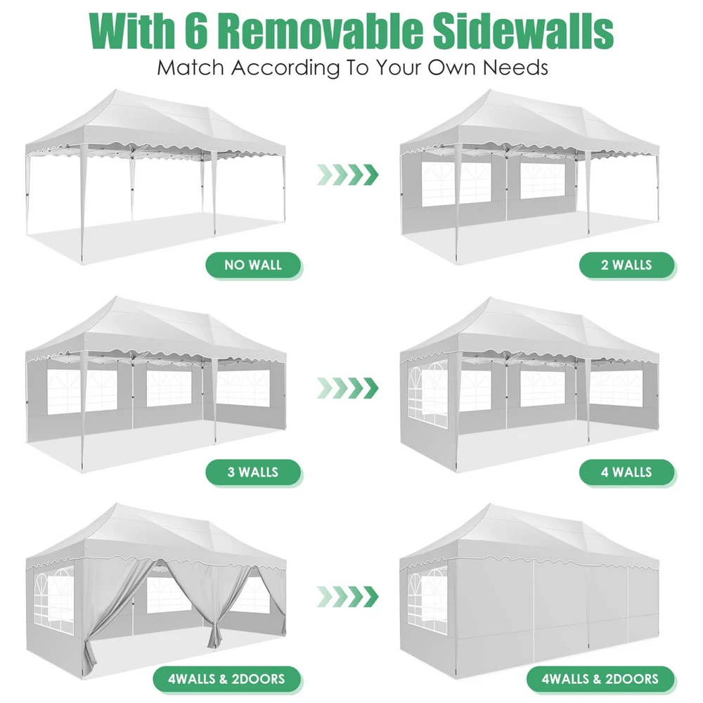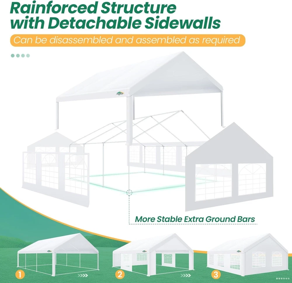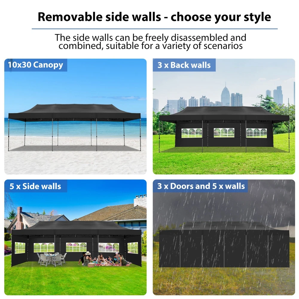 Description Heavy Duty 20x40 Event Tent Large Shelter with Removable Sidewalls, Carpas para Fiestas Commercial Outdoor Canopy Wedding Tent Carport, UV 50+, Waterproof About this item 💐 【 Heavy duty Structure & Closed Extra Ground Bars 】party tents 20x40 made from 1.5inch diameter all metal tube frame with elegant white paint coating, preventing chipping, peeling, rust, and corrosion. The stable triangular roof and closed ground link structure make the product more stable and less likely to shake than similar models on the market. Pegs and wind ropes, to make the event tents much safer and more stable. (Please do not use it when the wind is strong). 💐【 20x40 FT Extra Large Size & Versatile Usage 】20x40 tent can hold up to an estimated 50 people for for parties, or weddings, and can also be used as a carport or outdoor storage tent. Straight leg design and cathedral style roof offers an open-air feel for a variety of outdoor activities. Great for tent party, outdoor events, outdoor shelter. 💐【 All Season Tarp & Cathedral Windows 】 This heavy duty party tent top cover is made of heat-sealed, triple-layer 160g polyethylene fabric can Block 99% of Harmful UV Rays, which is waterproof and windproof, rainproof, dustproof and anti-snow, tear resistant etc. Waterproof PVC cathedral windows on the sides provide the tent with bright light and a good view. 💐【 Removable Sidewalls & Excellent Ventilation 】Our wedding tents Comes With 6 removable sidewalls with 12 PVC church windows and 2 zipper doors with windows. The number of the sidewall can be installed freely as needed. Roll-up zipper door and detachable sidewalls for even better ventilation, providing cross ventilation and venting on hot days. Also provides warmth on cold days. 💐【 Easy to Assemble & Warranty 】This waterproof outdoor wedding gazebo does not require additional installation tools. Connectiong with spring bottom simple and easy to use for quick installation. Any problem with any part, you can contact our customer service, we continue to provide you with after-sales service. Please note that this party tent is NOT FIREPROOF, so please keep it away from any fire source. Specifications: Color: White Size:20×40×10.5ft Product Weight: 300lb Weight Bearing: 2000lbs Waterproof: 100% Waterproof Sun Protection Index: UPF 50+ Cover Material: 160g PE Cloth Frame Material: Heavy Duty Metal Wide Usage: Perfect for Parties, Wedding, Camping, Storage, Shelter, marketing events, etc . Party Tent Size 20'X40' Roof style & Canopy material Peak Style Roof & Heat-sealed Triple-layer PE Tarp, Waterproof, UV protection and Tear resistant Pole material Elegant White Painted Steel Pipe, diameter 38mm, thickness 1.0mm, preventing chipping, peeling, rust, and corrosion. Sidewalls 6 Detachable Window Panels with 12 PVC Church Windows; and 2 Detachable Door Panels With Roll- up Zipper Door & 4 PVC Church Windows Party Tent Height 11.5FT to the top, 6.6FTto the edge; Window size: 4.3*4.7FT Note This party tent is NOT FIREPROOF, please stay away from the fire source. More Stability Art-welded Tube Connector; Elastic ball strap fasten the canopy to the frame; Pegs and wind ropes; Weight bags at the four corners of the canopy can add stability Variety Of Applications Perfect for Outdoor Patio Event Parties, Commercial Business Exhibition, Outdoor Wedding Parties, Storage tent, Carport, and so on. For Carport For Commercial Exhibition For Storage Tent For Wedding Tent 10'x30' / 8 Sidewalls 3 x 9m Pop Up Canopy Commercial Tent Eight Sides Three Doors Waterproof Tent Sun Shelter ✨About this item 🌟【Heavy Duty Upgraded Frame】The frame of 10x30 Pop Up Canopy Tent is commercial grade full truss construction made of durable powder coated stainless steel. 32mm/1.26 inch widened pipe diameter, 0.7mm/0.03 inch thickened wall thickness, Stronger and more stable than other normal gazebos on the market. The middle support pole structure can hold up to 220 lbs on a single pole and can withstand up to level 4 wind (18mph), using the included sandbags, ropes and nails for increased carport stability. 🌟【Best Quality Fabric and Sidewalls】10x30 Heavy duty canopy tent is made of 420D Oxford cloth with two layers of PU coating, UPF 50+, blocks 99% of UV rays. Heat-sealed seam technology is used, 100% waterproof, 1500mm waterproof pressure, waterproof effect is better than other general tents. 8 PU coated sidewalls connected by a whole strip of velcro and zipper to attach to the frame top and legs for securing, removable, you can install as many sidewalls as you want, convenient and practical. 🌟【Easy Set up, 3 Adjustable Heights】2-4 people can easily set up and take down 10x20 outdoor party tent canopy in minutes without tools, it can easily accommodate 20-25 people. Just remove the fully assembled frame and top from bag, place fabric over frame, stretch legs, and you're done. Wedding tent gazebo is available in 3 different heights (86.6'', 90.5'', 94.5'') for your choice to ensure adequate headspace. Best thumb latch system is easy to lock and release without pinching your fingers. 🌟【Portable 4 Wheels Roller Bag】Since 10x30 heavy duty pop up canopy tent with sidewalls has a weight of 136 lbs, we offer you a solid and durable 600D Oxford cloth PVC coated roller bag. It has 4 large wheels for standing feet and reinforced handle for easy movement and transportation. Tents for parties, weddings, BBQ, trade shows, sporting events, disaster relief or any outdoor event. Waterproof canopy gazebo are commonly used in commercial areas, playgrounds, patios, beaches, farms, gyms, etc. 🌟【WHAT'S INCLUDED】1x Commercial grade 10x30 Pop up Tent Frame, 1x 10'x30' Canopy Top Cover, 8x PU Coated Panels (5x Sidewalls with Window and 3x Sidewalls with Zipper), 4x 420D Oxford cloth PVC coated Sandbags, 4x Ground Pegs, 6x Wind Ropes, 1x Roller bag, 1x Manual. If you have any questions and doubts, please feel free to contact us, we will 