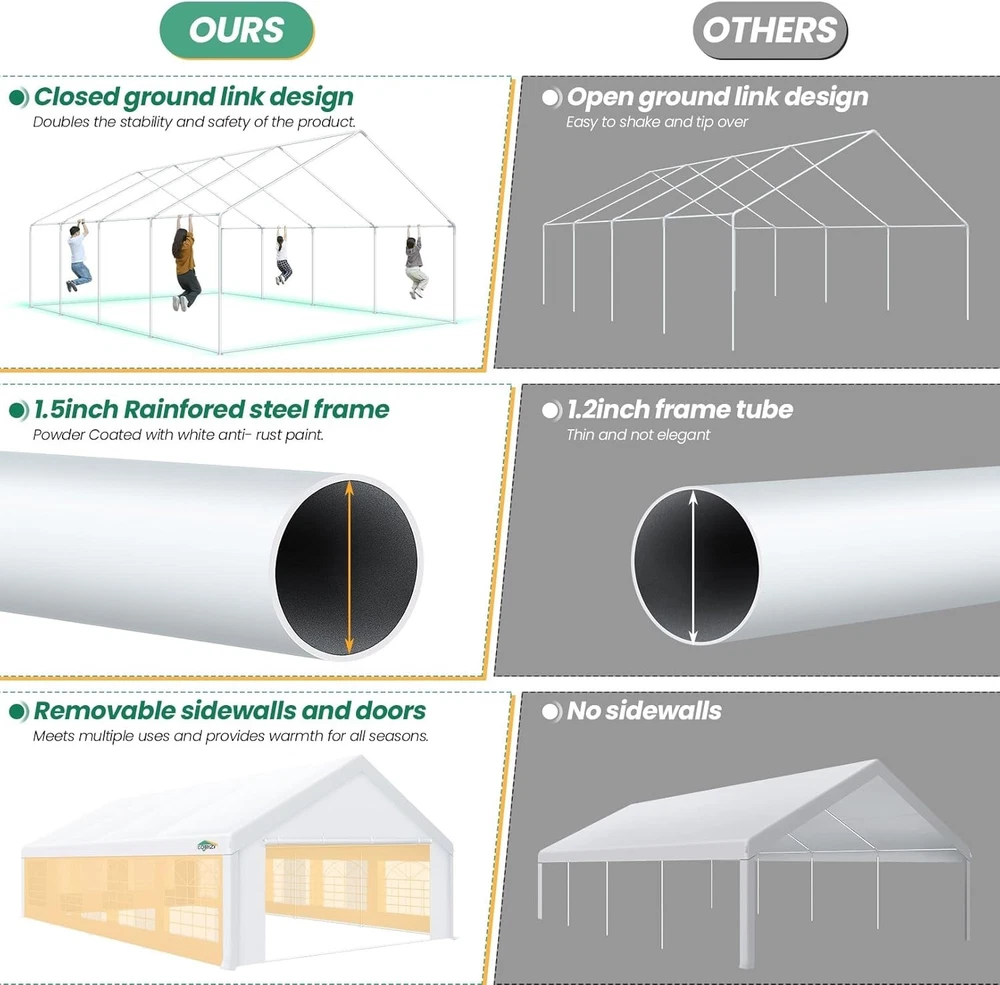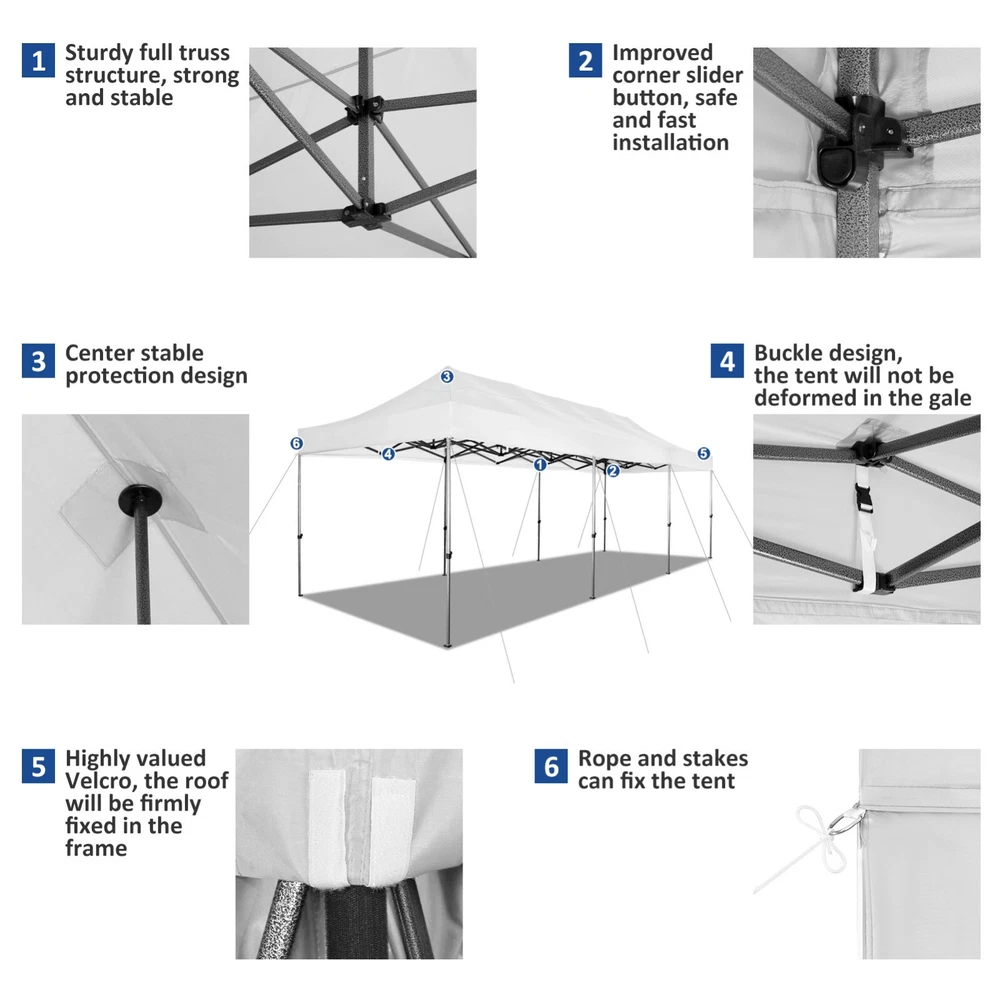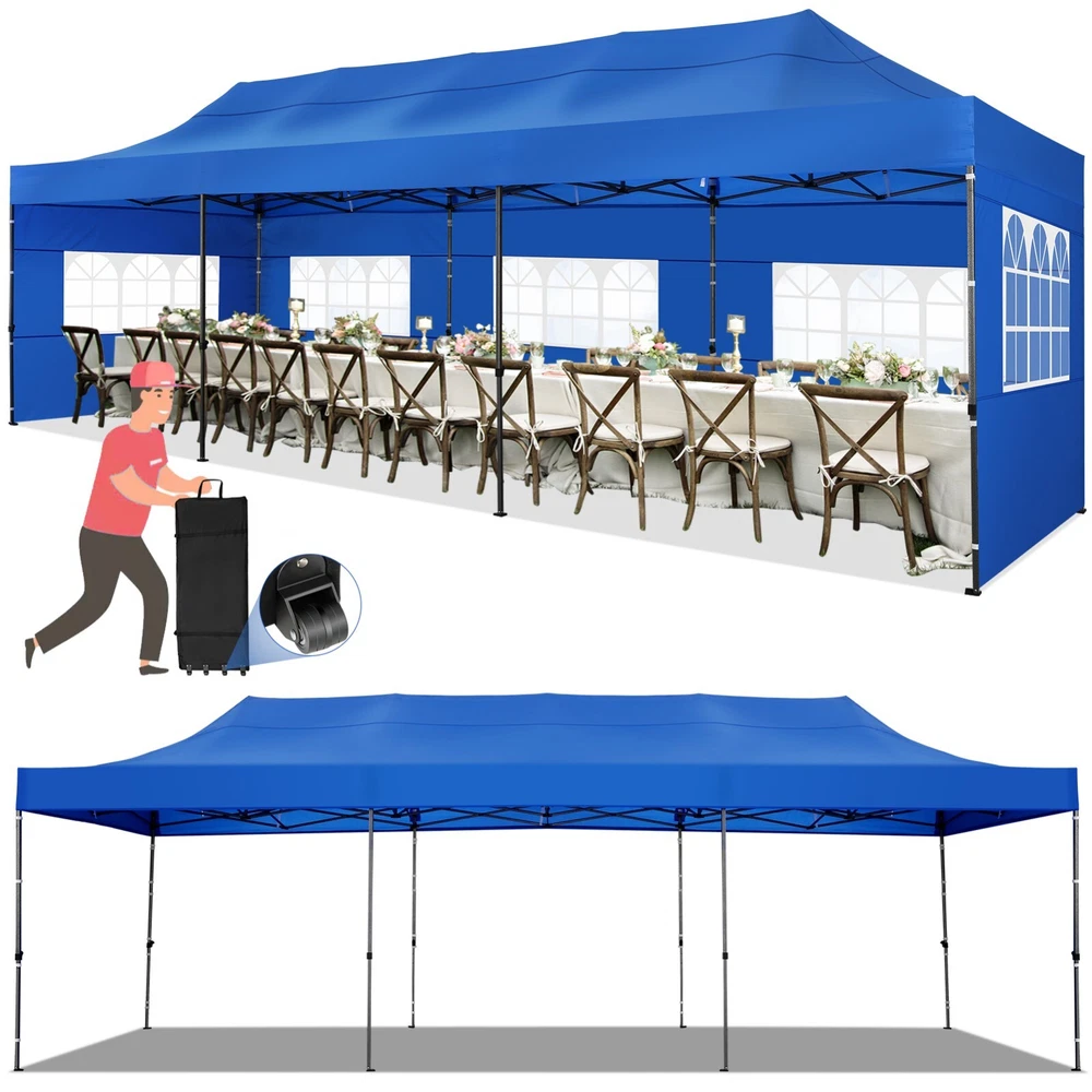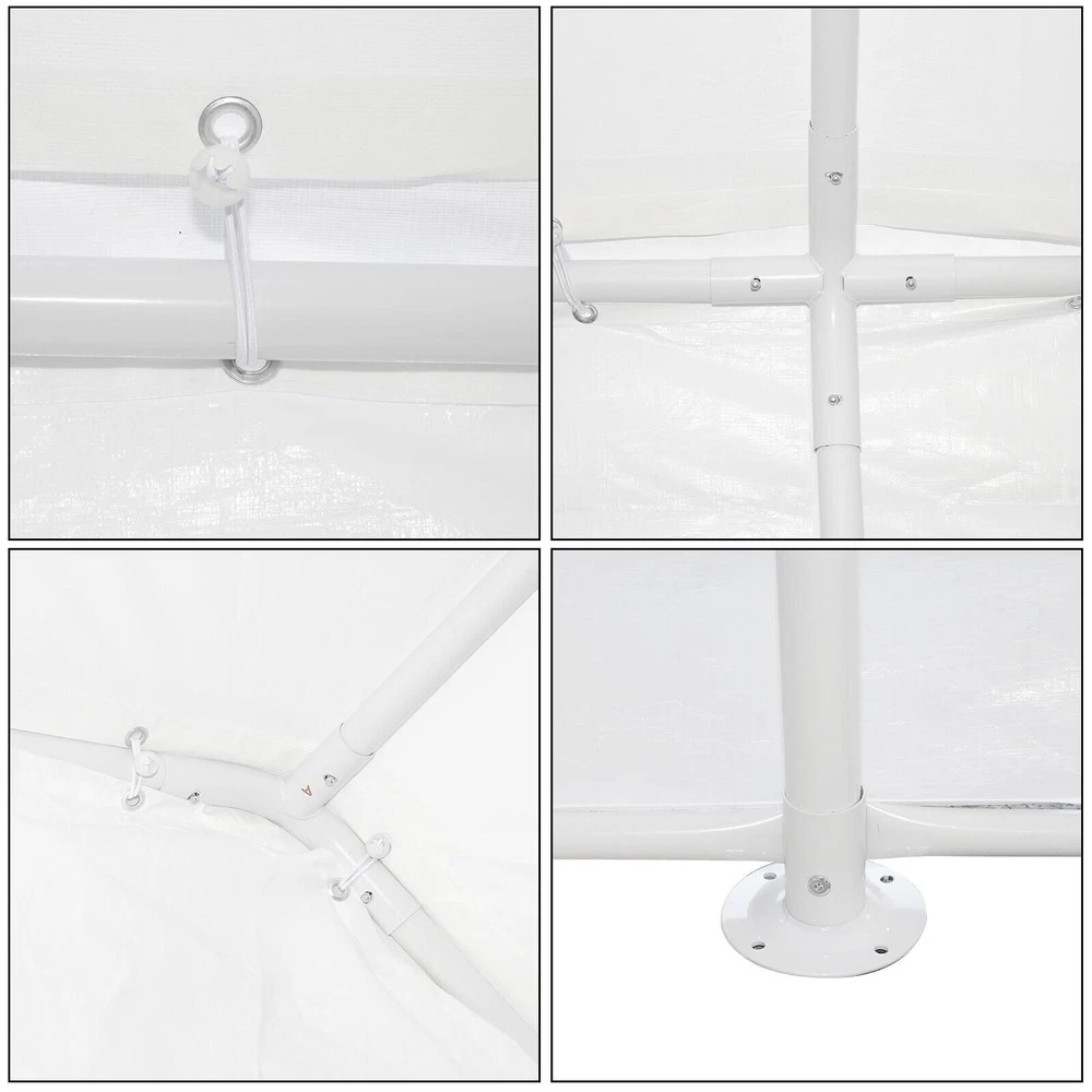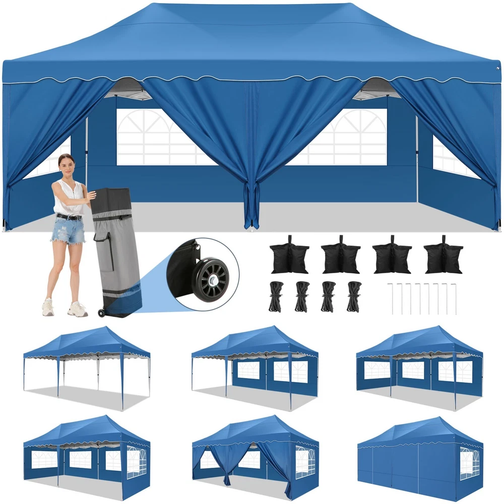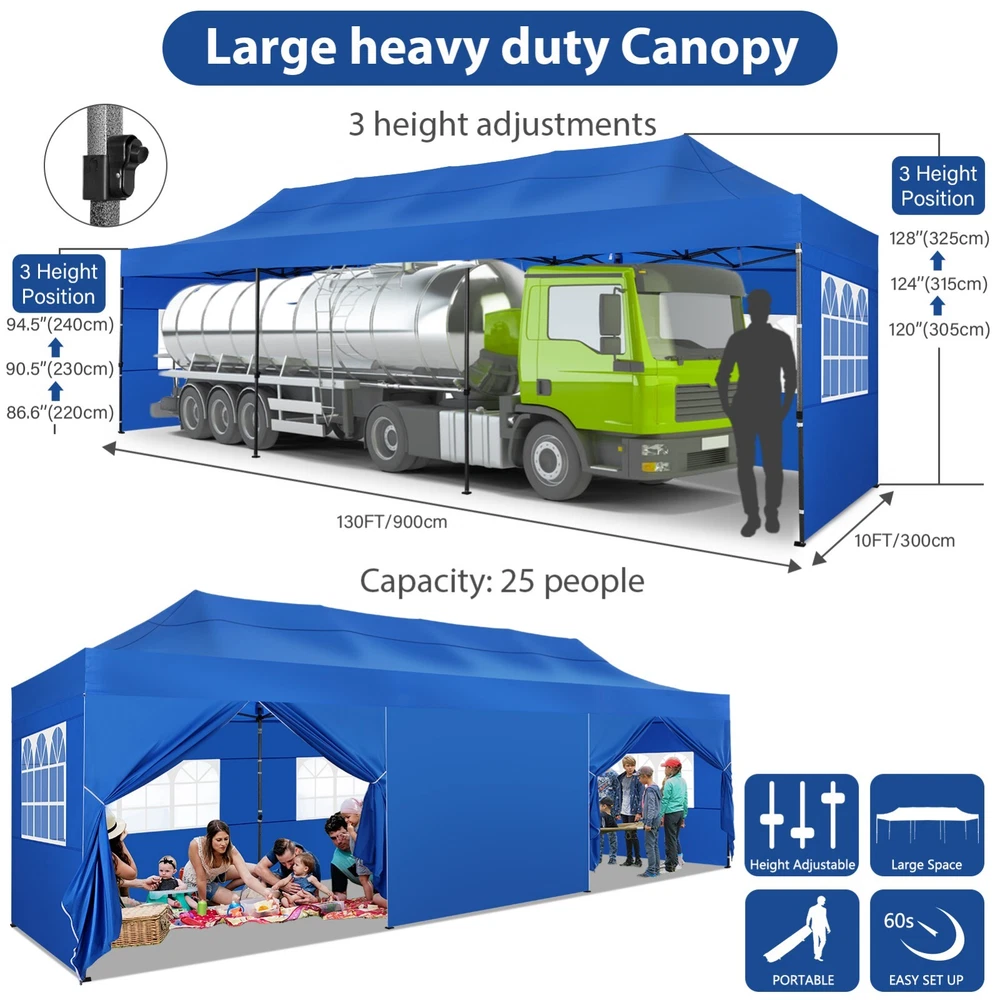 Description Heavy Duty 20x40 Event Tent Large Shelter with Removable Sidewalls, Carpas para Fiestas Commercial Outdoor Canopy Wedding Tent Carport, UV 50+, Waterproof About this item 💐 【 Heavy duty Structure & Closed Extra Ground Bars 】party tents 20x40 made from 1.5inch diameter all metal tube frame with elegant white paint coating, preventing chipping, peeling, rust, and corrosion. The stable triangular roof and closed ground link structure make the product more stable and less likely to shake than similar models on the market. Pegs and wind ropes, to make the event tents much safer and more stable. (Please do not use it when the wind is strong). 💐【 20x40 FT Extra Large Size & Versatile Usage 】20x40 tent can hold up to an estimated 50 people for for parties, or weddings, and can also be used as a carport or outdoor storage tent. Straight leg design and cathedral style roof offers an open-air feel for a variety of outdoor activities. Great for tent party, outdoor events, outdoor shelter. 💐【 All Season Tarp & Cathedral Windows 】 This heavy duty party tent top cover is made of heat-sealed, triple-layer 160g polyethylene fabric can Block 99% of Harmful UV Rays, which is waterproof and windproof, rainproof, dustproof and anti-snow, tear resistant etc. Waterproof PVC cathedral windows on the sides provide the tent with bright light and a good view. 💐【 Removable Sidewalls & Excellent Ventilation 】Our wedding tents Comes With 6 removable sidewalls with 12 PVC church windows and 2 zipper doors with windows. The number of the sidewall can be installed freely as needed. Roll-up zipper door and detachable sidewalls for even better ventilation, providing cross ventilation and venting on hot days. Also provides warmth on cold days. 💐【 Easy to Assemble & Warranty 】This waterproof outdoor wedding gazebo does not require additional installation tools. Connectiong with spring bottom simple and easy to use for quick installation. Any problem with any part, you can contact our customer service, we continue to provide you with after-sales service. Please note that this party tent is NOT FIREPROOF, so please keep it away from any fire source. Specifications: Color: White Size:20×40×10.5ft Product Weight: 300lb Weight Bearing: 2000lbs Waterproof: 100% Waterproof Sun Protection Index: UPF 50+ Cover Material: 160g PE Cloth Frame Material: Heavy Duty Metal Wide Usage: Perfect for Parties, Wedding, Camping, Storage, Shelter, marketing events, etc . Party Tent Size 20'X40' Roof style & Canopy material Peak Style Roof & Heat-sealed Triple-layer PE Tarp, Waterproof, UV protection and Tear resistant Pole material Elegant White Painted Steel Pipe, diameter 38mm, thickness 1.0mm, preventing chipping, peeling, rust, and corrosion. Sidewalls 6 Detachable Window Panels with 12 PVC Church Windows; and 2 Detachable Door Panels With Roll- up Zipper Door & 4 PVC Church Windows Party Tent Height 11.5FT to the top, 6.6FTto the edge; Window size: 4.3*4.7FT Note This party tent is NOT FIREPROOF, please stay away from the fire source. More Stability Art-welded Tube Connector; Elastic ball strap fasten the canopy to the frame; Pegs and wind ropes; Weight bags at the four corners of the canopy can add stability Variety Of Applications Perfect for Outdoor Patio Event Parties, Commercial Business Exhibition, Outdoor Wedding Parties, Storage tent, Carport, and so on. For Carport For Commercial Exhibition For Storage Tent For Wedding Tent 10'x30' / 8 Sidewalls 3 x 9m Pop Up Canopy Commercial Tent Eight Sides Three Doors Waterproof Tent Sun Shelter ✨About this item 🌟【Heavy Duty Upgraded Frame】The frame of 10x30 Pop Up Canopy Tent is commercial grade full truss construction made of durable powder coated stainless steel. 32mm/1.26 inch widened pipe diameter, 0.7mm/0.03 inch thickened wall thickness, Stronger and more stable than other normal gazebos on the market. The middle support pole structure can hold up to 220 lbs on a single pole and can withstand up to level 4 wind (18mph), using the included sandbags, ropes and nails for increased carport stability. 🌟【Best Quality Fabric and Sidewalls】10x30 Heavy duty canopy tent is made of 420D Oxford cloth with two layers of PU coating, UPF 50+, blocks 99% of UV rays. Heat-sealed seam technology is used, 100% waterproof, 1500mm waterproof pressure, waterproof effect is better than other general tents. 8 PU coated sidewalls connected by a whole strip of velcro and zipper to attach to the frame top and legs for securing, removable, you can install as many sidewalls as you want, convenient and practical. 🌟【Easy Set up, 3 Adjustable Heights】2-4 people can easily set up and take down 10x20 outdoor party tent canopy in minutes without tools, it can easily accommodate 20-25 people. Just remove the fully assembled frame and top from bag, place fabric over frame, stretch legs, and you're done. Wedding tent gazebo is available in 3 different heights (86.6'', 90.5'', 94.5'') for your choice to ensure adequate headspace. Best thumb latch system is easy to lock and release without pinching your fingers. 🌟【Portable 4 Wheels Roller Bag】Since 10x30 heavy duty pop up canopy tent with sidewalls has a weight of 136 lbs, we offer you a solid and durable 600D Oxford cloth PVC coated roller bag. It has 4 large wheels for standing feet and reinforced handle for easy movement and transportation. Tents for parties, weddings, BBQ, trade shows, sporting events, disaster relief or any outdoor event. Waterproof canopy gazebo are commonly used in commercial areas, playgrounds, patios, beaches, farms, gyms, etc. 🌟【WHAT'S INCLUDED】1x Commercial grade 10x30 Pop up Tent Frame, 1x 10'x30' Canopy Top Cover, 8x PU Coated Panels (5x Sidewalls with Window and 3x Sidewalls with Zipper), 4x 420D Oxford cloth PVC coated Sandbags, 4x Ground Pegs, 6x Wind Ropes, 1x Roller bag, 1x Manual. If you have any questions and doubts, please feel free to contact us, we will 