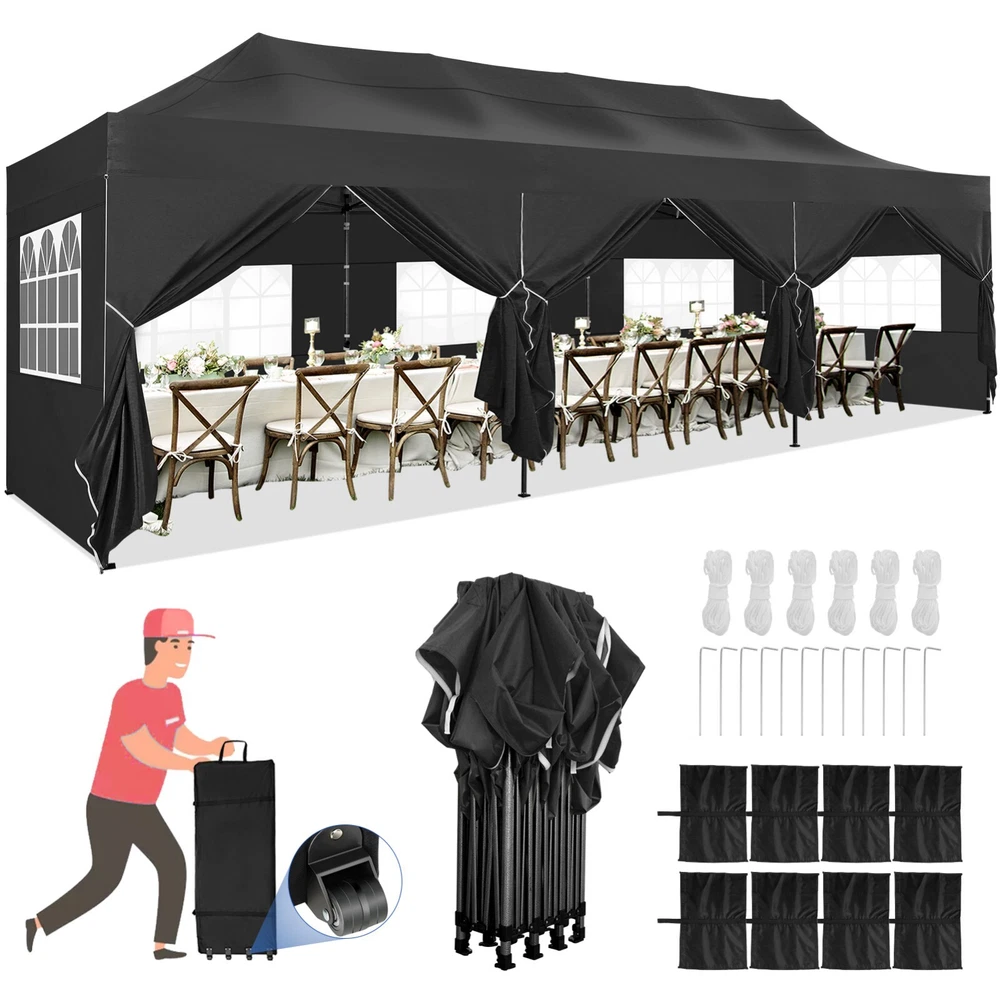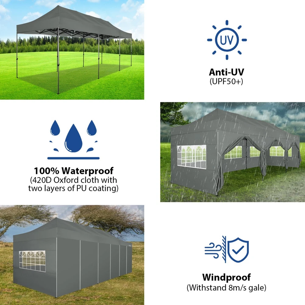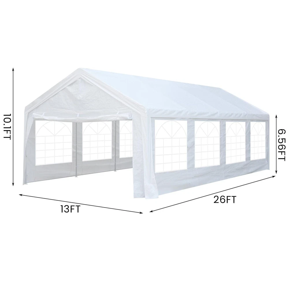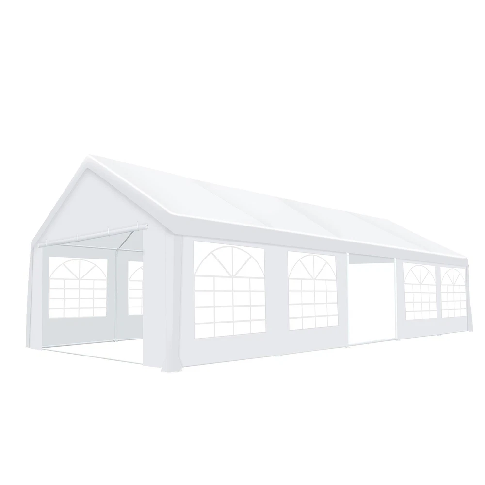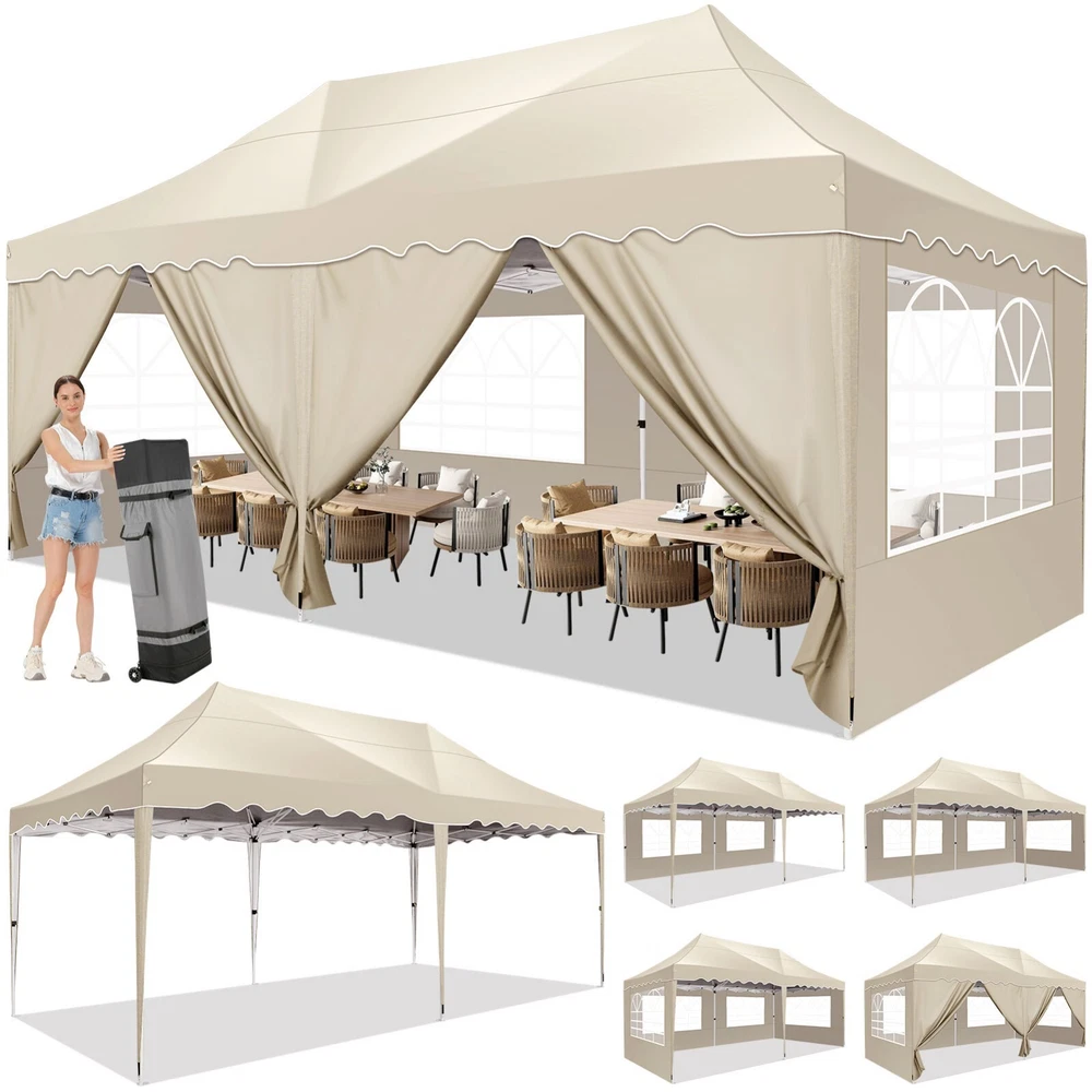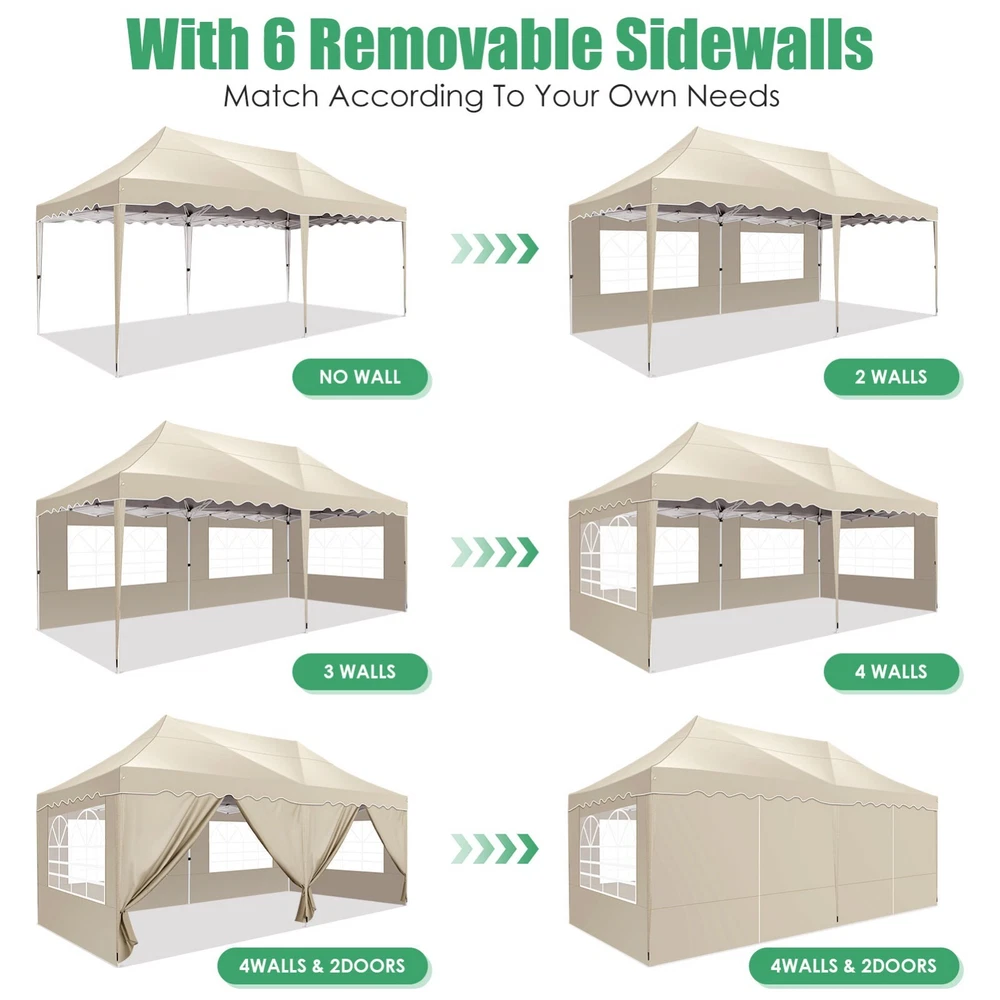 Description Heavy Duty 20x40 Event Tent Large Shelter with Removable Sidewalls, Carpas para Fiestas Commercial Outdoor Canopy Wedding Tent Carport, UV 50+, Waterproof About this item 💐 【 Heavy duty Structure & Closed Extra Ground Bars 】party tents 20x40 made from 1.5inch diameter all metal tube frame with elegant white paint coating, preventing chipping, peeling, rust, and corrosion. The stable triangular roof and closed ground link structure make the product more stable and less likely to shake than similar models on the market. Pegs and wind ropes, to make the event tents much safer and more stable. (Please do not use it when the wind is strong). 💐【 20x40 FT Extra Large Size & Versatile Usage 】20x40 tent can hold up to an estimated 50 people for for parties, or weddings, and can also be used as a carport or outdoor storage tent. Straight leg design and cathedral style roof offers an open-air feel for a variety of outdoor activities. Great for tent party, outdoor events, outdoor shelter. 💐【 All Season Tarp & Cathedral Windows 】 This heavy duty party tent top cover is made of heat-sealed, triple-layer 160g polyethylene fabric can Block 99% of Harmful UV Rays, which is waterproof and windproof, rainproof, dustproof and anti-snow, tear resistant etc. Waterproof PVC cathedral windows on the sides provide the tent with bright light and a good view. 💐【 Removable Sidewalls & Excellent Ventilation 】Our wedding tents Comes With 6 removable sidewalls with 12 PVC church windows and 2 zipper doors with windows. The number of the sidewall can be installed freely as needed. Roll-up zipper door and detachable sidewalls for even better ventilation, providing cross ventilation and venting on hot days. Also provides warmth on cold days. 💐【 Easy to Assemble & Warranty 】This waterproof outdoor wedding gazebo does not require additional installation tools. Connectiong with spring bottom simple and easy to use for quick installation. Any problem with any part, you can contact our customer service, we continue to provide you with after-sales service. Please note that this party tent is NOT FIREPROOF, so please keep it away from any fire source. Specifications: Color: White Size:20×40×10.5ft Product Weight: 300lb Weight Bearing: 2000lbs Waterproof: 100% Waterproof Sun Protection Index: UPF 50+ Cover Material: 160g PE Cloth Frame Material: Heavy Duty Metal Wide Usage: Perfect for Parties, Wedding, Camping, Storage, Shelter, marketing events, etc . Party Tent Size 20'X40' Roof style & Canopy material Peak Style Roof & Heat-sealed Triple-layer PE Tarp, Waterproof, UV protection and Tear resistant Pole material Elegant White Painted Steel Pipe, diameter 38mm, thickness 1.0mm, preventing chipping, peeling, rust, and corrosion. Sidewalls 6 Detachable Window Panels with 12 PVC Church Windows; and 2 Detachable Door Panels With Roll- up Zipper Door & 4 PVC Church Windows Party Tent Height 11.5FT to the top, 6.6FTto the edge; Window size: 4.3*4.7FT Note This party tent is NOT FIREPROOF, please stay away from the fire source. More Stability Art-welded Tube Connector; Elastic ball strap fasten the canopy to the frame; Pegs and wind ropes; Weight bags at the four corners of the canopy can add stability Variety Of Applications Perfect for Outdoor Patio Event Parties, Commercial Business Exhibition, Outdoor Wedding Parties, Storage tent, Carport, and so on. For Carport For Commercial Exhibition For Storage Tent For Wedding Tent 10'x30' / 8 Sidewalls 3 x 9m Pop Up Canopy Commercial Tent Eight Sides Three Doors Waterproof Tent Sun Shelter ✨About this item 🌟【Heavy Duty Upgraded Frame】The frame of 10x30 Pop Up Canopy Tent is commercial grade full truss construction made of durable powder coated stainless steel. 32mm/1.26 inch widened pipe diameter, 0.7mm/0.03 inch thickened wall thickness, Stronger and more stable than other normal gazebos on the market. The middle support pole structure can hold up to 220 lbs on a single pole and can withstand up to level 4 wind (18mph), using the included sandbags, ropes and nails for increased carport stability. 🌟【Best Quality Fabric and Sidewalls】10x30 Heavy duty canopy tent is made of 420D Oxford cloth with two layers of PU coating, UPF 50+, blocks 99% of UV rays. Heat-sealed seam technology is used, 100% waterproof, 1500mm waterproof pressure, waterproof effect is better than other general tents. 8 PU coated sidewalls connected by a whole strip of velcro and zipper to attach to the frame top and legs for securing, removable, you can install as many sidewalls as you want, convenient and practical. 🌟【Easy Set up, 3 Adjustable Heights】2-4 people can easily set up and take down 10x20 outdoor party tent canopy in minutes without tools, it can easily accommodate 20-25 people. Just remove the fully assembled frame and top from bag, place fabric over frame, stretch legs, and you're done. Wedding tent gazebo is available in 3 different heights (86.6'', 90.5'', 94.5'') for your choice to ensure adequate headspace. Best thumb latch system is easy to lock and release without pinching your fingers. 🌟【Portable 4 Wheels Roller Bag】Since 10x30 heavy duty pop up canopy tent with sidewalls has a weight of 136 lbs, we offer you a solid and durable 600D Oxford cloth PVC coated roller bag. It has 4 large wheels for standing feet and reinforced handle for easy movement and transportation. Tents for parties, weddings, BBQ, trade shows, sporting events, disaster relief or any outdoor event. Waterproof canopy gazebo are commonly used in commercial areas, playgrounds, patios, beaches, farms, gyms, etc. 🌟【WHAT'S INCLUDED】1x Commercial grade 10x30 Pop up Tent Frame, 1x 10'x30' Canopy Top Cover, 8x PU Coated Panels (5x Sidewalls with Window and 3x Sidewalls with Zipper), 4x 420D Oxford cloth PVC coated Sandbags, 4x Ground Pegs, 6x Wind Ropes, 1x Roller bag, 1x Manual. If you have any questions and doubts, please feel free to contact us, we will 