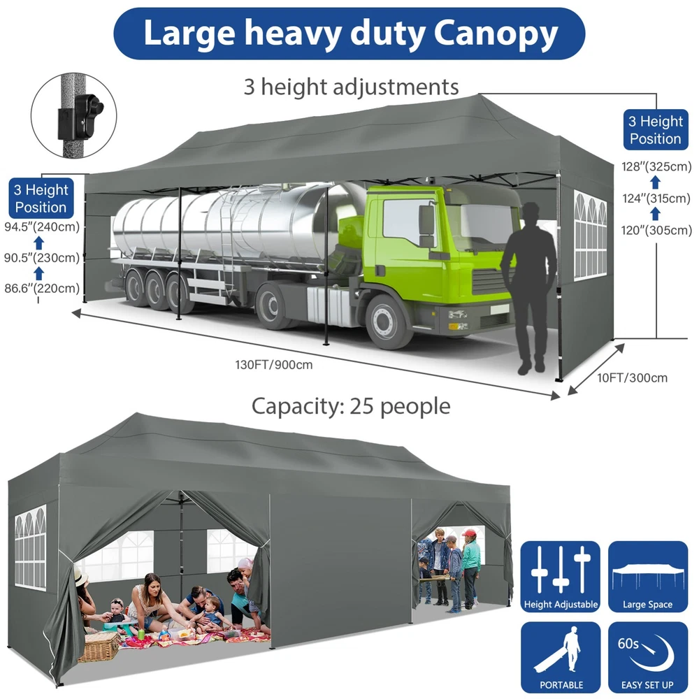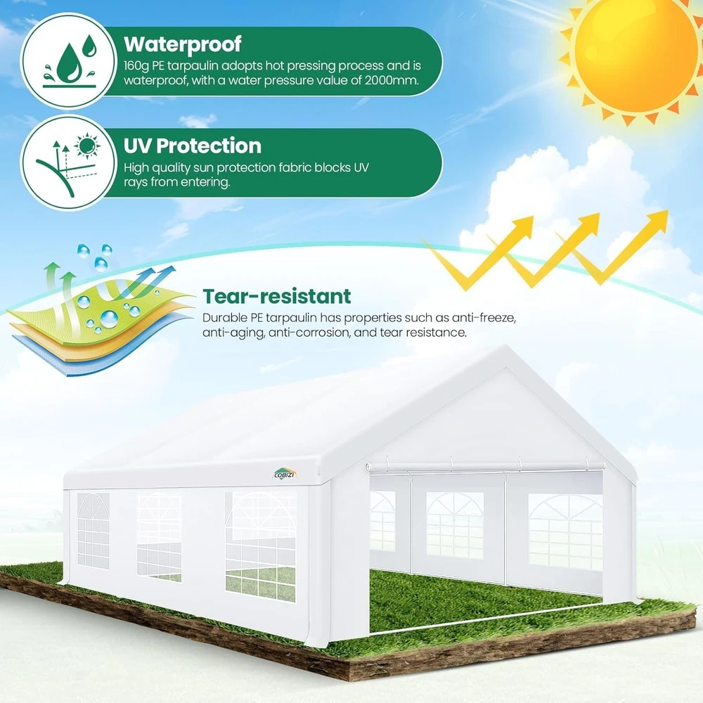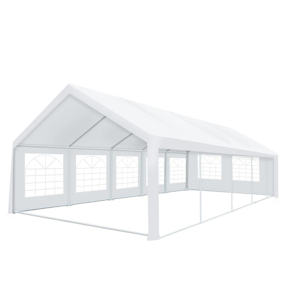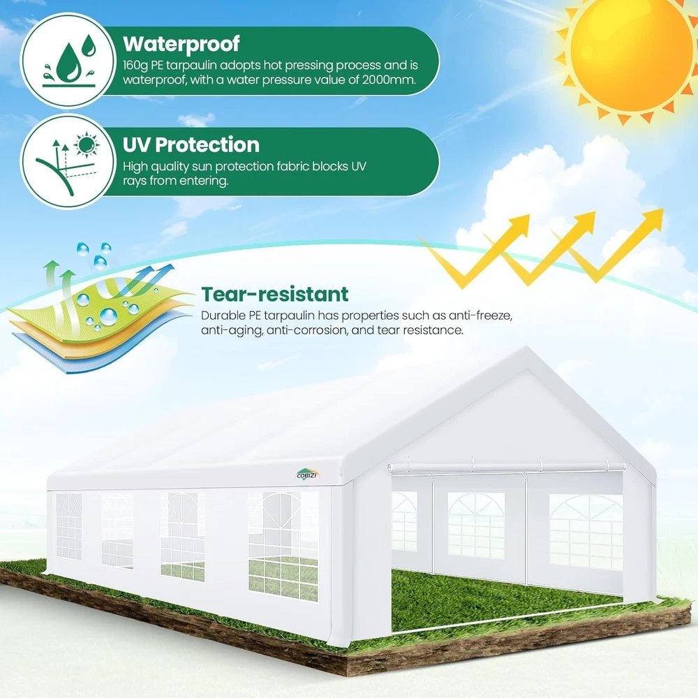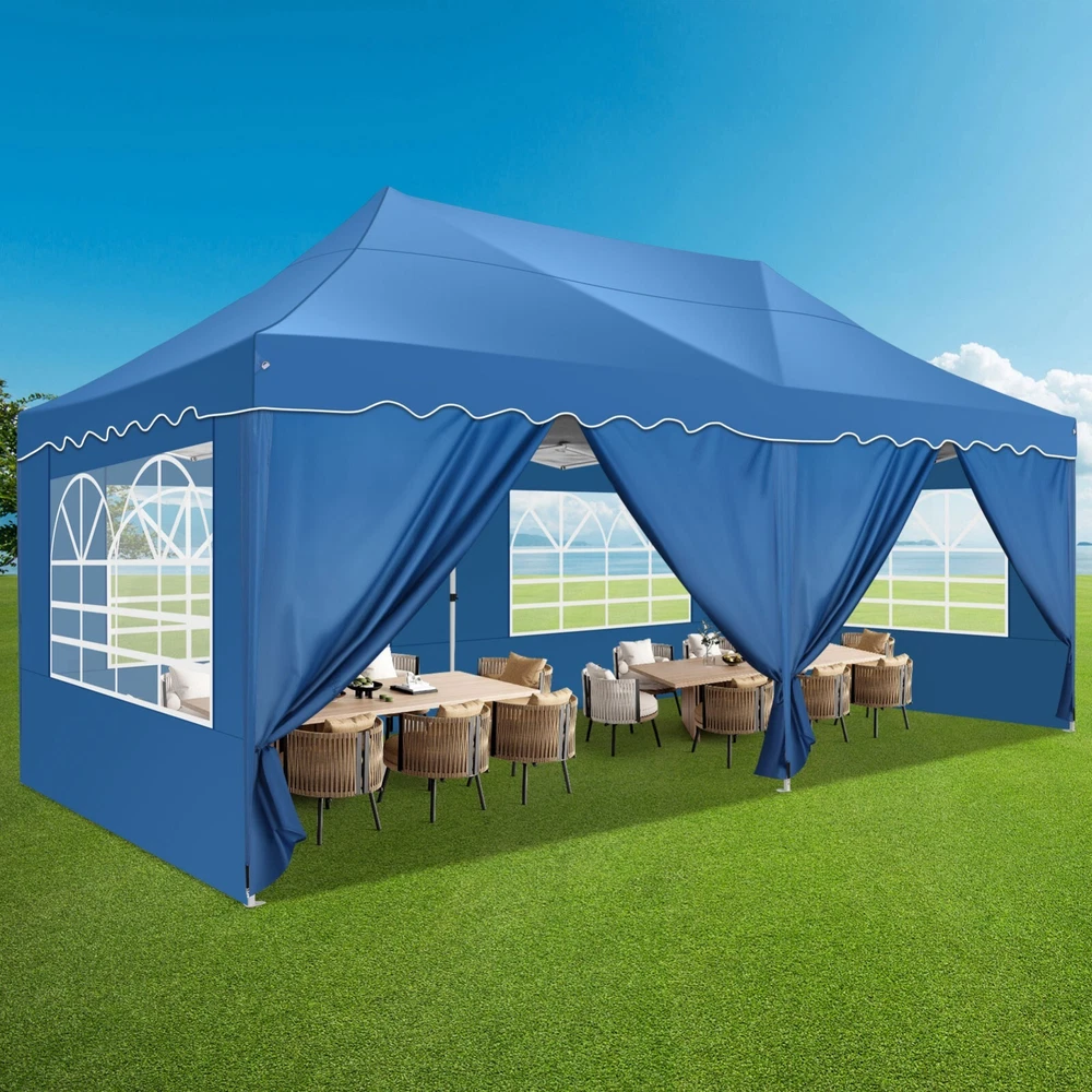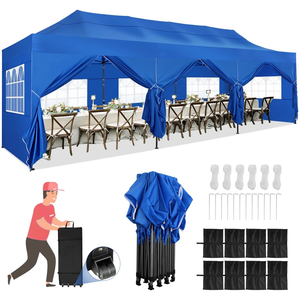 Description Heavy Duty 20x40 Event Tent Large Shelter with Removable Sidewalls, Carpas para Fiestas Commercial Outdoor Canopy Wedding Tent Carport, UV 50+, Waterproof About this item 💐 【 Heavy duty Structure & Closed Extra Ground Bars 】party tents 20x40 made from 1.5inch diameter all metal tube frame with elegant white paint coating, preventing chipping, peeling, rust, and corrosion. The stable triangular roof and closed ground link structure make the product more stable and less likely to shake than similar models on the market. Pegs and wind ropes, to make the event tents much safer and more stable. (Please do not use it when the wind is strong). 💐【 20x40 FT Extra Large Size & Versatile Usage 】20x40 tent can hold up to an estimated 50 people for for parties, or weddings, and can also be used as a carport or outdoor storage tent. Straight leg design and cathedral style roof offers an open-air feel for a variety of outdoor activities. Great for tent party, outdoor events, outdoor shelter. 💐【 All Season Tarp & Cathedral Windows 】 This heavy duty party tent top cover is made of heat-sealed, triple-layer 160g polyethylene fabric can Block 99% of Harmful UV Rays, which is waterproof and windproof, rainproof, dustproof and anti-snow, tear resistant etc. Waterproof PVC cathedral windows on the sides provide the tent with bright light and a good view. 💐【 Removable Sidewalls & Excellent Ventilation 】Our wedding tents Comes With 6 removable sidewalls with 12 PVC church windows and 2 zipper doors with windows. The number of the sidewall can be installed freely as needed. Roll-up zipper door and detachable sidewalls for even better ventilation, providing cross ventilation and venting on hot days. Also provides warmth on cold days. 💐【 Easy to Assemble & Warranty 】This waterproof outdoor wedding gazebo does not require additional installation tools. Connectiong with spring bottom simple and easy to use for quick installation. Any problem with any part, you can contact our customer service, we continue to provide you with after-sales service. Please note that this party tent is NOT FIREPROOF, so please keep it away from any fire source. Specifications: Color: White Size:20×40×10.5ft Product Weight: 300lb Weight Bearing: 2000lbs Waterproof: 100% Waterproof Sun Protection Index: UPF 50+ Cover Material: 160g PE Cloth Frame Material: Heavy Duty Metal Wide Usage: Perfect for Parties, Wedding, Camping, Storage, Shelter, marketing events, etc . Party Tent Size 20'X40' Roof style & Canopy material Peak Style Roof & Heat-sealed Triple-layer PE Tarp, Waterproof, UV protection and Tear resistant Pole material Elegant White Painted Steel Pipe, diameter 38mm, thickness 1.0mm, preventing chipping, peeling, rust, and corrosion. Sidewalls 6 Detachable Window Panels with 12 PVC Church Windows; and 2 Detachable Door Panels With Roll- up Zipper Door & 4 PVC Church Windows Party Tent Height 11.5FT to the top, 6.6FTto the edge; Window size: 4.3*4.7FT Note This party tent is NOT FIREPROOF, please stay away from the fire source. More Stability Art-welded Tube Connector; Elastic ball strap fasten the canopy to the frame; Pegs and wind ropes; Weight bags at the four corners of the canopy can add stability Variety Of Applications Perfect for Outdoor Patio Event Parties, Commercial Business Exhibition, Outdoor Wedding Parties, Storage tent, Carport, and so on. For Carport For Commercial Exhibition For Storage Tent For Wedding Tent 10'x30' / 8 Sidewalls 3 x 9m Pop Up Canopy Commercial Tent Eight Sides Three Doors Waterproof Tent Sun Shelter ✨About this item 🌟【Heavy Duty Upgraded Frame】The frame of 10x30 Pop Up Canopy Tent is commercial grade full truss construction made of durable powder coated stainless steel. 32mm/1.26 inch widened pipe diameter, 0.7mm/0.03 inch thickened wall thickness, Stronger and more stable than other normal gazebos on the market. The middle support pole structure can hold up to 220 lbs on a single pole and can withstand up to level 4 wind (18mph), using the included sandbags, ropes and nails for increased carport stability. 🌟【Best Quality Fabric and Sidewalls】10x30 Heavy duty canopy tent is made of 420D Oxford cloth with two layers of PU coating, UPF 50+, blocks 99% of UV rays. Heat-sealed seam technology is used, 100% waterproof, 1500mm waterproof pressure, waterproof effect is better than other general tents. 8 PU coated sidewalls connected by a whole strip of velcro and zipper to attach to the frame top and legs for securing, removable, you can install as many sidewalls as you want, convenient and practical. 🌟【Easy Set up, 3 Adjustable Heights】2-4 people can easily set up and take down 10x20 outdoor party tent canopy in minutes without tools, it can easily accommodate 20-25 people. Just remove the fully assembled frame and top from bag, place fabric over frame, stretch legs, and you're done. Wedding tent gazebo is available in 3 different heights (86.6'', 90.5'', 94.5'') for your choice to ensure adequate headspace. Best thumb latch system is easy to lock and release without pinching your fingers. 🌟【Portable 4 Wheels Roller Bag】Since 10x30 heavy duty pop up canopy tent with sidewalls has a weight of 136 lbs, we offer you a solid and durable 600D Oxford cloth PVC coated roller bag. It has 4 large wheels for standing feet and reinforced handle for easy movement and transportation. Tents for parties, weddings, BBQ, trade shows, sporting events, disaster relief or any outdoor event. Waterproof canopy gazebo are commonly used in commercial areas, playgrounds, patios, beaches, farms, gyms, etc. 🌟【WHAT'S INCLUDED】1x Commercial grade 10x30 Pop up Tent Frame, 1x 10'x30' Canopy Top Cover, 8x PU Coated Panels (5x Sidewalls with Window and 3x Sidewalls with Zipper), 4x 420D Oxford cloth PVC coated Sandbags, 4x Ground Pegs, 6x Wind Ropes, 1x Roller bag, 1x Manual. If you have any questions and doubts, please feel free to contact us, we will 