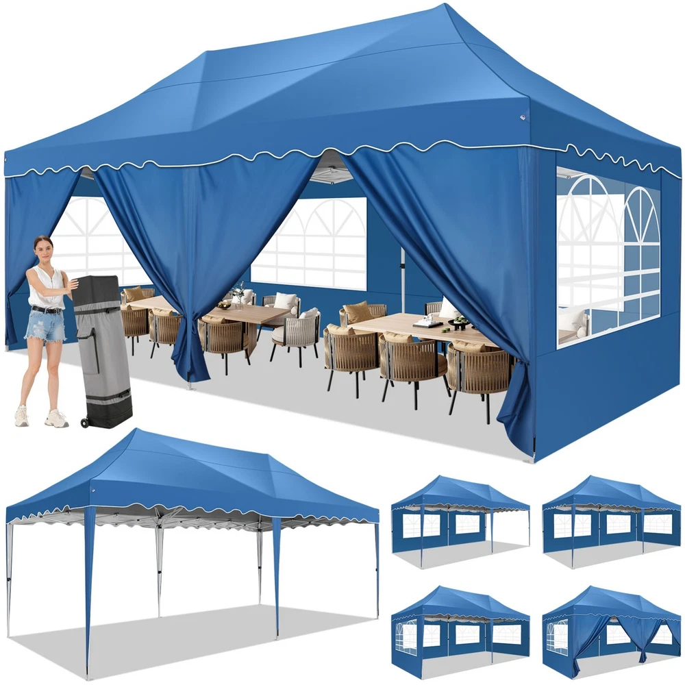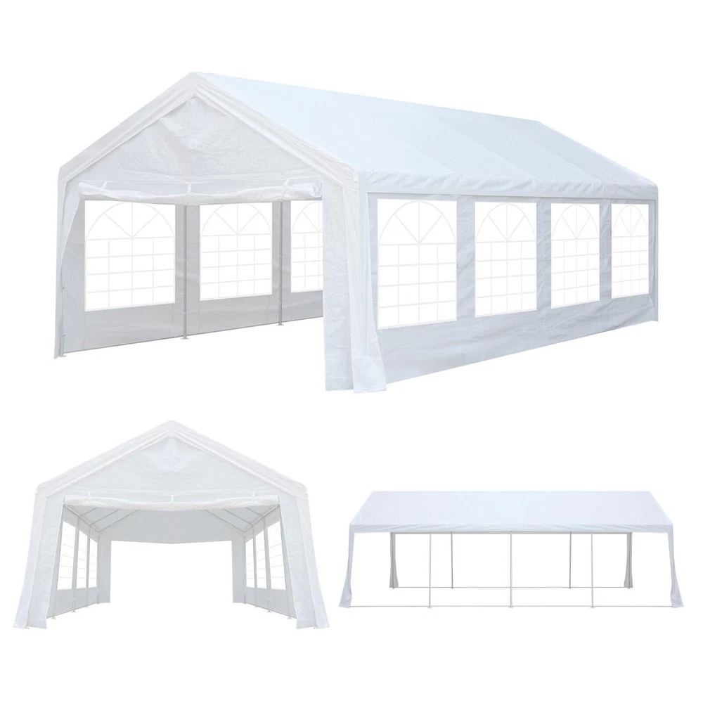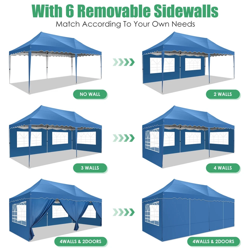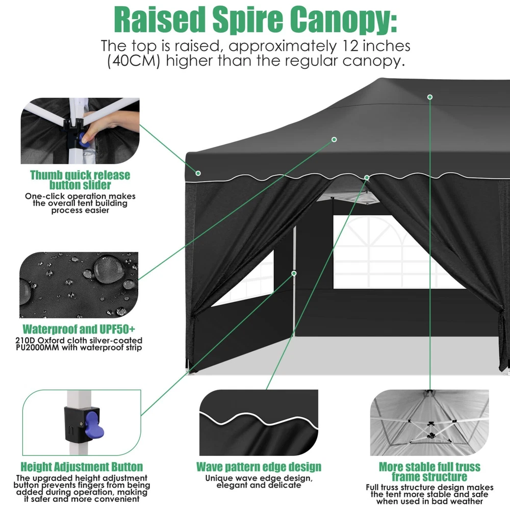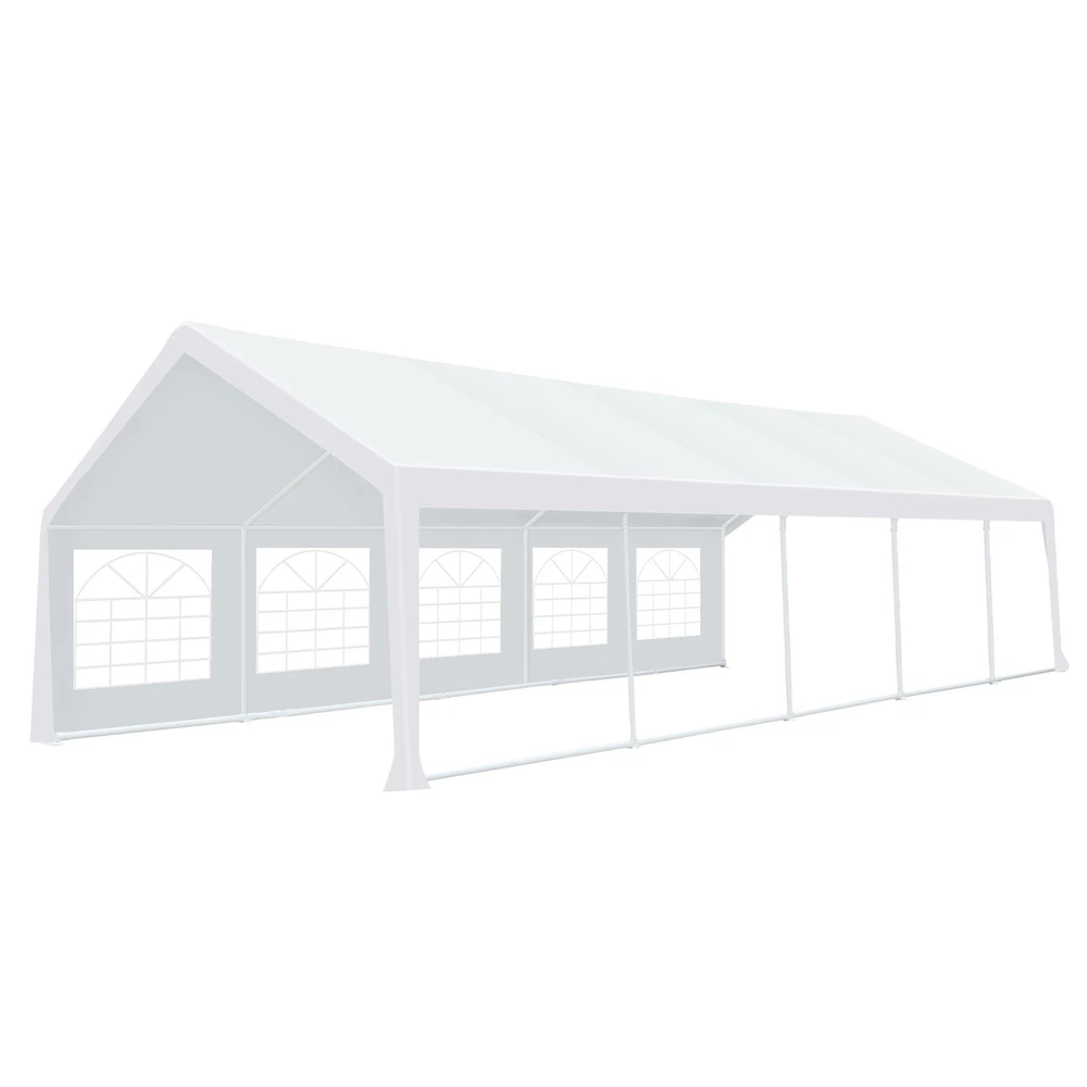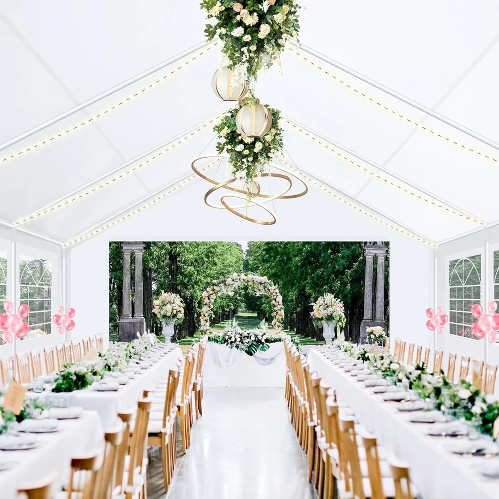 Description Heavy Duty 20x40 Event Tent Large Shelter with Removable Sidewalls, Carpas para Fiestas Commercial Outdoor Canopy Wedding Tent Carport, UV 50+, Waterproof About this item 💐 【 Heavy duty Structure & Closed Extra Ground Bars 】party tents 20x40 made from 1.5inch diameter all metal tube frame with elegant white paint coating, preventing chipping, peeling, rust, and corrosion. The stable triangular roof and closed ground link structure make the product more stable and less likely to shake than similar models on the market. Pegs and wind ropes, to make the event tents much safer and more stable. (Please do not use it when the wind is strong). 💐【 20x40 FT Extra Large Size & Versatile Usage 】20x40 tent can hold up to an estimated 50 people for for parties, or weddings, and can also be used as a carport or outdoor storage tent. Straight leg design and cathedral style roof offers an open-air feel for a variety of outdoor activities. Great for tent party, outdoor events, outdoor shelter. 💐【 All Season Tarp & Cathedral Windows 】 This heavy duty party tent top cover is made of heat-sealed, triple-layer 160g polyethylene fabric can Block 99% of Harmful UV Rays, which is waterproof and windproof, rainproof, dustproof and anti-snow, tear resistant etc. Waterproof PVC cathedral windows on the sides provide the tent with bright light and a good view. 💐【 Removable Sidewalls & Excellent Ventilation 】Our wedding tents Comes With 6 removable sidewalls with 12 PVC church windows and 2 zipper doors with windows. The number of the sidewall can be installed freely as needed. Roll-up zipper door and detachable sidewalls for even better ventilation, providing cross ventilation and venting on hot days. Also provides warmth on cold days. 💐【 Easy to Assemble & Warranty 】This waterproof outdoor wedding gazebo does not require additional installation tools. Connectiong with spring bottom simple and easy to use for quick installation. Any problem with any part, you can contact our customer service, we continue to provide you with after-sales service. Please note that this party tent is NOT FIREPROOF, so please keep it away from any fire source. Specifications: Color: White Size:20×40×10.5ft Product Weight: 300lb Weight Bearing: 2000lbs Waterproof: 100% Waterproof Sun Protection Index: UPF 50+ Cover Material: 160g PE Cloth Frame Material: Heavy Duty Metal Wide Usage: Perfect for Parties, Wedding, Camping, Storage, Shelter, marketing events, etc . Party Tent Size 20'X40' Roof style & Canopy material Peak Style Roof & Heat-sealed Triple-layer PE Tarp, Waterproof, UV protection and Tear resistant Pole material Elegant White Painted Steel Pipe, diameter 38mm, thickness 1.0mm, preventing chipping, peeling, rust, and corrosion. Sidewalls 6 Detachable Window Panels with 12 PVC Church Windows; and 2 Detachable Door Panels With Roll- up Zipper Door & 4 PVC Church Windows Party Tent Height 11.5FT to the top, 6.6FTto the edge; Window size: 4.3*4.7FT Note This party tent is NOT FIREPROOF, please stay away from the fire source. More Stability Art-welded Tube Connector; Elastic ball strap fasten the canopy to the frame; Pegs and wind ropes; Weight bags at the four corners of the canopy can add stability Variety Of Applications Perfect for Outdoor Patio Event Parties, Commercial Business Exhibition, Outdoor Wedding Parties, Storage tent, Carport, and so on. For Carport For Commercial Exhibition For Storage Tent For Wedding Tent 10'x30' / 8 Sidewalls 3 x 9m Pop Up Canopy Commercial Tent Eight Sides Three Doors Waterproof Tent Sun Shelter ✨About this item 🌟【Heavy Duty Upgraded Frame】The frame of 10x30 Pop Up Canopy Tent is commercial grade full truss construction made of durable powder coated stainless steel. 32mm/1.26 inch widened pipe diameter, 0.7mm/0.03 inch thickened wall thickness, Stronger and more stable than other normal gazebos on the market. The middle support pole structure can hold up to 220 lbs on a single pole and can withstand up to level 4 wind (18mph), using the included sandbags, ropes and nails for increased carport stability. 🌟【Best Quality Fabric and Sidewalls】10x30 Heavy duty canopy tent is made of 420D Oxford cloth with two layers of PU coating, UPF 50+, blocks 99% of UV rays. Heat-sealed seam technology is used, 100% waterproof, 1500mm waterproof pressure, waterproof effect is better than other general tents. 8 PU coated sidewalls connected by a whole strip of velcro and zipper to attach to the frame top and legs for securing, removable, you can install as many sidewalls as you want, convenient and practical. 🌟【Easy Set up, 3 Adjustable Heights】2-4 people can easily set up and take down 10x20 outdoor party tent canopy in minutes without tools, it can easily accommodate 20-25 people. Just remove the fully assembled frame and top from bag, place fabric over frame, stretch legs, and you're done. Wedding tent gazebo is available in 3 different heights (86.6'', 90.5'', 94.5'') for your choice to ensure adequate headspace. Best thumb latch system is easy to lock and release without pinching your fingers. 🌟【Portable 4 Wheels Roller Bag】Since 10x30 heavy duty pop up canopy tent with sidewalls has a weight of 136 lbs, we offer you a solid and durable 600D Oxford cloth PVC coated roller bag. It has 4 large wheels for standing feet and reinforced handle for easy movement and transportation. Tents for parties, weddings, BBQ, trade shows, sporting events, disaster relief or any outdoor event. Waterproof canopy gazebo are commonly used in commercial areas, playgrounds, patios, beaches, farms, gyms, etc. 🌟【WHAT'S INCLUDED】1x Commercial grade 10x30 Pop up Tent Frame, 1x 10'x30' Canopy Top Cover, 8x PU Coated Panels (5x Sidewalls with Window and 3x Sidewalls with Zipper), 4x 420D Oxford cloth PVC coated Sandbags, 4x Ground Pegs, 6x Wind Ropes, 1x Roller bag, 1x Manual. If you have any questions and doubts, please feel free to contact us, we will 