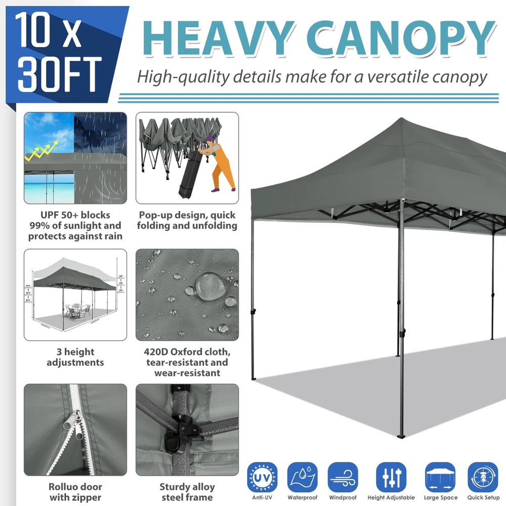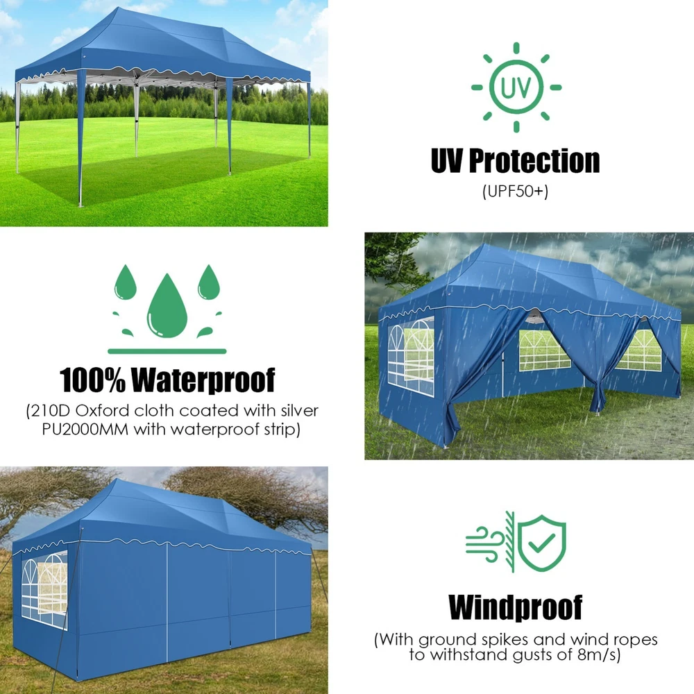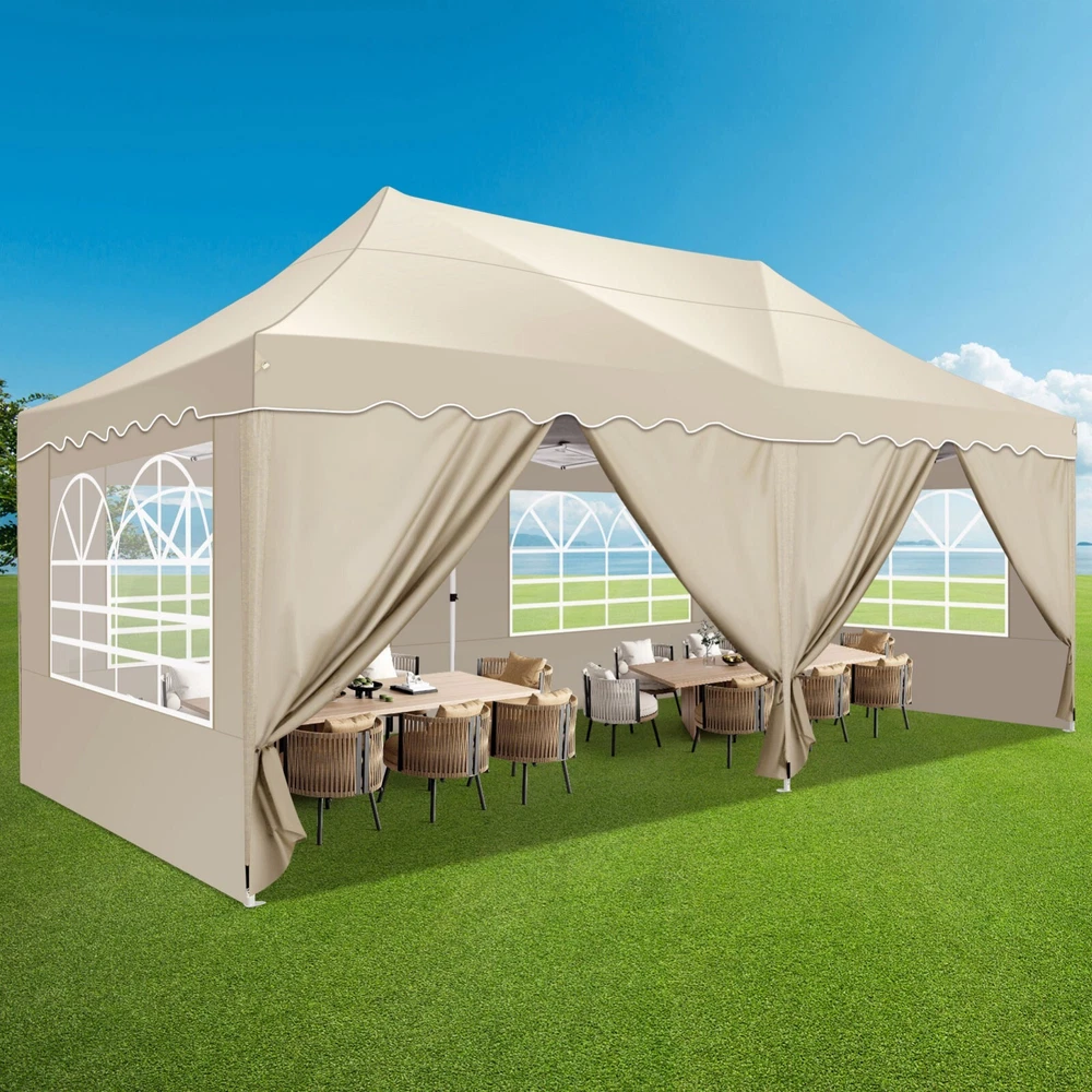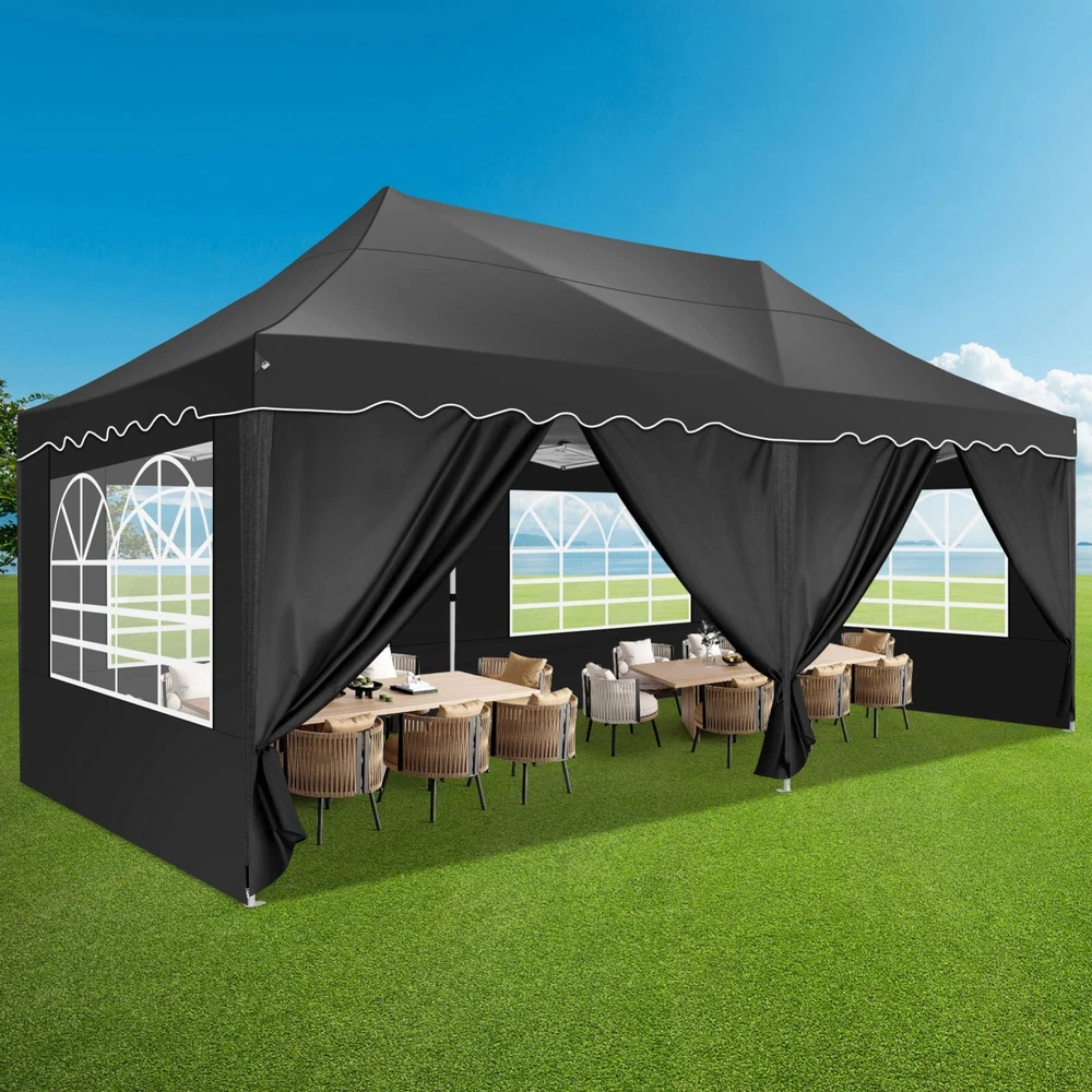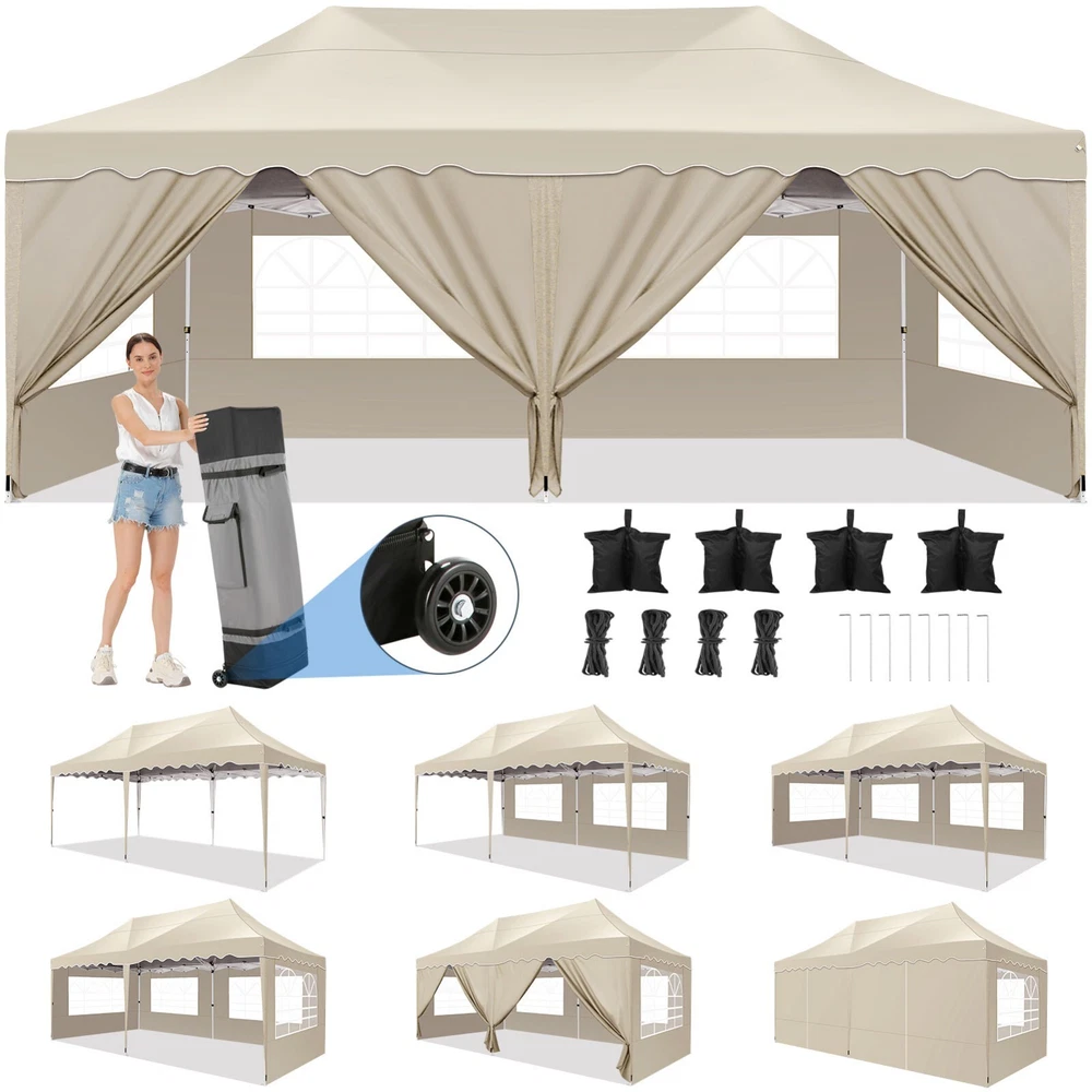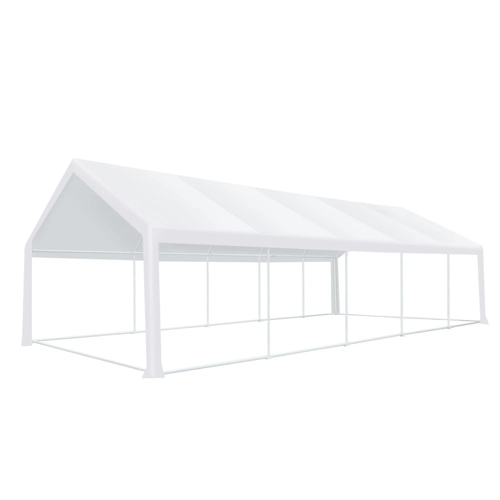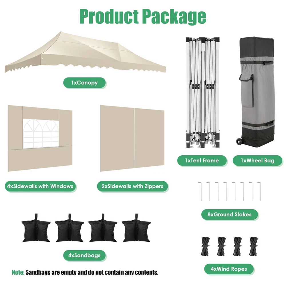Description Heavy Duty 20x40 Event Tent Large Shelter with Removable Sidewalls, Carpas para Fiestas Commercial Outdoor Canopy Wedding Tent Carport, UV 50+, Waterproof About this item 💐 【 Heavy duty Structure & Closed Extra Ground Bars 】party tents 20x40 made from 1.5inch diameter all metal tube frame with elegant white paint coating, preventing chipping, peeling, rust, and corrosion. The stable triangular roof and closed ground link structure make the product more stable and less likely to shake than similar models on the market. Pegs and wind ropes, to make the event tents much safer and more stable. (Please do not use it when the wind is strong). 💐【 20x40 FT Extra Large Size & Versatile Usage 】20x40 tent can hold up to an estimated 50 people for for parties, or weddings, and can also be used as a carport or outdoor storage tent. Straight leg design and cathedral style roof offers an open-air feel for a variety of outdoor activities. Great for tent party, outdoor events, outdoor shelter. 💐【 All Season Tarp & Cathedral Windows 】 This heavy duty party tent top cover is made of heat-sealed, triple-layer 160g polyethylene fabric can Block 99% of Harmful UV Rays, which is waterproof and windproof, rainproof, dustproof and anti-snow, tear resistant etc. Waterproof PVC cathedral windows on the sides provide the tent with bright light and a good view. 💐【 Removable Sidewalls & Excellent Ventilation 】Our wedding tents Comes With 6 removable sidewalls with 12 PVC church windows and 2 zipper doors with windows. The number of the sidewall can be installed freely as needed. Roll-up zipper door and detachable sidewalls for even better ventilation, providing cross ventilation and venting on hot days. Also provides warmth on cold days. 💐【 Easy to Assemble & Warranty 】This waterproof outdoor wedding gazebo does not require additional installation tools. Connectiong with spring bottom simple and easy to use for quick installation. Any problem with any part, you can contact our customer service, we continue to provide you with after-sales service. Please note that this party tent is NOT FIREPROOF, so please keep it away from any fire source. Specifications: Color: White Size:20×40×10.5ft Product Weight: 300lb Weight Bearing: 2000lbs Waterproof: 100% Waterproof Sun Protection Index: UPF 50+ Cover Material: 160g PE Cloth Frame Material: Heavy Duty Metal Wide Usage: Perfect for Parties, Wedding, Camping, Storage, Shelter, marketing events, etc . Party Tent Size 20'X40' Roof style & Canopy material Peak Style Roof & Heat-sealed Triple-layer PE Tarp, Waterproof, UV protection and Tear resistant Pole material Elegant White Painted Steel Pipe, diameter 38mm, thickness 1.0mm, preventing chipping, peeling, rust, and corrosion. Sidewalls 6 Detachable Window Panels with 12 PVC Church Windows; and 2 Detachable Door Panels With Roll- up Zipper Door & 4 PVC Church Windows Party Tent Height 11.5FT to the top, 6.6FTto the edge; Window size: 4.3*4.7FT Note This party tent is NOT FIREPROOF, please stay away from the fire source. More Stability Art-welded Tube Connector; Elastic ball strap fasten the canopy to the frame; Pegs and wind ropes; Weight bags at the four corners of the canopy can add stability Variety Of Applications Perfect for Outdoor Patio Event Parties, Commercial Business Exhibition, Outdoor Wedding Parties, Storage tent, Carport, and so on. For Carport For Commercial Exhibition For Storage Tent For Wedding Tent 10'x30' / 8 Sidewalls 3 x 9m Pop Up Canopy Commercial Tent Eight Sides Three Doors Waterproof Tent Sun Shelter ✨About this item 🌟【Heavy Duty Upgraded Frame】The frame of 10x30 Pop Up Canopy Tent is commercial grade full truss construction made of durable powder coated stainless steel. 32mm/1.26 inch widened pipe diameter, 0.7mm/0.03 inch thickened wall thickness, Stronger and more stable than other normal gazebos on the market. The middle support pole structure can hold up to 220 lbs on a single pole and can withstand up to level 4 wind (18mph), using the included sandbags, ropes and nails for increased carport stability. 🌟【Best Quality Fabric and Sidewalls】10x30 Heavy duty canopy tent is made of 420D Oxford cloth with two layers of PU coating, UPF 50+, blocks 99% of UV rays. Heat-sealed seam technology is used, 100% waterproof, 1500mm waterproof pressure, waterproof effect is better than other general tents. 8 PU coated sidewalls connected by a whole strip of velcro and zipper to attach to the frame top and legs for securing, removable, you can install as many sidewalls as you want, convenient and practical. 🌟【Easy Set up, 3 Adjustable Heights】2-4 people can easily set up and take down 10x20 outdoor party tent canopy in minutes without tools, it can easily accommodate 20-25 people. Just remove the fully assembled frame and top from bag, place fabric over frame, stretch legs, and you're done. Wedding tent gazebo is available in 3 different heights (86.6'', 90.5'', 94.5'') for your choice to ensure adequate headspace. Best thumb latch system is easy to lock and release without pinching your fingers. 🌟【Portable 4 Wheels Roller Bag】Since 10x30 heavy duty pop up canopy tent with sidewalls has a weight of 136 lbs, we offer you a solid and durable 600D Oxford cloth PVC coated roller bag. It has 4 large wheels for standing feet and reinforced handle for easy movement and transportation. Tents for parties, weddings, BBQ, trade shows, sporting events, disaster relief or any outdoor event. Waterproof canopy gazebo are commonly used in commercial areas, playgrounds, patios, beaches, farms, gyms, etc. 🌟【WHAT'S INCLUDED】1x Commercial grade 10x30 Pop up Tent Frame, 1x 10'x30' Canopy Top Cover, 8x PU Coated Panels (5x Sidewalls with Window and 3x Sidewalls with Zipper), 4x 420D Oxford cloth PVC coated Sandbags, 4x Ground Pegs, 6x Wind Ropes, 1x Roller bag, 1x Manual. If you have any questions and doubts, please feel free to contact us, we will 
