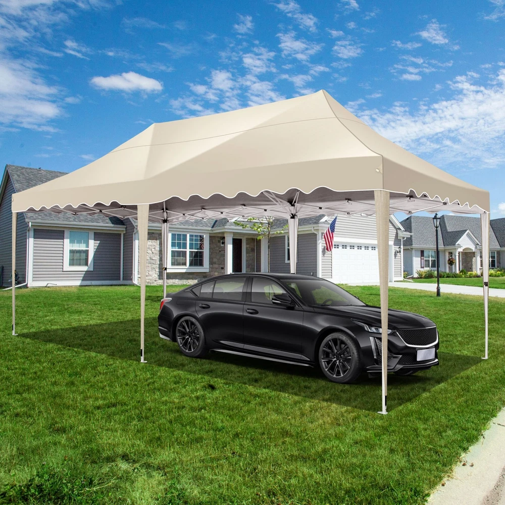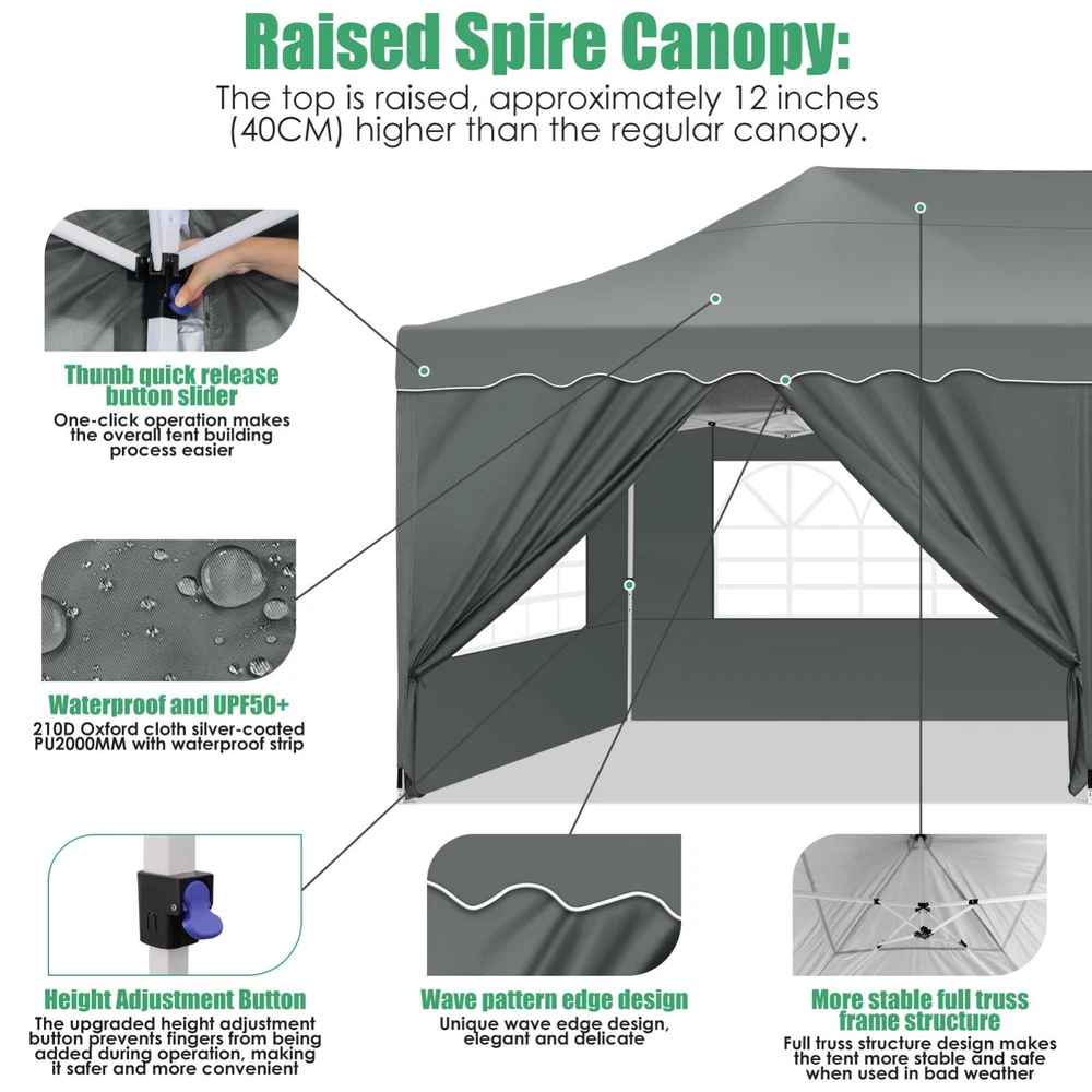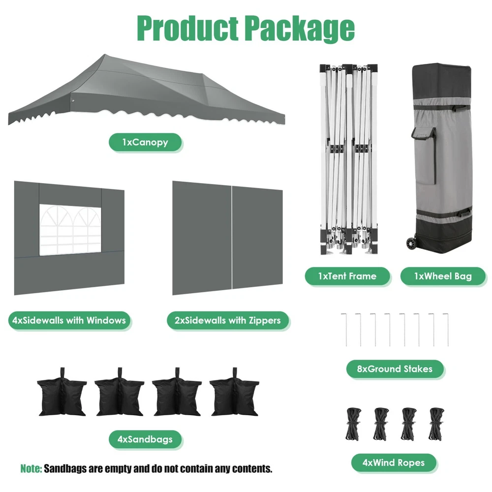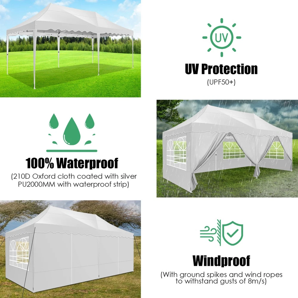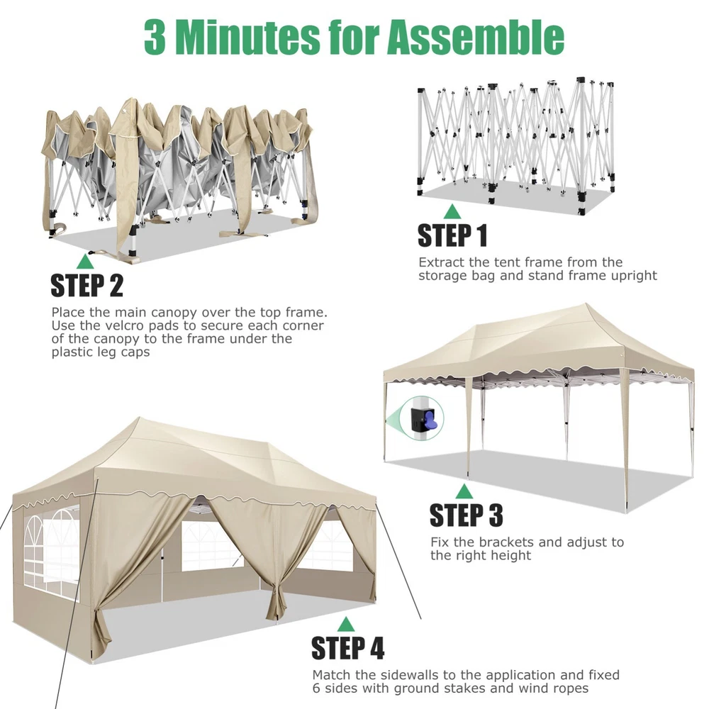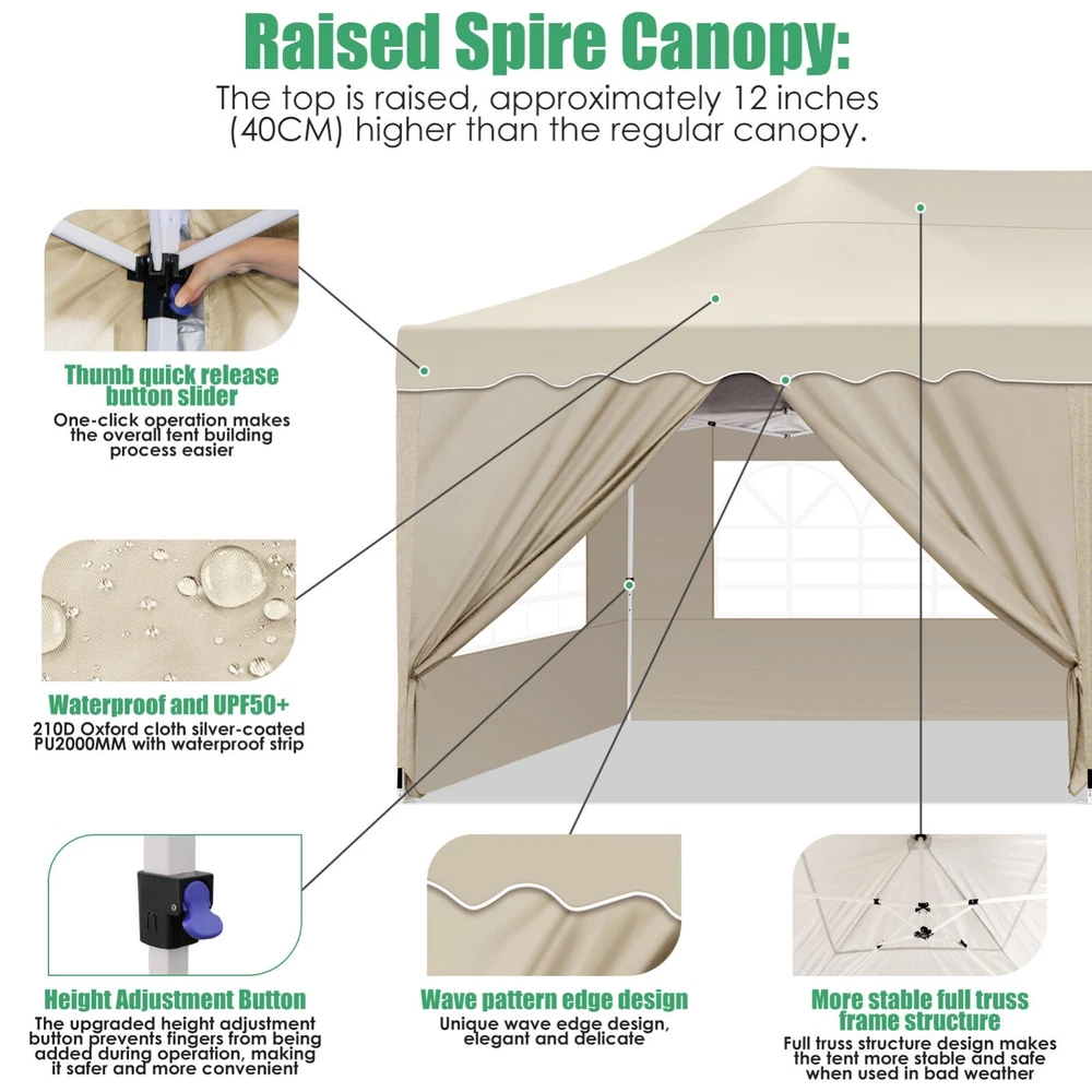 Description Heavy Duty 20x40 Event Tent Large Shelter with Removable Sidewalls, Carpas para Fiestas Commercial Outdoor Canopy Wedding Tent Carport, UV 50+, Waterproof About this item 💐 【 Heavy duty Structure & Closed Extra Ground Bars 】party tents 20x40 made from 1.5inch diameter all metal tube frame with elegant white paint coating, preventing chipping, peeling, rust, and corrosion. The stable triangular roof and closed ground link structure make the product more stable and less likely to shake than similar models on the market. Pegs and wind ropes, to make the event tents much safer and more stable. (Please do not use it when the wind is strong). 💐【 20x40 FT Extra Large Size & Versatile Usage 】20x40 tent can hold up to an estimated 50 people for for parties, or weddings, and can also be used as a carport or outdoor storage tent. Straight leg design and cathedral style roof offers an open-air feel for a variety of outdoor activities. Great for tent party, outdoor events, outdoor shelter. 💐【 All Season Tarp & Cathedral Windows 】 This heavy duty party tent top cover is made of heat-sealed, triple-layer 160g polyethylene fabric can Block 99% of Harmful UV Rays, which is waterproof and windproof, rainproof, dustproof and anti-snow, tear resistant etc. Waterproof PVC cathedral windows on the sides provide the tent with bright light and a good view. 💐【 Removable Sidewalls & Excellent Ventilation 】Our wedding tents Comes With 6 removable sidewalls with 12 PVC church windows and 2 zipper doors with windows. The number of the sidewall can be installed freely as needed. Roll-up zipper door and detachable sidewalls for even better ventilation, providing cross ventilation and venting on hot days. Also provides warmth on cold days. 💐【 Easy to Assemble & Warranty 】This waterproof outdoor wedding gazebo does not require additional installation tools. Connectiong with spring bottom simple and easy to use for quick installation. Any problem with any part, you can contact our customer service, we continue to provide you with after-sales service. Please note that this party tent is NOT FIREPROOF, so please keep it away from any fire source. Specifications: Color: White Size:20×40×10.5ft Product Weight: 300lb Weight Bearing: 2000lbs Waterproof: 100% Waterproof Sun Protection Index: UPF 50+ Cover Material: 160g PE Cloth Frame Material: Heavy Duty Metal Wide Usage: Perfect for Parties, Wedding, Camping, Storage, Shelter, marketing events, etc . Party Tent Size 20'X40' Roof style & Canopy material Peak Style Roof & Heat-sealed Triple-layer PE Tarp, Waterproof, UV protection and Tear resistant Pole material Elegant White Painted Steel Pipe, diameter 38mm, thickness 1.0mm, preventing chipping, peeling, rust, and corrosion. Sidewalls 6 Detachable Window Panels with 12 PVC Church Windows; and 2 Detachable Door Panels With Roll- up Zipper Door & 4 PVC Church Windows Party Tent Height 11.5FT to the top, 6.6FTto the edge; Window size: 4.3*4.7FT Note This party tent is NOT FIREPROOF, please stay away from the fire source. More Stability Art-welded Tube Connector; Elastic ball strap fasten the canopy to the frame; Pegs and wind ropes; Weight bags at the four corners of the canopy can add stability Variety Of Applications Perfect for Outdoor Patio Event Parties, Commercial Business Exhibition, Outdoor Wedding Parties, Storage tent, Carport, and so on. For Carport For Commercial Exhibition For Storage Tent For Wedding Tent 10'x30' / 8 Sidewalls 3 x 9m Pop Up Canopy Commercial Tent Eight Sides Three Doors Waterproof Tent Sun Shelter ✨About this item 🌟【Heavy Duty Upgraded Frame】The frame of 10x30 Pop Up Canopy Tent is commercial grade full truss construction made of durable powder coated stainless steel. 32mm/1.26 inch widened pipe diameter, 0.7mm/0.03 inch thickened wall thickness, Stronger and more stable than other normal gazebos on the market. The middle support pole structure can hold up to 220 lbs on a single pole and can withstand up to level 4 wind (18mph), using the included sandbags, ropes and nails for increased carport stability. 🌟【Best Quality Fabric and Sidewalls】10x30 Heavy duty canopy tent is made of 420D Oxford cloth with two layers of PU coating, UPF 50+, blocks 99% of UV rays. Heat-sealed seam technology is used, 100% waterproof, 1500mm waterproof pressure, waterproof effect is better than other general tents. 8 PU coated sidewalls connected by a whole strip of velcro and zipper to attach to the frame top and legs for securing, removable, you can install as many sidewalls as you want, convenient and practical. 🌟【Easy Set up, 3 Adjustable Heights】2-4 people can easily set up and take down 10x20 outdoor party tent canopy in minutes without tools, it can easily accommodate 20-25 people. Just remove the fully assembled frame and top from bag, place fabric over frame, stretch legs, and you're done. Wedding tent gazebo is available in 3 different heights (86.6'', 90.5'', 94.5'') for your choice to ensure adequate headspace. Best thumb latch system is easy to lock and release without pinching your fingers. 🌟【Portable 4 Wheels Roller Bag】Since 10x30 heavy duty pop up canopy tent with sidewalls has a weight of 136 lbs, we offer you a solid and durable 600D Oxford cloth PVC coated roller bag. It has 4 large wheels for standing feet and reinforced handle for easy movement and transportation. Tents for parties, weddings, BBQ, trade shows, sporting events, disaster relief or any outdoor event. Waterproof canopy gazebo are commonly used in commercial areas, playgrounds, patios, beaches, farms, gyms, etc. 🌟【WHAT'S INCLUDED】1x Commercial grade 10x30 Pop up Tent Frame, 1x 10'x30' Canopy Top Cover, 8x PU Coated Panels (5x Sidewalls with Window and 3x Sidewalls with Zipper), 4x 420D Oxford cloth PVC coated Sandbags, 4x Ground Pegs, 6x Wind Ropes, 1x Roller bag, 1x Manual. If you have any questions and doubts, please feel free to contact us, we will 