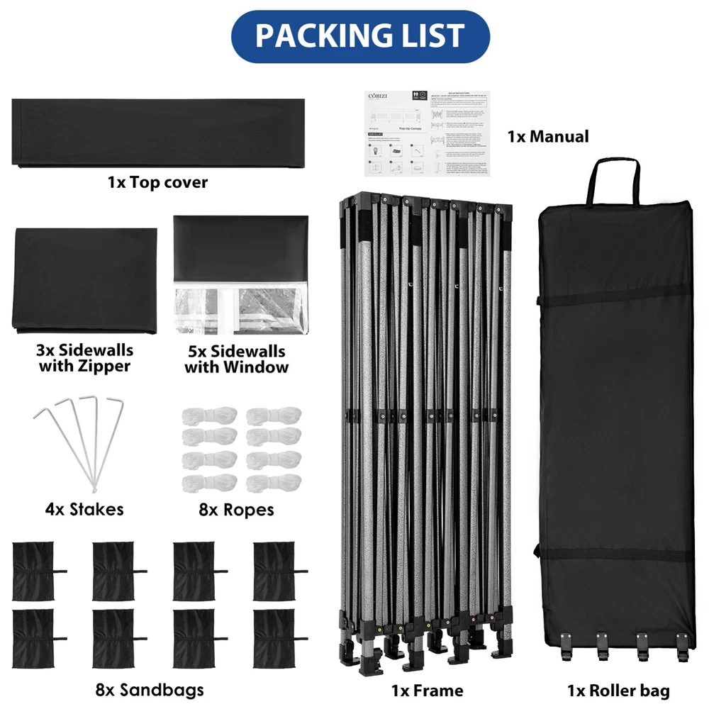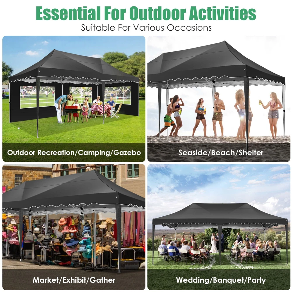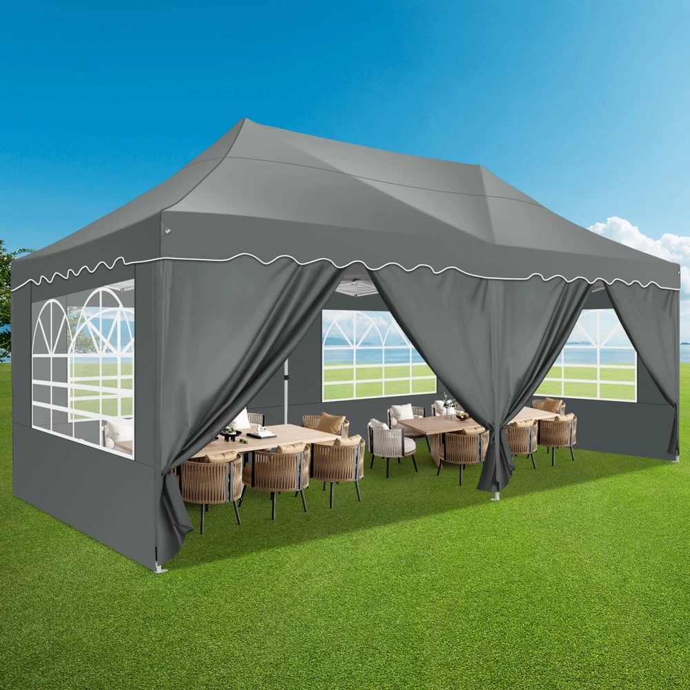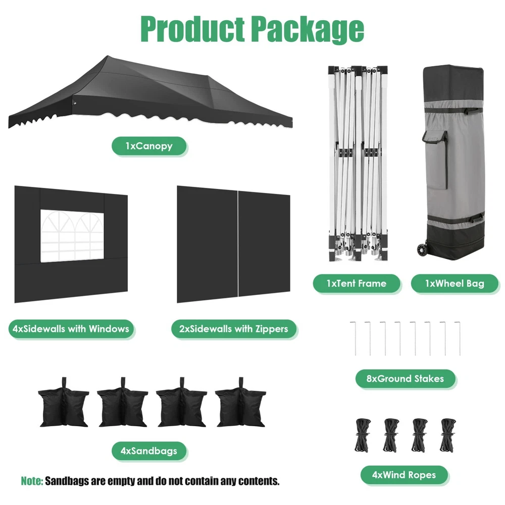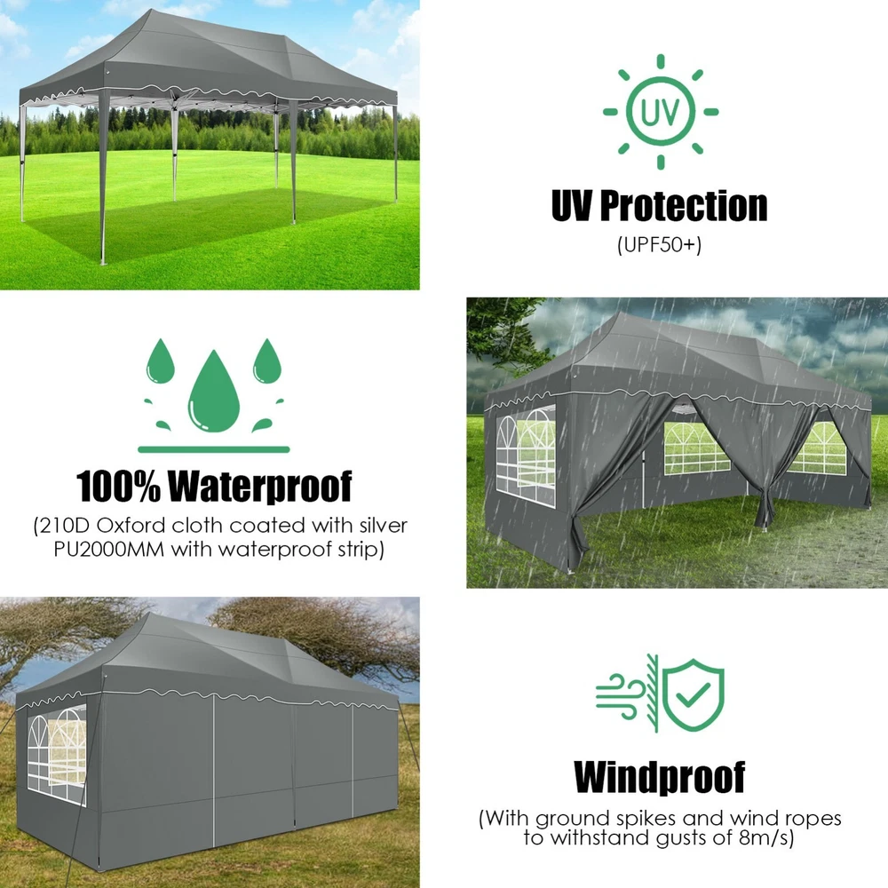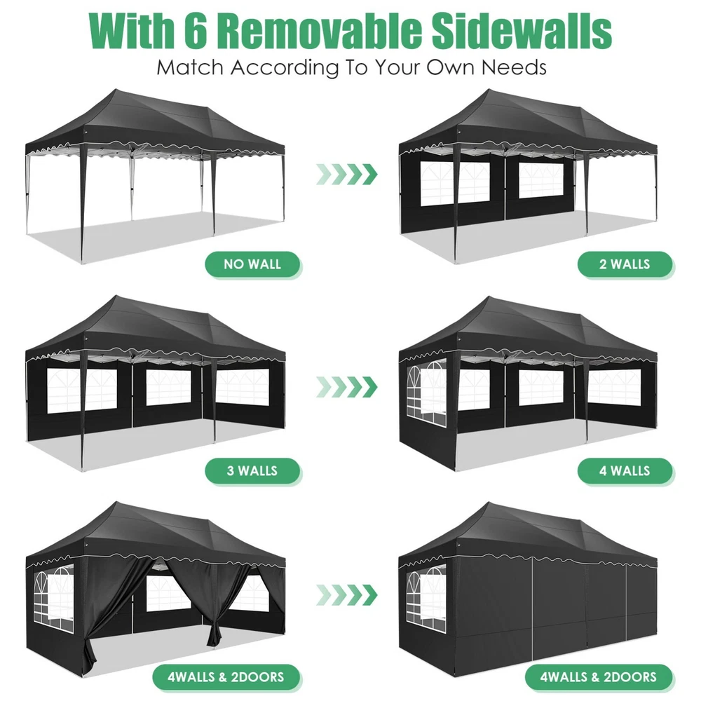 Description Heavy Duty 20x40 Event Tent Large Shelter with Removable Sidewalls, Carpas para Fiestas Commercial Outdoor Canopy Wedding Tent Carport, UV 50+, Waterproof About this item 💐 【 Heavy duty Structure & Closed Extra Ground Bars 】party tents 20x40 made from 1.5inch diameter all metal tube frame with elegant white paint coating, preventing chipping, peeling, rust, and corrosion. The stable triangular roof and closed ground link structure make the product more stable and less likely to shake than similar models on the market. Pegs and wind ropes, to make the event tents much safer and more stable. (Please do not use it when the wind is strong). 💐【 20x40 FT Extra Large Size & Versatile Usage 】20x40 tent can hold up to an estimated 50 people for for parties, or weddings, and can also be used as a carport or outdoor storage tent. Straight leg design and cathedral style roof offers an open-air feel for a variety of outdoor activities. Great for tent party, outdoor events, outdoor shelter. 💐【 All Season Tarp & Cathedral Windows 】 This heavy duty party tent top cover is made of heat-sealed, triple-layer 160g polyethylene fabric can Block 99% of Harmful UV Rays, which is waterproof and windproof, rainproof, dustproof and anti-snow, tear resistant etc. Waterproof PVC cathedral windows on the sides provide the tent with bright light and a good view. 💐【 Removable Sidewalls & Excellent Ventilation 】Our wedding tents Comes With 6 removable sidewalls with 12 PVC church windows and 2 zipper doors with windows. The number of the sidewall can be installed freely as needed. Roll-up zipper door and detachable sidewalls for even better ventilation, providing cross ventilation and venting on hot days. Also provides warmth on cold days. 💐【 Easy to Assemble & Warranty 】This waterproof outdoor wedding gazebo does not require additional installation tools. Connectiong with spring bottom simple and easy to use for quick installation. Any problem with any part, you can contact our customer service, we continue to provide you with after-sales service. Please note that this party tent is NOT FIREPROOF, so please keep it away from any fire source. Specifications: Color: White Size:20×40×10.5ft Product Weight: 300lb Weight Bearing: 2000lbs Waterproof: 100% Waterproof Sun Protection Index: UPF 50+ Cover Material: 160g PE Cloth Frame Material: Heavy Duty Metal Wide Usage: Perfect for Parties, Wedding, Camping, Storage, Shelter, marketing events, etc . Party Tent Size 20'X40' Roof style & Canopy material Peak Style Roof & Heat-sealed Triple-layer PE Tarp, Waterproof, UV protection and Tear resistant Pole material Elegant White Painted Steel Pipe, diameter 38mm, thickness 1.0mm, preventing chipping, peeling, rust, and corrosion. Sidewalls 6 Detachable Window Panels with 12 PVC Church Windows; and 2 Detachable Door Panels With Roll- up Zipper Door & 4 PVC Church Windows Party Tent Height 11.5FT to the top, 6.6FTto the edge; Window size: 4.3*4.7FT Note This party tent is NOT FIREPROOF, please stay away from the fire source. More Stability Art-welded Tube Connector; Elastic ball strap fasten the canopy to the frame; Pegs and wind ropes; Weight bags at the four corners of the canopy can add stability Variety Of Applications Perfect for Outdoor Patio Event Parties, Commercial Business Exhibition, Outdoor Wedding Parties, Storage tent, Carport, and so on. For Carport For Commercial Exhibition For Storage Tent For Wedding Tent 10'x30' / 8 Sidewalls 3 x 9m Pop Up Canopy Commercial Tent Eight Sides Three Doors Waterproof Tent Sun Shelter ✨About this item 🌟【Heavy Duty Upgraded Frame】The frame of 10x30 Pop Up Canopy Tent is commercial grade full truss construction made of durable powder coated stainless steel. 32mm/1.26 inch widened pipe diameter, 0.7mm/0.03 inch thickened wall thickness, Stronger and more stable than other normal gazebos on the market. The middle support pole structure can hold up to 220 lbs on a single pole and can withstand up to level 4 wind (18mph), using the included sandbags, ropes and nails for increased carport stability. 🌟【Best Quality Fabric and Sidewalls】10x30 Heavy duty canopy tent is made of 420D Oxford cloth with two layers of PU coating, UPF 50+, blocks 99% of UV rays. Heat-sealed seam technology is used, 100% waterproof, 1500mm waterproof pressure, waterproof effect is better than other general tents. 8 PU coated sidewalls connected by a whole strip of velcro and zipper to attach to the frame top and legs for securing, removable, you can install as many sidewalls as you want, convenient and practical. 🌟【Easy Set up, 3 Adjustable Heights】2-4 people can easily set up and take down 10x20 outdoor party tent canopy in minutes without tools, it can easily accommodate 20-25 people. Just remove the fully assembled frame and top from bag, place fabric over frame, stretch legs, and you're done. Wedding tent gazebo is available in 3 different heights (86.6'', 90.5'', 94.5'') for your choice to ensure adequate headspace. Best thumb latch system is easy to lock and release without pinching your fingers. 🌟【Portable 4 Wheels Roller Bag】Since 10x30 heavy duty pop up canopy tent with sidewalls has a weight of 136 lbs, we offer you a solid and durable 600D Oxford cloth PVC coated roller bag. It has 4 large wheels for standing feet and reinforced handle for easy movement and transportation. Tents for parties, weddings, BBQ, trade shows, sporting events, disaster relief or any outdoor event. Waterproof canopy gazebo are commonly used in commercial areas, playgrounds, patios, beaches, farms, gyms, etc. 🌟【WHAT'S INCLUDED】1x Commercial grade 10x30 Pop up Tent Frame, 1x 10'x30' Canopy Top Cover, 8x PU Coated Panels (5x Sidewalls with Window and 3x Sidewalls with Zipper), 4x 420D Oxford cloth PVC coated Sandbags, 4x Ground Pegs, 6x Wind Ropes, 1x Roller bag, 1x Manual. If you have any questions and doubts, please feel free to contact us, we will 
