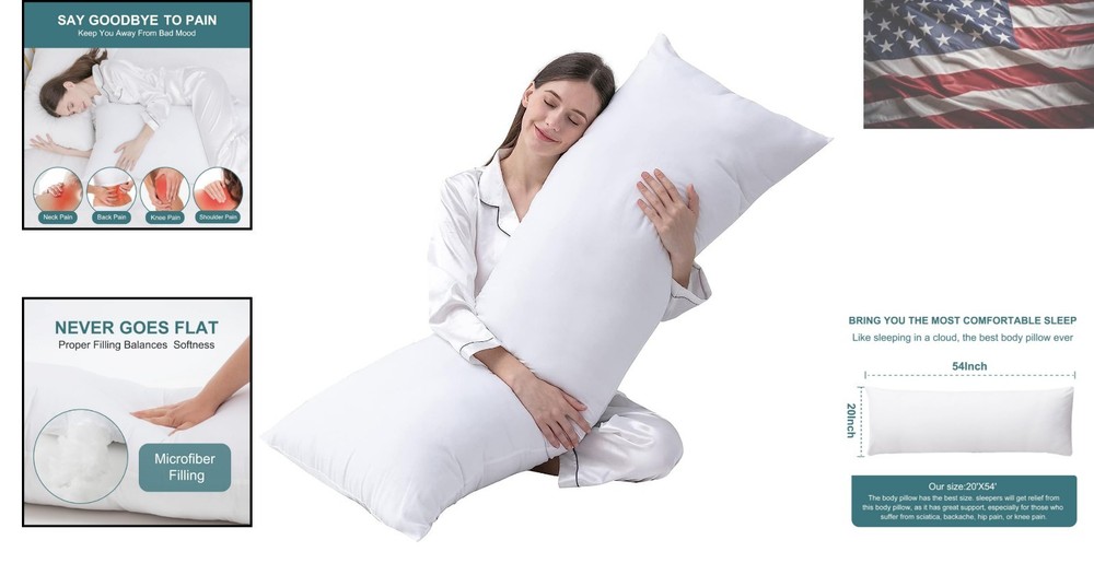 20x54 Inch Polyester Body Pillow Insert - Comfort and Breathability ‹ › ‹ › ‹ › ‹ › ‹ › ‹ › ‹ › ‹ › 20x54 Inch Polyester Body Pillow Insert Experience Comfort and Breathability Features: Ultra full body pillow insert made from 100% polyester. Extra breathable and soft fabric for ultimate comfort. Durable construction that avoids piling, ensuring long-lasting use. Large and soft design maintains its shape while providing medium firm support. Perfect for daily use, catering to multiple sleeping styles. Designed for side sleepers; measures 20 inches by 54 inches. Machine washable for easy care; wash in cold water, do not bleach, tumble dry low if needed. Fluffy and supportive without a pillowcase. Backed by a for your peace of mind. Benefits: Reduces the need for multiple bulky pillows by providing comprehensive support. Relieves pressure on various areas of the body for a more restful sleep. Enjoy a smooth and comfortable sleep, waking up energized and refreshed. Ideal for anyone looking to enhance their sleep experience. Why Choose Our Body Pillow Insert? Transform your sleep experience with our 20x54 Inch Polyester Body Pillow Insert, expertly designed for those who value comfort and support. This ultra- insert is not only exceptionally soft and breathable but also durable enough to provide you with long-lasting comfort. With its medium firm support, it is perfect for anyone seeking to relieve pressure and enhance their overall sleep quality. Don't miss out on a luxurious sleep experience. Invest in your rest with our body pillow insert, and if it doesn't meet your expectations, simply out for a full refund, no questions asked. Order yours today and embrace the comfort you deserve! Shipping Free & Fast Shipping - We offer free shipping to most of the USA with a normal delivery time of 3-7 days. However, due to the current situation, additional delivery time (up to 3 weeks) may be required for some items. Alternative Carriers - We may use alternative carriers (e.g. USPS, FedEx, UPS, etc.) to ensure your package arrives safely and on time. Due to the use of multiple carriers, we are unable to provide a tracking number automatically. Handling Time - Orders are processed and shipped within 1-2 business days of receiving cleared payment. Shipping Restrictions - Shipping to Alaska, Hawaii, Puerto Rico, Guam, and other US territories may incur shipping charges or delivery restrictions. Please contact us before ordering, or your order can be refunded/cancelled. State Restrictions - There may be restrictions based on your state of purchase. For example, certain items may not be shipped to California due to state regulations. Contact for Tracking Updates - If you require tracking updates or have any concerns about the delivery of your order, please feel free to contact us, and we will be happy to assist you. Return 30-Day Hassle-Free Returns - We want you to be completely satisfied with your purchase. If you are not, you can return the item within 30 days of receiving it for a full refund or exchange. Easy Return Process - To start a return, simply contact us and we will provide you with a prepaid return shipping label and detailed instructions. Restocking Fee - There are no restocking fees for returns. However, the buyer is responsible for return shipping costs if the return is not due to a seller's error. Refund Processing Time - Refunds will be processed within 5 business days of receiving the returned item in its condition. Payment We accept all major credit cards, PayPal, and Apple Pay for your convenience. Your payment information is secure and encrypted to ensure a safe and seamless transaction. Please complete your payment within 3 days of purchase to avoid any delays in shipping. Feedback Your feedback is extremely important to us. We strive to provide the best products and customer service possible. If you are satisfied with your purchase, please take a moment to leave us a positive review. If you have any concerns or issues with your order, please contact us before leaving negative feedback. We are committed to resolving any problems and ensuring your satisfaction. Contact Us If you have any questions or concerns, please feel free to out to our customer support team. You can contact us through the eBay messaging system. We are available Monday to Friday, 9:00 am to 5:00 pm EST, and we will do our best to respond to your inquiry within 24 hours. Buy it now and enjoy a pleasant shopping experience! Unit Quantity: 1 Material: Cotton,Polyester Features: Machine Washable,Breathable,Soft Care Instructions: Machine Wash,Do Not Bleach,Tumble Dry Low If Needed,Wash Dark Colors Separately Department: Unisex Baby & Toddler,Kids,Teens,Adults Room: Bedroom Size: 20 x 54 in Type: Body Pillow Fill Material: 100% Polyester Color: White Shape: Rectangular Pattern: Solid Style: Modern Closure Type: No Closure Thread Count: 200 or Less GSM (Grams per Square Meter): Below 150