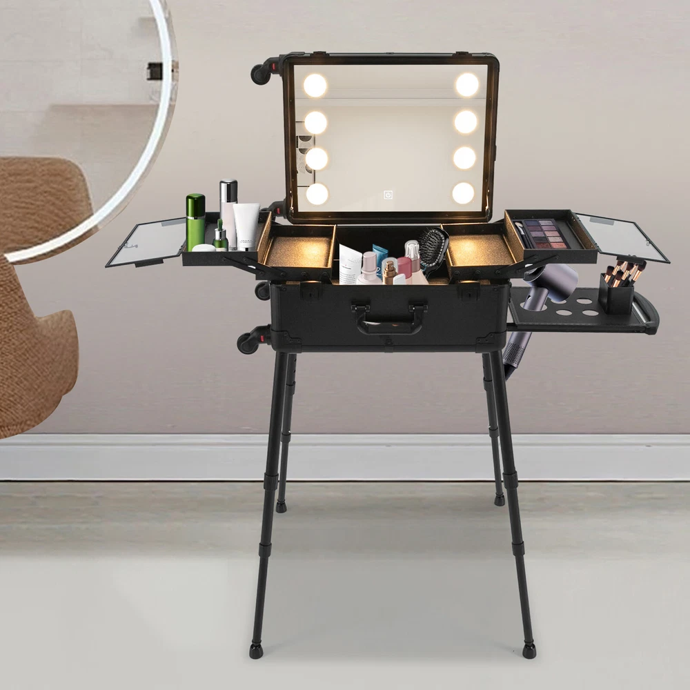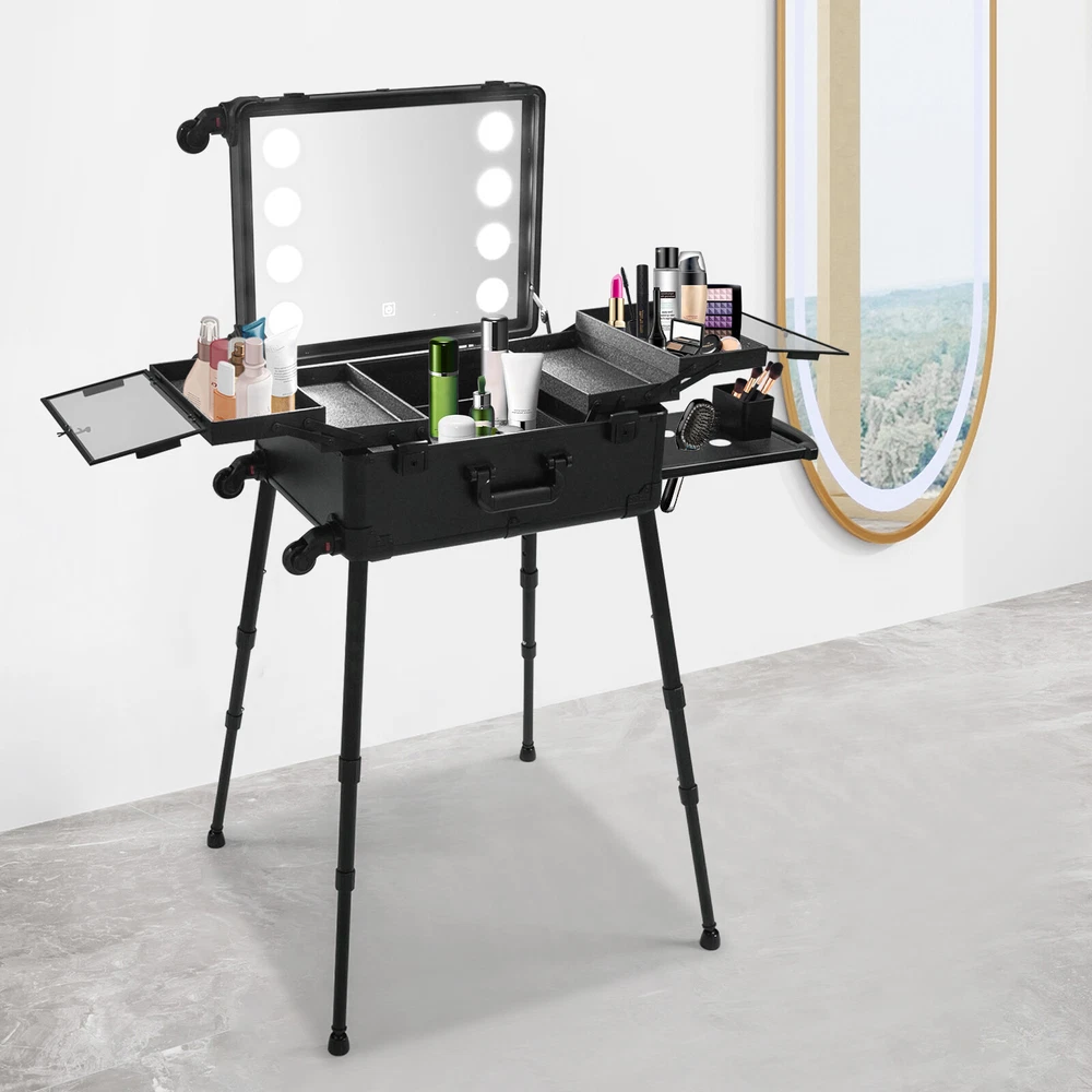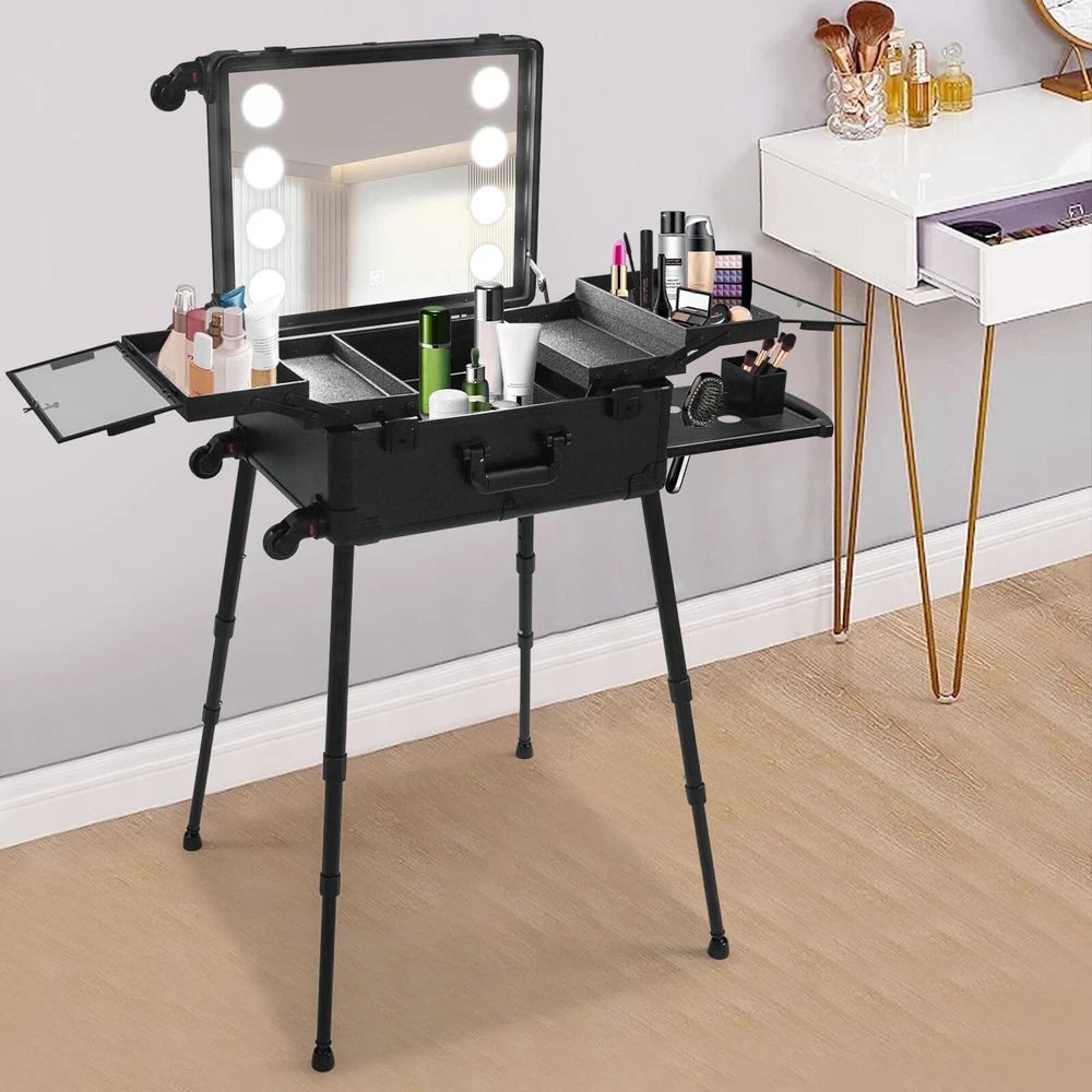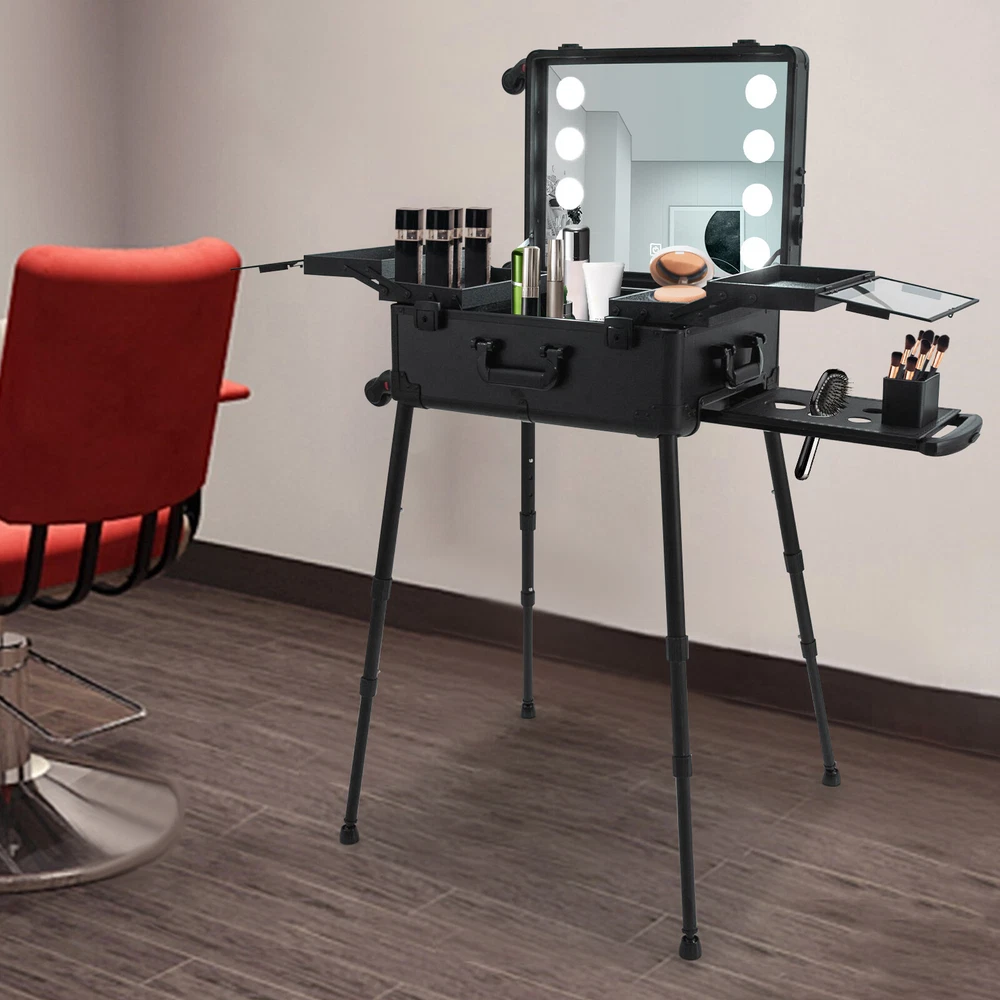 21 Inch Makeup Train Case Travel Cosmetic Organizer Case Rolling Make-up Case Description Are you still struggling with not being able to pack your makeup when you go out? Come and take a look at our makeup case! It's designed for professional cosmetologists to get their makeup done anywhere, anytime. It has an extra-large main case and 4 compartments, together with the minimalist style, universal wheels, convenient invisible legs and a comfortable top carry handle to make your daily makeup work more convenient. Come and bring it home! Key Features High-quality Material: Made of fireproof board, aluminum alloy, PP with a frosted process, this product is corrosion-resistant, wear-resistant, and waterproof, ensuring your long-term use. Sorted Storage: The inner box has 4 compartments for storing nail polish, lipstick, makeup brushes, eyeliners or combs (all not included). The porous storage board holds a hair dryer, curling iron (neither included) and more to keep your belongings neatly organized. Flexible Movement: Four easy-to-move universal wheels, a telescopic trolley rod, and a side handle make it easy to get the case up and down stairs, in and out of cars and elevators. Makeup Assistant: High-definition glass, eight LED lights, adjustable brightness, and three adjustable light colors (white, warm yellow and neutral) help you see more details of your makeup and restore the true state of your makeup. Adjustable Legs Height: With the 4-gear height-adjustable support legs(15.35-33.46in), you can find the height that suits you best to have enjoyable makeup without back pain. Protect Your Privacy: It is equipped with locks and two keys to protect the valuables inside the box and maximize your privacy and property security. Thoughtful Design: The edges and corners fixed with multiple rivets are collision-resistant and drop-resistant, effectively protecting the product. In addition, the support feet can be easily installed when needed or removed and stored at the bottom of the case when not in use. Easy to Clean: A simple construction and smooth surface make this product easy to clean, you just need a towel (not included)and water to easily remove dust and residue. Ideal Gift: Its classic design and large capacity make this product a great gift to your mother, girlfriend, sisters, wife, and loved ones so that they can enjoy more convenient makeup time. Protective Package: To prevent damage to the product due to bumps in transit, we place bubble bags and foam to protect the product as much as possible. Details Comfortable Handle: The top handle gives you a secure and comfortable grip without slipping. Clear Lids: They are both dustproof and serve as a display for you to see the contents at a glance. 4 Non-slip Foot Seats: They prevent the case from touching the floor directly without getting dirty and cut up, while enhancing the stability of the product without slipping. Practical Socket and Charging Ports: They can be used to charge hair dryers, curling irons and cell phones (not included). In addition, their protective covers keep rain or other debris out. Application Professional makeup artists, hairdressers, beauticians, manicurists, beauty lovers, etc. can use this product to store cosmetics and makeup tools. It is ideal for makeup contests, wedding makeup scenarios, travel makeup, outdoor shooting, cinemas, dressing rooms, crew, tourism, beauty salons, and more. Specifications Color: Black Style: Modern Shape: Rectangle Material: Fireproof Board, Aluminum Alloy, PP Process: Frosted Assembly Required: Yes Mount Type: Freestanding Plug Type: US Standard Voltage: 110V Wheel: Removable Universal Wheel Carrying Method: Hand-held, Hand-pulled Light Color: Warm Yellow, Neutral, White Makeup Mirror Control Method: Touch-in Light Source: 8 LEDs(Included) Legs Adjustable Height: 4 Gears(39-85cm/15.35-33.46in) Power Cord Length: 1.8m/5.91ft Drawbar Length: 40cm/15.75in USB Cable Length: 97cm/38.19in Number of Universal Wheels:4 Number of Compartments: 4 Gross Weight: 12.5kg/27.56lbs Net Weight: 11kg/24.25lbs Makeup Mirror Size(L*W): 45*35cm/17.72*13.78in Makeup Mirror Diagonal Length: 55cm/21.65in Each Compartment Size: 27*14.5*2.5cm/10.63*5.71*1in Main Case Height: 11cm/4.33in Product Height: 138cm/54.33in Package Size: 60*50*30cm/23.62*19.68*11.81in Package Included 1* Makeup Case 1* USB Cable 1* Power Cord 4* Universal Wheels 4* Legs 1* Storage Board 2* Keys 1* English Manual Notes Please note that this product does not include any other items. This product is an 8-light model without Bluetooth function. The support legs need to be tightened slightly before being supported. The service wear of the case is a normal phenomenon. In the process of daily use, please try to avoid excessive impact and drop to extend the lifespan of the product. Please use soft tools and water to clean. Please keep away from corrosive liquids. Please avoid long-term exposure to the sun. Please clear the wheels in time to maintain smooth movement. Please read the English manual completely before use. Please allow the slight color difference caused by the shooting light and the 1-3 cm error due to manual measurement, and make sure you do not mind before ordering. Payment Delivery details Terms of sales About us Contact us Payment We accept ebay payment 。 Fees such as import duties, taxes are not included in the item price or shipping costs. These charges are the buyer's responsibility. Delivery details Shipping: 2-9 working days to: USA Terms of sales We maintain high standards of excellence and strive for hundred percent customer satisfaction. Feedback is very important to us. We hope that you contact us immediately before you give neutral or negative feedback, so that we can address your concerns. It is impossible to address issues if we do not know about them! About us Your satis faction is our ultimate goal. We work hard to earn your trust and future business. Our certified technicians have tested each item before 