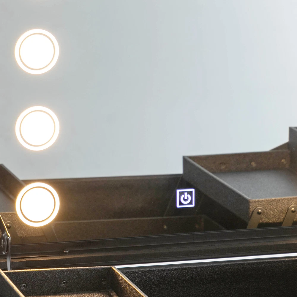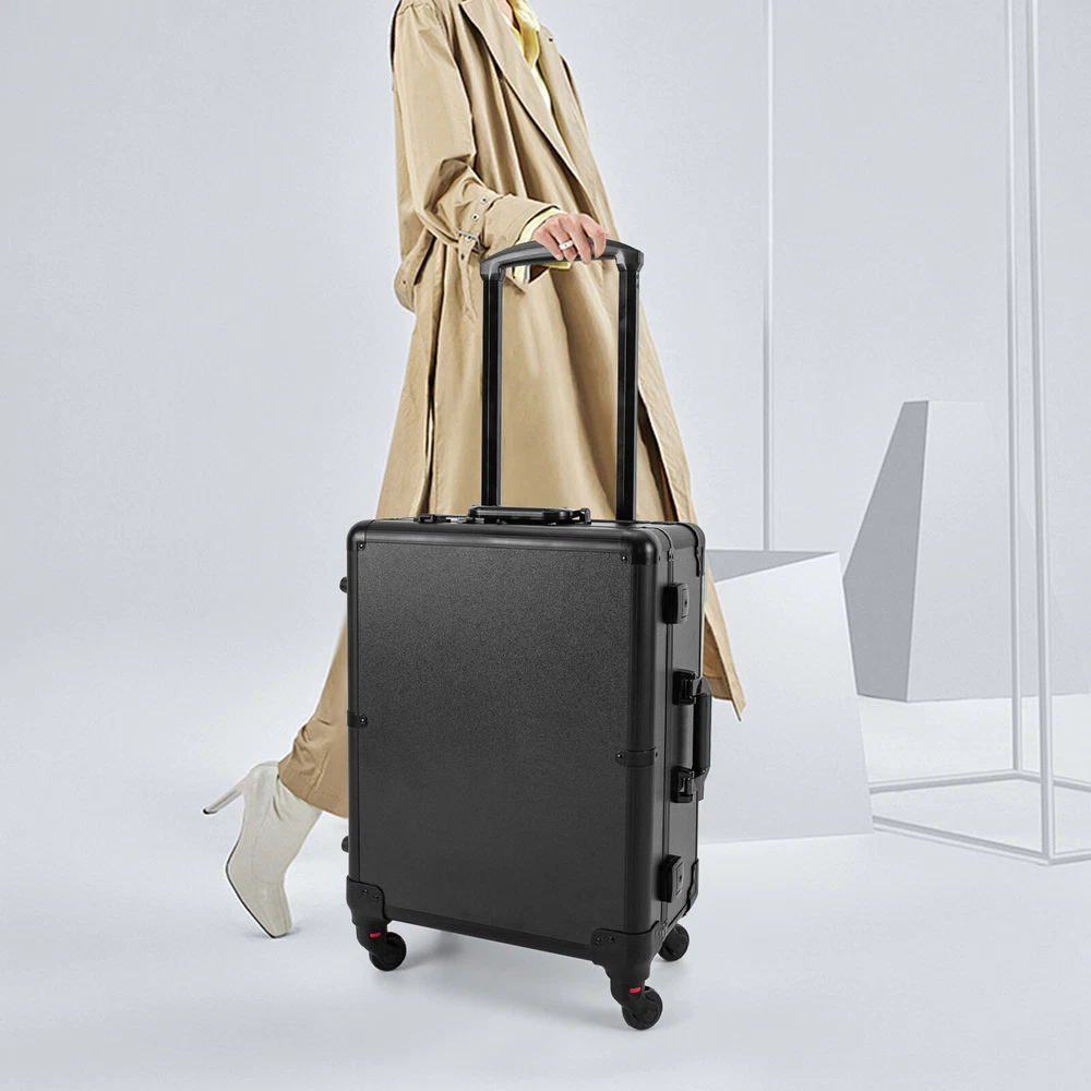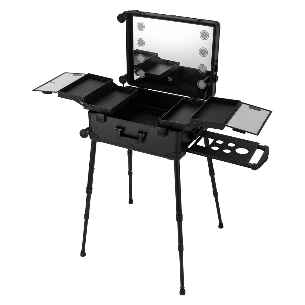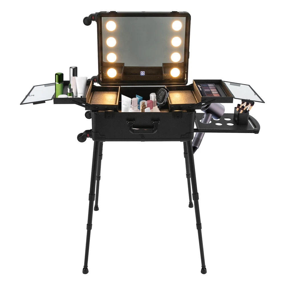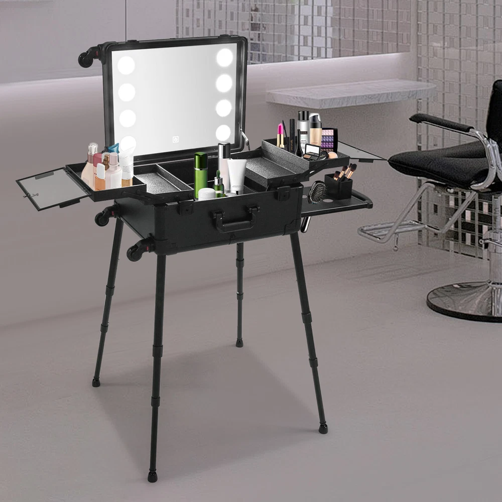 21 Inch Makeup Train Case Travel Cosmetic Organizer Case Rolling Make-up Case Description Are you still struggling with not being able to pack your makeup when you go out? Come and take a look at our makeup case! It's designed for professional cosmetologists to get their makeup done anywhere, anytime. It has an extra-large main case and 4 compartments, together with the minimalist style, universal wheels, convenient invisible legs and a comfortable top carry handle to make your daily makeup work more convenient. Come and bring it home! Key Features High-quality Material: Made of fireproof board, aluminum alloy, PP with a frosted process, this product is corrosion-resistant, wear-resistant, and waterproof, ensuring your long-term use. Sorted Storage: The inner box has 4 compartments for storing nail polish, lipstick, makeup brushes, eyeliners or combs (all not included). The porous storage board holds a hair dryer, curling iron (neither included) and more to keep your belongings neatly organized. Flexible Movement: Four easy-to-move universal wheels, a telescopic trolley rod, and a side handle make it easy to get the case up and down stairs, in and out of cars and elevators. Makeup Assistant: High-definition glass, eight LED lights, adjustable brightness, and three adjustable light colors (white, warm yellow and neutral) help you see more details of your makeup and restore the true state of your makeup. Adjustable Legs Height: With the 4-gear height-adjustable support legs(15.35-33.46in), you can find the height that suits you best to have enjoyable makeup without back pain. Protect Your Privacy: It is equipped with locks and two keys to protect the valuables inside the box and maximize your privacy and property security. Thoughtful Design: The edges and corners fixed with multiple rivets are collision-resistant and drop-resistant, effectively protecting the product. In addition, the support feet can be easily installed when needed or removed and stored at the bottom of the case when not in use. Easy to Clean: A simple construction and smooth surface make this product easy to clean, you just need a towel (not included)and water to easily remove dust and residue. Ideal Gift: Its classic design and large capacity make this product a great gift to your mother, girlfriend, sisters, wife, and loved ones so that they can enjoy more convenient makeup time. Protective Package: To prevent damage to the product due to bumps in transit, we place bubble bags and foam to protect the product as much as possible. Details Comfortable Handle: The top handle gives you a secure and comfortable grip without slipping. Clear Lids: They are both dustproof and serve as a display for you to see the contents at a glance. 4 Non-slip Foot Seats: They prevent the case from touching the floor directly without getting dirty and cut up, while enhancing the stability of the product without slipping. Practical Socket and Charging Ports: They can be used to charge hair dryers, curling irons and cell phones (not included). In addition, their protective covers keep rain or other debris out. Application Professional makeup artists, hairdressers, beauticians, manicurists, beauty lovers, etc. can use this product to store cosmetics and makeup tools. It is ideal for makeup contests, wedding makeup scenarios, travel makeup, outdoor shooting, cinemas, dressing rooms, crew, tourism, beauty salons, and more. Specifications Color: Black Style: Modern Shape: Rectangle Material: Fireproof Board, Aluminum Alloy, PP Process: Frosted Assembly Required: Yes Mount Type: Freestanding Plug Type: US Standard Voltage: 110V Wheel: Removable Universal Wheel Carrying Method: Hand-held, Hand-pulled Light Color: Warm Yellow, Neutral, White Makeup Mirror Control Method: Touch-in Light Source: 8 LEDs(Included) Legs Adjustable Height: 4 Gears(39-85cm/15.35-33.46in) Power Cord Length: 1.8m/5.91ft Drawbar Length: 40cm/15.75in USB Cable Length: 97cm/38.19in Number of Universal Wheels:4 Number of Compartments: 4 Gross Weight: 12.5kg/27.56lbs Net Weight: 11kg/24.25lbs Makeup Mirror Size(L*W): 45*35cm/17.72*13.78in Makeup Mirror Diagonal Length: 55cm/21.65in Each Compartment Size: 27*14.5*2.5cm/10.63*5.71*1in Main Case Height: 11cm/4.33in Product Height: 138cm/54.33in Package Size: 60*50*30cm/23.62*19.68*11.81in Package Included 1* Makeup Case 1* USB Cable 1* Power Cord 4* Universal Wheels 4* Legs 1* Storage Board 2* Keys 1* English Manual Notes Please note that this product does not include any other items. This product is an 8-light model without Bluetooth function. The support legs need to be tightened slightly before being supported. The service wear of the case is a normal phenomenon. In the process of daily use, please try to avoid excessive impact and drop to extend the lifespan of the product. Please use soft tools and water to clean. Please keep away from corrosive liquids. Please avoid long-term exposure to the sun. Please clear the wheels in time to maintain smooth movement. Please read the English manual completely before use. Please allow the slight color difference caused by the shooting light and the 1-3 cm error due to manual measurement, and make sure you do not mind before ordering. Payment Delivery details Terms of sales About us Contact us Payment We accept ebay payment 。 Fees such as import duties, taxes are not included in the item price or shipping costs. These charges are the buyer's responsibility. Delivery details Shipping: 2-9 working days to: USA Terms of sales We maintain high standards of excellence and strive for hundred percent customer satisfaction. Feedback is very important to us. We hope that you contact us immediately before you give neutral or negative feedback, so that we can address your concerns. It is impossible to address issues if we do not know about them! About us Your satis faction is our ultimate goal. We work hard to earn your trust and future business. Our certified technicians have tested each item before 