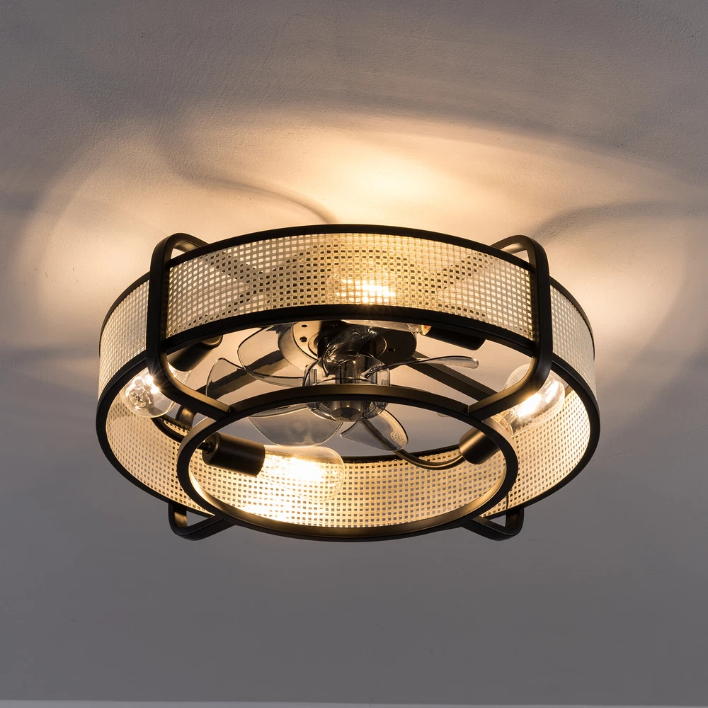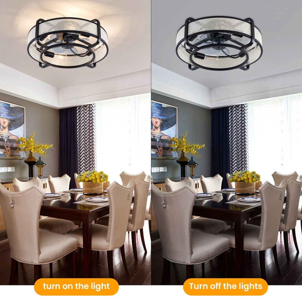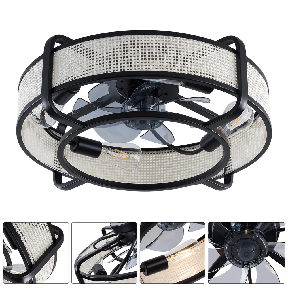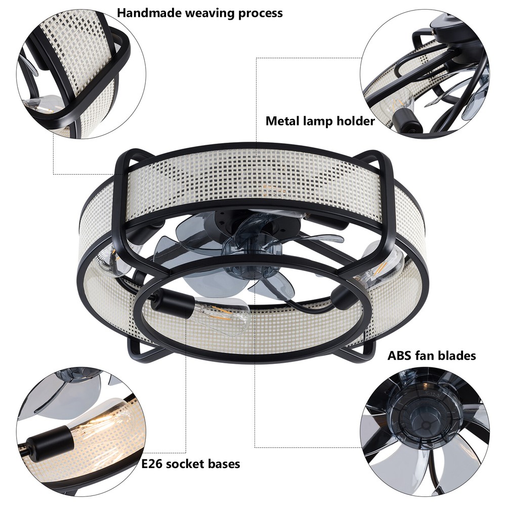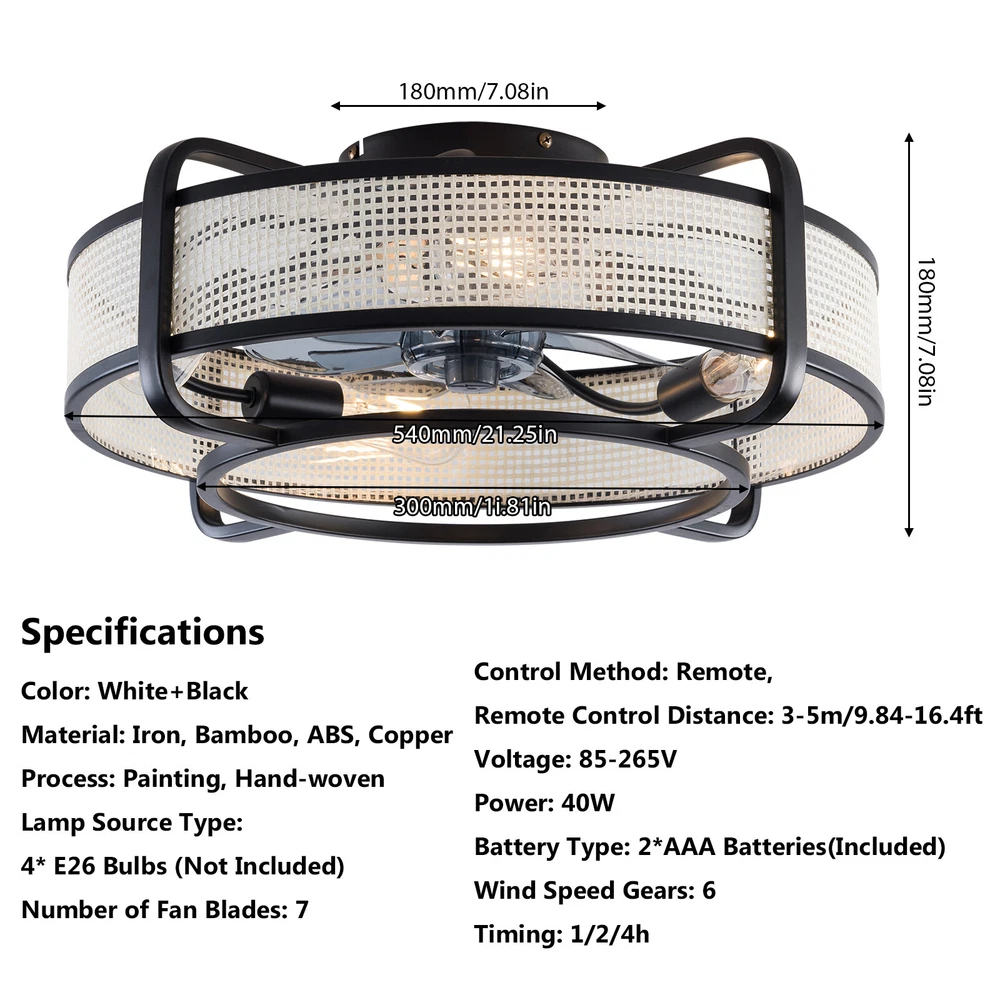 Description This ceiling fan light allows you to feel the bright light and enjoy the coolness at the same time. It has six gears of wind speeds with a timing function to meet your daily usage needs, and you can also reverse the direction of fan rotation in winter. It can be integrated with different decoration styles and is ideal to create an excellent life and sleep environment to accompany you in all seasons. Key Features Embrace Smart Life: With the intelligent remote control, you can freely adjust the wind speed (6th gear), lighting, and setting time (1/2/4 hour) while lying in bed within 16.4ft, avoiding catching a cold and saving electricity bills. Healthy and Energy-saving: The ceiling fan light provides more comprehensive air circulation and cooling, thereby reducing the fr Welcome Description This ceiling fan light allows you to feel the bright light and enjoy the coolness at the same time. It has six gears of wind speeds with a timing function to meet your daily usage needs, and y ou can also reverse the direction of fan rotation in winter. It can be integrated with different decoration styles and is ideal to create an excellent life and sleep environment to accompany you in all seasons. Key Features Embrace Smart Life : With the intelligent remote control, you can freely adjust the wind speed (6th gear), lighting, and setting time (1/2/4 hour) while lying in bed within 16.4ft, avoiding catching a cold and saving electricity bills. Healthy and Energy-saving: The ceiling fan light provides more comprehensive air circulation and cooling, thereby reducing the frequency and time of air conditioning use, saving energy, and reducing expenses. It can avoid direct blowing and reduce the risk of air conditioning diseases. Build to Last: It is made of iron, ABS, and bamboo and adopts a painting and hand-woven processes, which is corrosion-resistant , strong, durable, and not easy to deform, so it can remain beautiful and practical for a long time. High Safety: Fan blades are hidden in a semi-enclosed lampshade, which can allow for unobstructed lighting and air supply to avoid accidents caused by getting caught in the blades. The multiple heat dissipation holes and wide voltage (85-265V) design can effectively ensure safety and extend product life, so you can use it with confidence. Multiple Functions: Integrating lighting and fans, illuminating the space while balancing room temperature, it has become a new choice for home fashion! You can also reverse the direction of the fan rotation in winter, blowing hot air from the top into the room and increasing the indoor temperature. Classic Appearance: Classic colors, lampshade with handmade bamboo weaving, and round shape make it eye-catching and can be a good decoration to blend in with different decor styles and add color to your room. Easy to Clean : The smooth surface and simple structure allow you to clean it with a dry cloth, saving you lots of time and effort. Excellent Gift: The beautiful appearance and good practicality make it a great gift for parents, friends, and lovers on birthdays, holidays, and housewarming. Protective Packaging: The foam can effectively reduce the normal impact and ensure that this item is fully delivered to you to the greatest extent. Guaranteed Customer Service: We aim to provide quality products and services. If you have problems, please feel free to contact us. We will reply and solve the problem for you as soon as possible. Details Round Base: The large round base with a diameter of 7.09in increases stress area, and can make the item fixed firm without falling easily. Pure Copper Motor: It has stable performance, low-temperature rise, and 35db low noise, providing a quiet working and sleeping environment. Standard Lamp Holder: The standard E26 lamp holder can support the use of LEDs, Halogens, etc., making it very convenient for you to purchase and replace. Application It is ideal for the living room, dining room, kitchen, study bedroom, small bedroom, conference room, and other places of 107.64-161.46ft² . It is also suitable for sloping ceilings. Specifications Color: White+Black Material: Iron, Bamboo, ABS, Copper Style: Classic Process: Painting, Hand-woven Lamp Source Type: 4* E26 Bulbs(Not Included) Motor Type: Pure Copper Motor Assembly Required: Yes Mounting Type: Ceiling Mount Number of Fan Blades: 7 Number of Items: 1 Control Method: Remote, Wall Switch(Not Included) Remote Control Distance: 3-5m/ 9.84-16.4ft Voltage: 85-265V Power: 40W Battery Type: 2*AAA Batteries(Included) Wind Speed Gears: 6 Timing: 1/2/4h Efficiency: E Suitable Area: 10-15㎡/ 107.64-161.46ft² Noise: 35dB Base Diameter : 18cm/7.09in Overall Product Height: 18cm/7.09in Overall Lampshade Diameter: 54cm/21in Lampshade Opening Diameter: 30cm/11.81in Package Included 1* Ceiling Fan Light 1* English Manual 1* Remote Control 2* AAA Batteries All Accessories for Assembly Notes For a safe and secure installation, please ensure that the electrical box is firmly mounted and properly attached to a structural part of the building. Please make sure that all wires are connected. When unpacking, be careful not to pull with the wires as a bad connection may result. Please do not turn on the power until fully assembled. We recommend installation by professionals. This product does not include a light bulb. Please prepare four E26 bulbs in advance. Please do not install the lamp next to the air conditioner or heater, which will affect the service life of the lamp. Please wear electric insulation gloves(not included) and avoid scratching the surface of the lamp plate and the electric wire when installing. Please make sure that the power supply has been cut off before installation, and conduct a power test before installation. Please use the lamp within the applicable voltage range and clean lamps regularly. Please cut off the power supply when you clean the light or replace light bulbs. Please wipe with a soft and dry cloth, it is not suitab