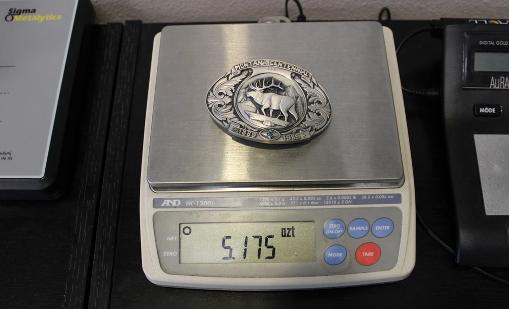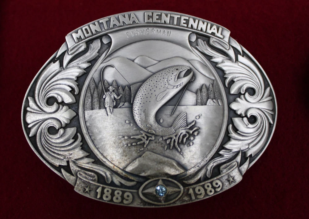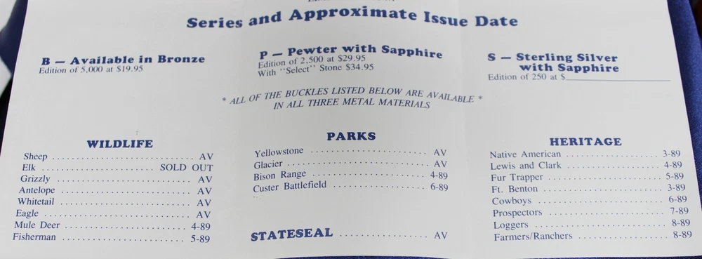 A complete set of (21) Montana Centennial sterling silver belt buckles commemorating the hundred year anniversary of Montana's statehood. While they made 5000 bronze buckles (which trade between $50-100) they only made 250 sterling examples. This is #250 of 250. Were told its one of only two complete sets with the other located at the Charlie Russell museum in Great Falls MT. Each buckle is over 5ozt of sterling silver with a quality MT sapphire. The sapphires were supplied by Adair's Jewelry in Missoula, MT who provided a hand written appraisal of $11k in 2001! Worth note the appraisal states that if a buckle were removed and it wasn't a complete set the value drops to $1500-2k. (2001 money) So it is a big deal to have full set and we are not interested in breaking it up. We are asking $5500 which puts each buckle at only $262 a piece. Shipping would be fedex at around $50. These came over the counter at our brick and mortar store in Helena, MT. You can call us with questions. Our phone # is on card in pics. (didn't want to write here in case of spam) Awesome set don't expect it to last long. Thanks for looking.