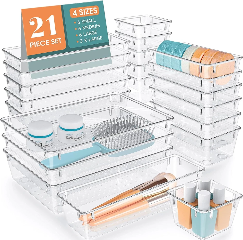 Premium Material:The drawer organizer is made of non-toxic plastic which may be safely used.The transparent design makes it easy to find what you need quickly. 4 Combinations of Different Sizes: A set of cabinet organizer includes 21 storage bins of 4 different sizes. Includes: 9 x 6 x 1.8 inches (3pcs), 9 x 3x 1.8 inches(6pcs), 6 x 3 x 1.8 inches(6pcs), 3 x 3 x 1.8 inches(6cps). You can customize the combination to customize your own drawers. Long Lasting and Non-Slip: The plastic has 3-5 times the impact strength of other materials and is robust. The bottom of the storage organizers has a non-slip design to prevent the tray from moving around when the drawer is opened and closed. Stackable Design: These clear storage bins stack into one other to help maximize your space. Use them side by side to keep organized. The clear color allows you to save time and find what you need quickly and easily. Variety Storage Ways: These versatile Drawer Divider trays fit any part of your home. Suitable for all kinds of drawers, such as dresser / bathroom / kitchen / office. Ideal choice for organizing cosmetics, pins, hair accessories, jewelry, office supplies, craft supplies, utensils, etc. Product Description Safe Materials These drawer organizers are made of plastic; a non-toxic and tasteless plastic which can be safely used for food packaging. Non-Slip Inside Design The bottom of the organizer has a non-slip design to prevent the items of the box from sliding. Stackable Design To help maximize your space, storage may be stacked. The transparent design allows you to quickly locate stored materials. Non-Slip Outside Design There are four support point on the bottom of each plastic organizer bin to prevent the drawer from moving when pulling. Safe Materials Non-Slip Inside Design Stackable Design Non-Slip Outside Design Kitchen Organizer Makeup Organizer Office Organizer