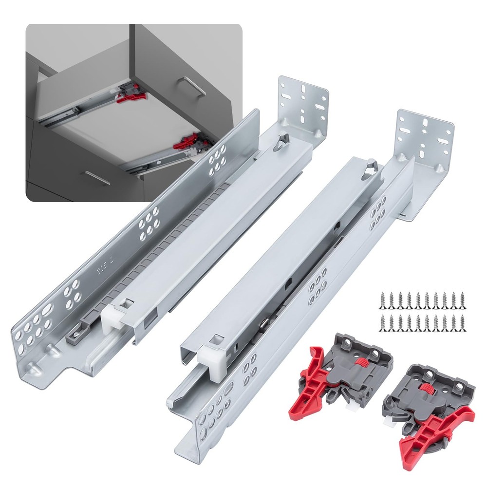 Soft Close Undermount Drawer Slides - 21 Inch Experience the Perfect Blend of Functionality and Elegance! Key Features: Soft Close & Full Extension: Enjoy a gentle, quiet closing with our hydraulic damper technology, creating a serene environment in your home. Durable Material: Crafted from high-quality galvanized steel, these heavy-duty slides can support up to 100 LB, ensuring long-lasting performance. Safe & Aesthetic Design: The concealed slide rail enhances the beauty of your furniture while improving safety by being positioned at the bottom of the drawer. Versatile Installation: Compatible with both panel (frameless) and face frame (framed) cabinets, making it easy to integrate into your existing setup. Package Includes: 1 pair (2 packs) of 21 inch undermount drawer slides Rear mounting brackets 1D adjustable locking device Mounting screws and detailed installation instructions Please Note: For optimal performance, refer to the size specifications in the product images before purchasing. Customer Satisfaction Guaranteed: Your satisfaction is our priority! If you encounter any quality issues with our drawer slides, please reach out to us for prompt assistance.