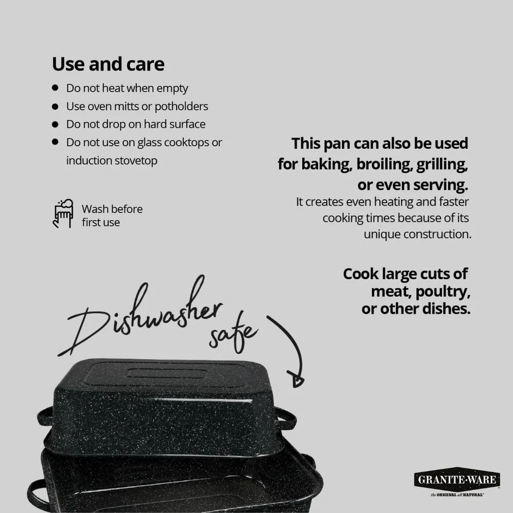 Spacious Capacity: This rectangle roaster provides ample room for roasting up to 25 lbs of poultry or meat, making it ideal for larger meals, family gatherings, or holiday feasts. Superior Heat Retention: The speckled black enamel surface of this rectangle roaster locks in heat, ensuring even cooking and perfect browning for roasts up to 25 lbs, whether you're preparing meats or vegetables. Chemical-Free Cooking: The porcelain enamel surface has naturally nonstick suface and free from harmful chemicals like PFOA and PTFE, allowing you to cook your favorite dishes with confidence and ease. Multi-Use Roasting Pan with Lid: This rectangle roaster can be used for roasting, baking, and grilling, while the lid also doubles as a separate roaster, offering added versatility for various cooking techniques. Convenient Cleaning: After cooking, simply place the roaster in the dishwasher for a hassle-free clean-up, making after-dinner chores quick and easy.