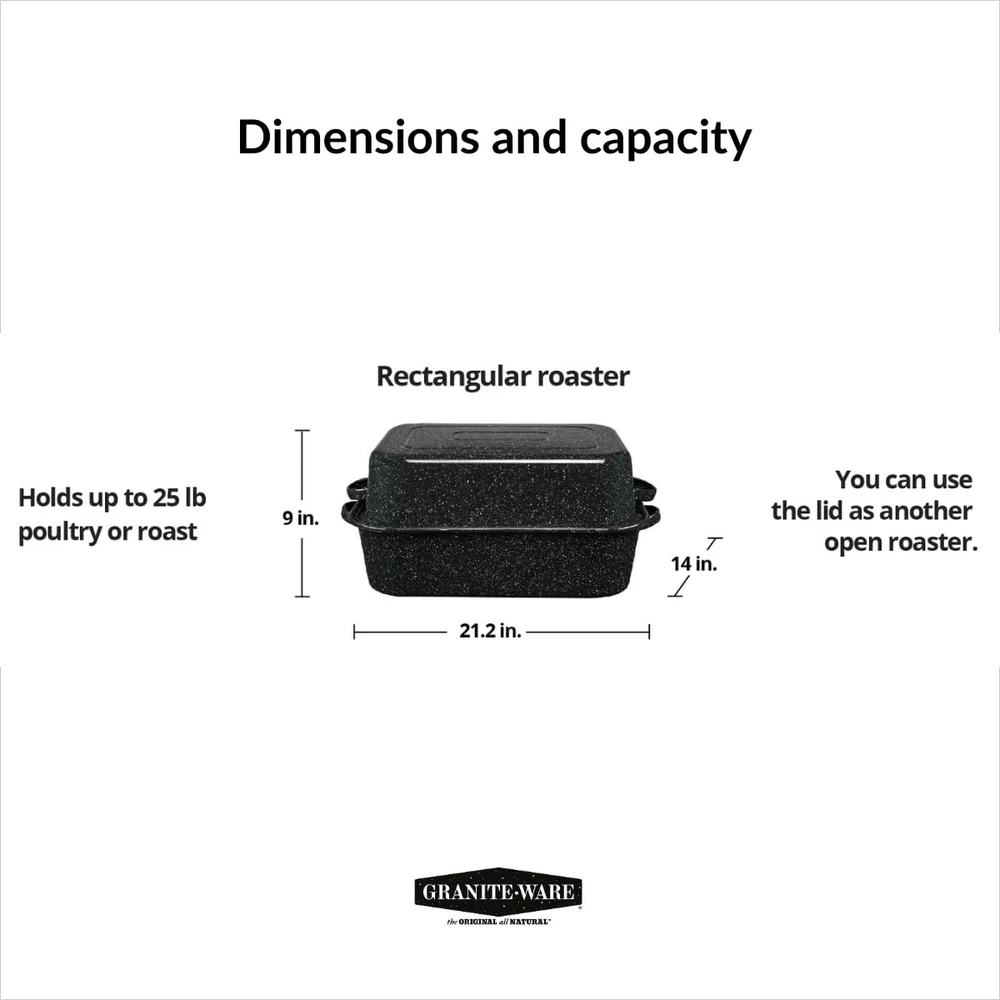 Model Name: Granite Ware 21 In Oven Rectangular Capacity: 25.0 Color: Speckled Black Unit Count: 1.0 Stove Type Compatibility: Does not apply Material: Porcelain, Steel Is Dishwasher Safe: Yes Brand: Granite Ware Item Shape: Rectangular UPC: 072495005112 Weight: 6.0 Pounds Care Instructions: Do Not Heat When Empty, Use Oven Mitts Or Potholders Customer Package Type: Standard Packaging gtin13: 7922470150722 Package Dimensions LxWxH: 20.0x13.5x6.5 Inches EAN: 7922470150722 Size: 21.25 Inches Type: Does not apply Pattern: Solid Item Package Quantity: 1 Included Components: Granite Ware 21 In Oven Finish Type: Painted Style: Covered Rectangular Roaster ISBN: 7922470150722