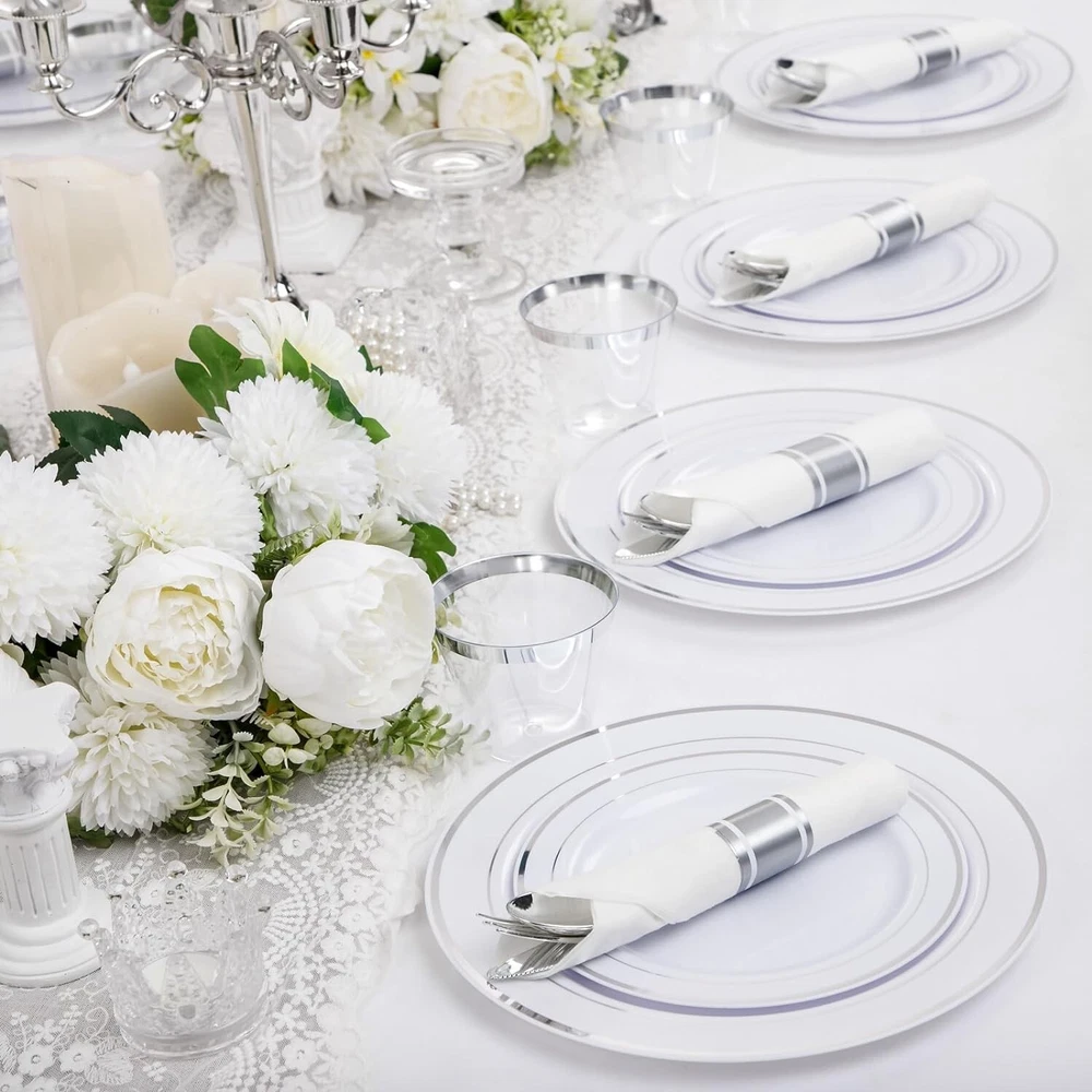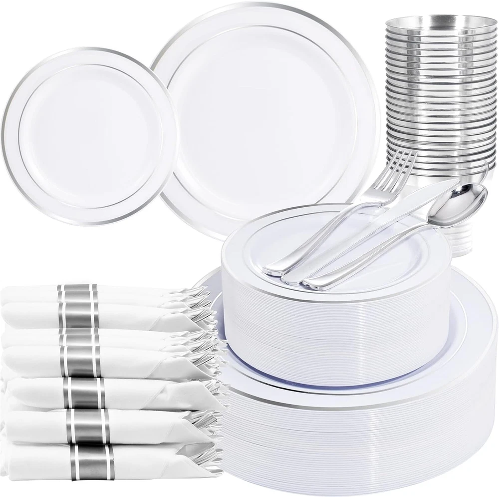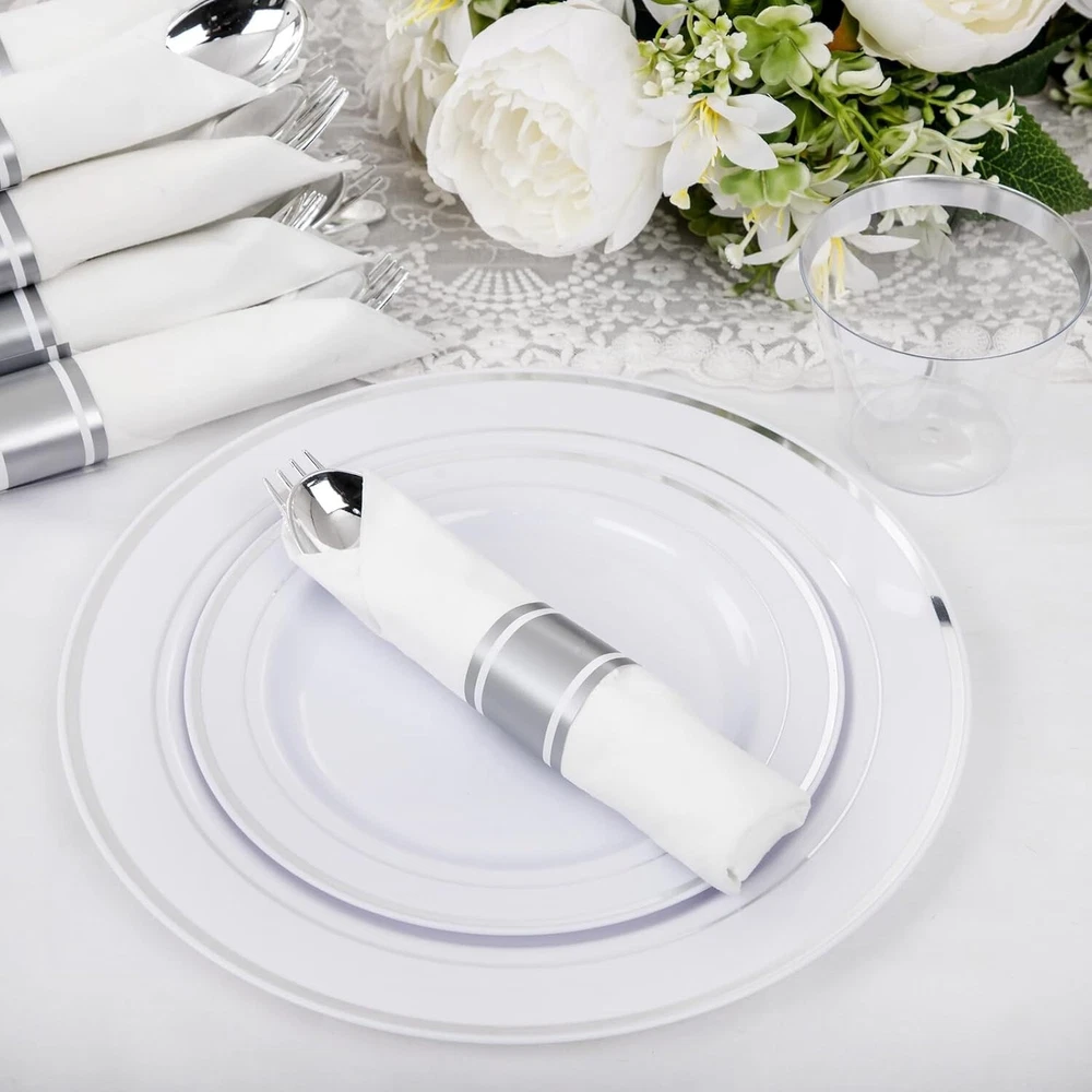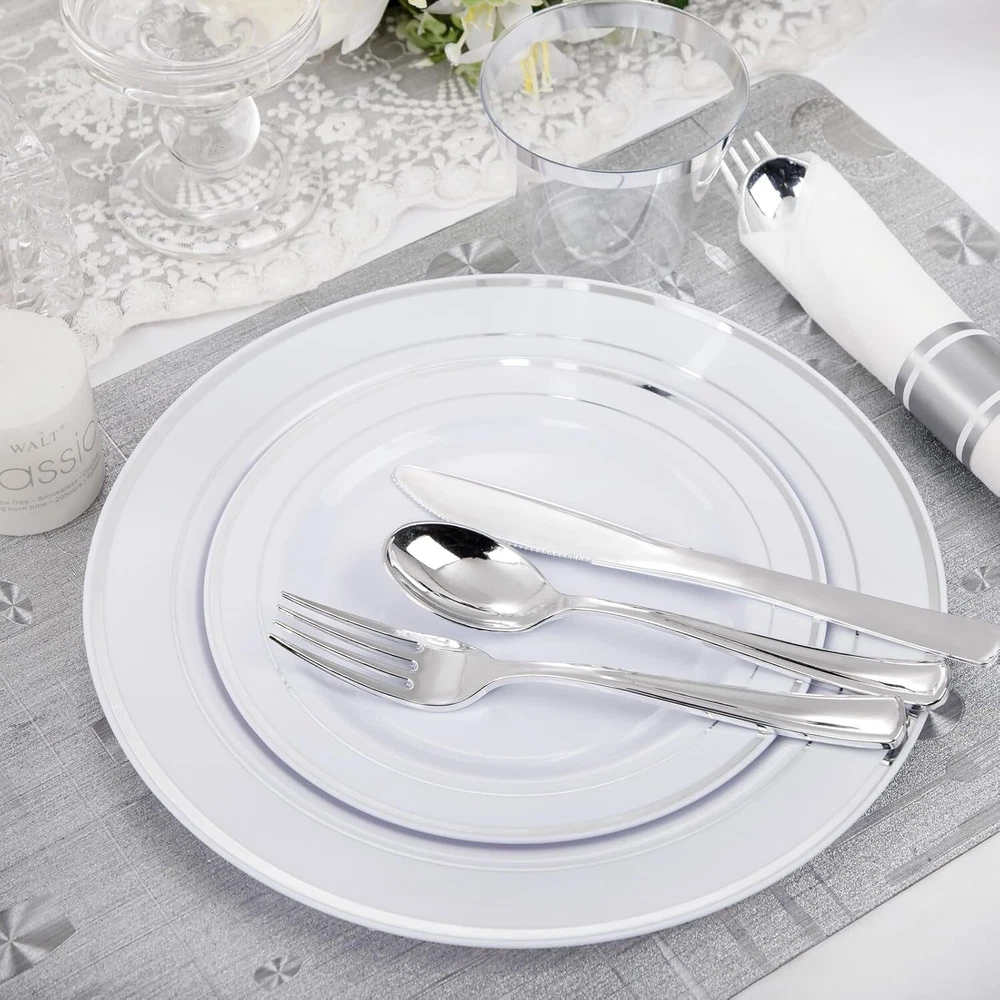 210 Piece Silver Plastic Dinnerware Set for 30 Guests, Plastic Plates for Party, Include: 30 Dinner Plates, 30 Dessert Plates, 30 Pre Rolled Napkins with Silver Silverware and 30 Cups WHAT YOU GET - 210pcs silver party plates sets for 30 guests with 30 " dinner plates, 30 " salad plates, 30 paper napkins, 30 9oz cups, 30 knives, 30 forks, and 30 spoons IDEAL FOR PARTIES - With plastic plates for party, you can easily host a party without worrying about the cleanup at the end. You can throw them in the trash after use. These silver plastic party plates are great for weddings, holidays, baby showers, business parties, Thanksgiving, Halloween, and Christmas dinners STURDY & DURABLE - These heavy-duty party plates and cups and napkins sets are made of hard plastic and are thick enough to avoid deformation or breaking from plates, knives, and forks. They can handle hot, cold, and wet food without leaks or spills BPA FREE - These disposable plates and napkins party supplies are made of food-grade, reusable plastic that is non-toxic and 100% BPA-free. If you need to reuse the wedding plates with silver rim, simply wash these party supplies with water. Note: These party plates aren't recommended to be placed in the microwave or dishwasher SINCERE SERVICE: If you have any unpleasant shopping experience about our plastic plates, welcome to contact me by , we will give your reply as soon as possible