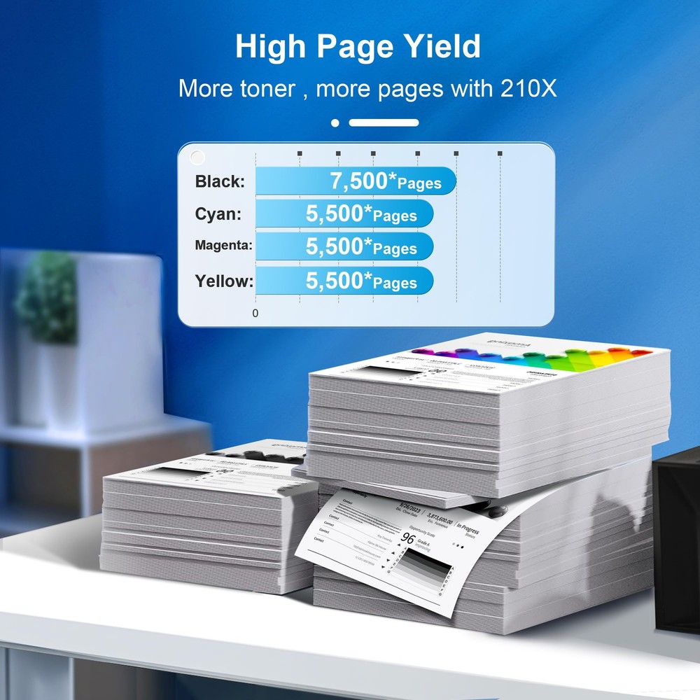 210X Toner Cartridges 4 Pack: Replacement for HP 210A Toner Cartridges - for HP 210X Work with HP Color Laserjet Pro MFP 4301fdw 4301fdn 4201dw 4201dn 4301 Series Printer | 210X W2100X ; With Smart Chips: 210X toner cartridge replacement for hp 210x toner cartridges hp 210x is equipped with smart chips. No need to transfer OEM chips from hp 210a or hp 210x and ensure great compatibilty for HP 210A Toner Cartridges ; Compatible with Printer: for hp color laser jet pro mfp 4301fdw, MFP 4301dw, MFP 4301fdn, Color Pro MFP 4201dw 4201dn series printer. Replacement for hp color laserjet pro mfp 4301fdw toner cartridges ; High Page Yield: Up to 7,500 pages per 210X W2100X Black toner. Up to 5,500 pages per 210X Color toner, based on 5% coverage, Letter/A4, high yield Version replacement for hp 210a toner cartridges ; Package Contents: 210x toner cartridges 4 pack including 1 X 210A Black, 1 X 210X Cyan, 1 X 210X Magenta, 1 X 210X Yellow and 1 X User Guide ; Excellent Performance: 210X toner replacement for hp 210a toner cartridges hp 210x deliver superior printing results with vivid colors and clear prints. Save time by avoiding common printing problems such as streaks, smudges, and leaking With Smart Chips: 210X toner cartridge replacement for hp 210x toner cartridges hp 210x is equipped with smart chips. No need to transfer OEM chips from hp 210a or hp 210x and ensure great compatibilty for HP 210A Toner Cartridges Compatible with Printer: for hp color laser jet pro mfp 4301fdw, MFP 4301dw, MFP 4301fdn, Color Pro MFP 4201dw 4201dn series printer. Replacement for hp color laserjet pro mfp 4301fdw toner cartridges High Page Yield: Up to 7,500 pages per 210X W2100X Black toner. Up to 5,500 pages per 210X Color toner, based on 5% coverage, Letter/A4, high yield Version replacement for hp 210a toner cartridges Package Contents: 210x toner cartridges 4 pack including 1 X 210A Black, 1 X 210X Cyan, 1 X 210X Magenta, 1 X 210X Yellow and 1 X User Guide Excellent Performance: 210X toner replacement for hp 210a toner cartridges hp 210x deliver superior printing results with vivid colors and clear prints. Save time by avoiding common printing problems such as streaks, smudges, and leaking