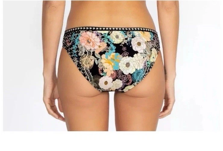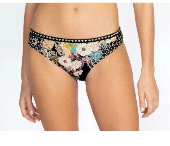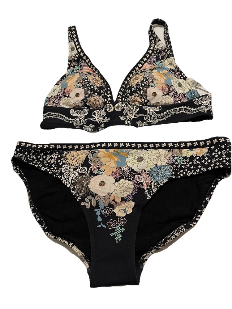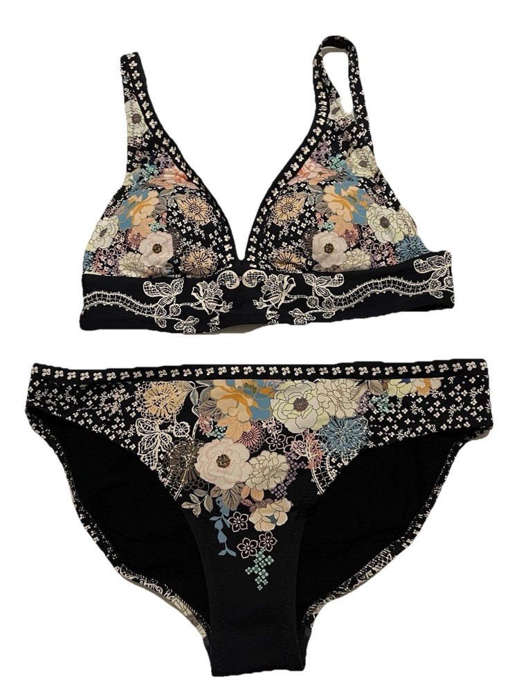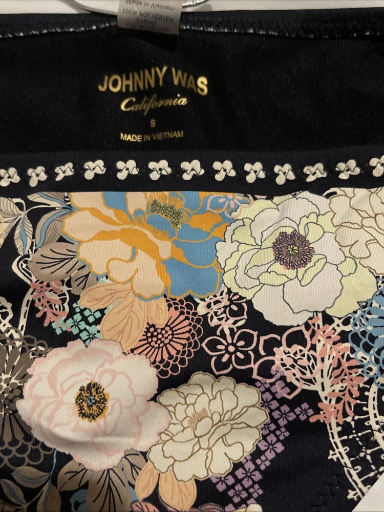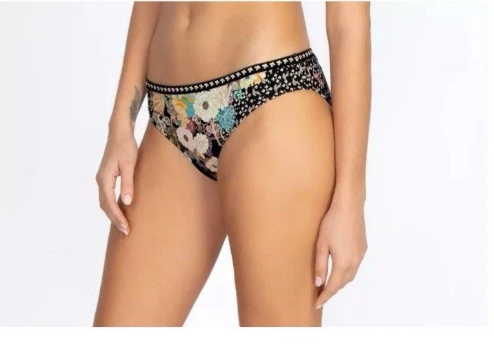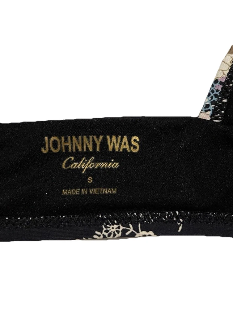 The JOHNNY WAS Size S Mila Bikini Top and Hipster Bottom Set is a stylish and comfortable swimwear option for women. The bikini top features a floral pattern and a strapless design, while the hipster bottoms are in a coordinating color. Made from polyamide, this two-piece bikini set is perfect for the beach or pool, with features like a built-in bra, padded cups, and a quick-dry design. The brand, Johnny Was, is known for its unique and detailed prints, making this bikini set a standout choice for those looking for a blend of style and functionality in their swimwear.