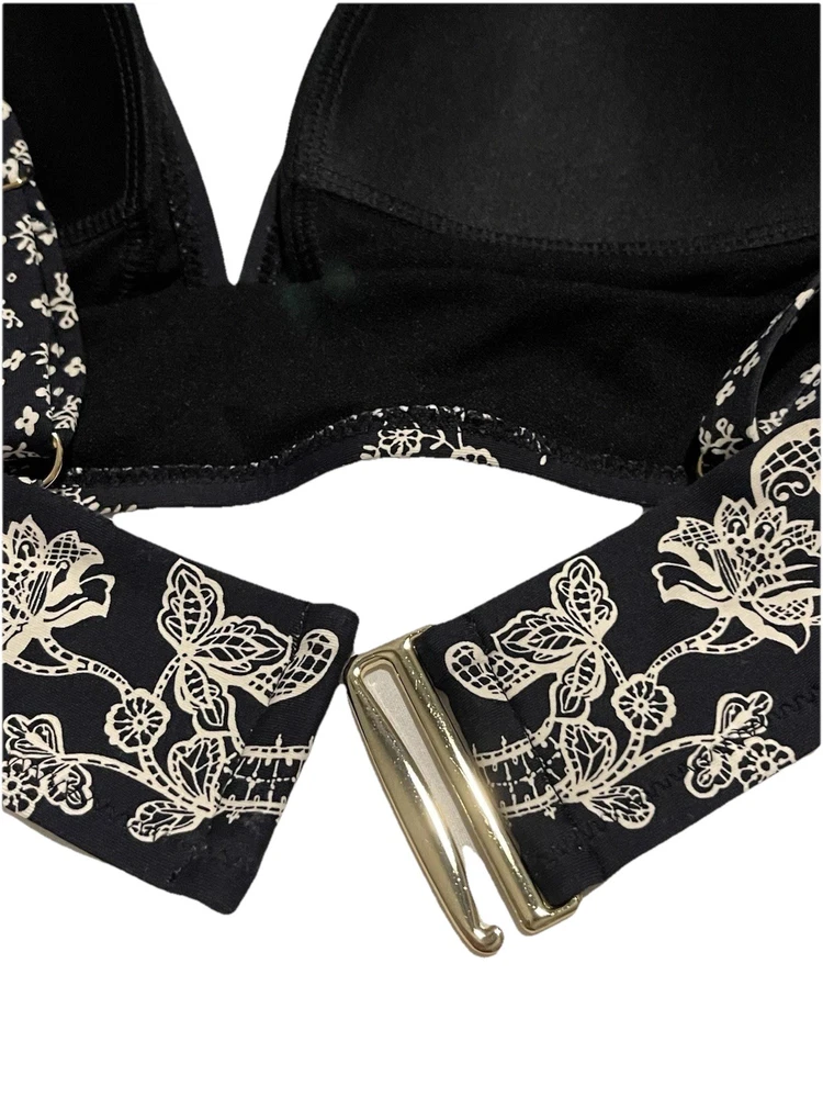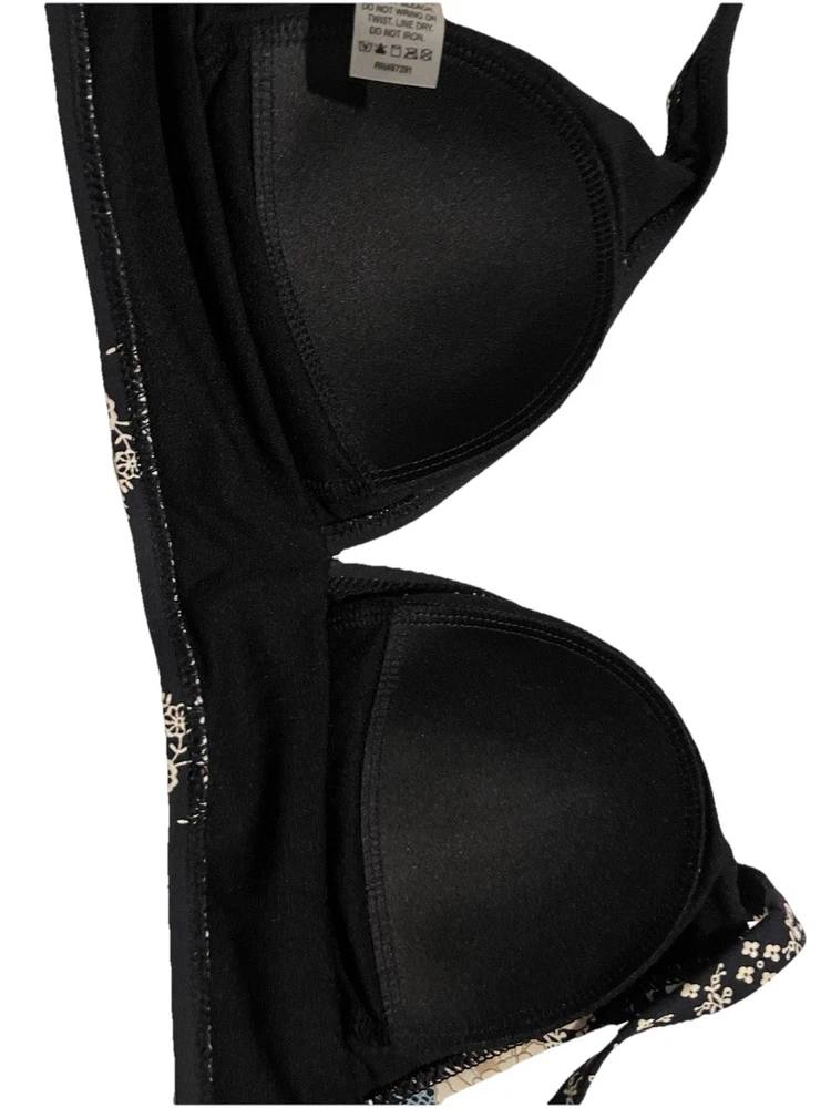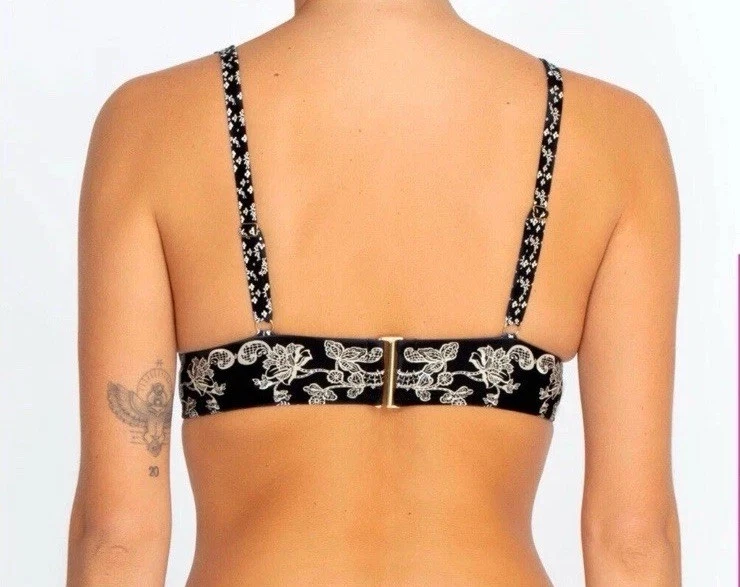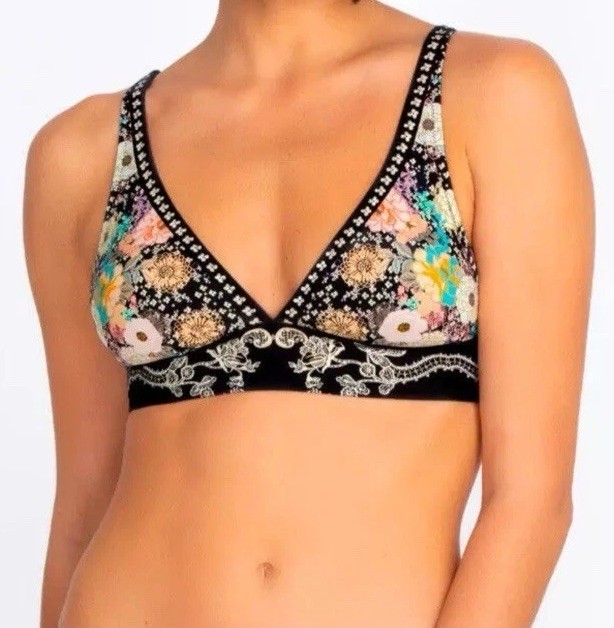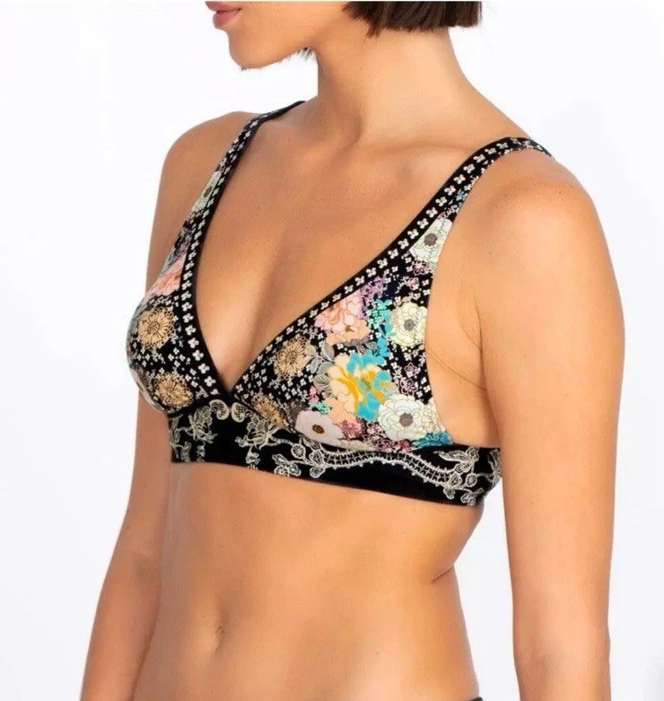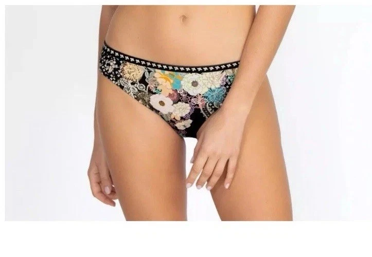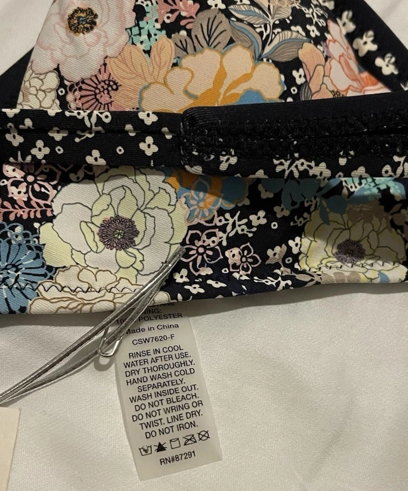 The JOHNNY WAS Size S Mila Bikini Top and Hipster Bottom Set is a stylish and comfortable swimwear option for women. The bikini top features a floral pattern and a strapless design, while the hipster bottoms are in a coordinating color. Made from polyamide, this two-piece bikini set is perfect for the beach or pool, with features like a built-in bra, padded cups, and a quick-dry design. The brand, Johnny Was, is known for its unique and detailed prints, making this bikini set a standout choice for those looking for a blend of style and functionality in their swimwear.