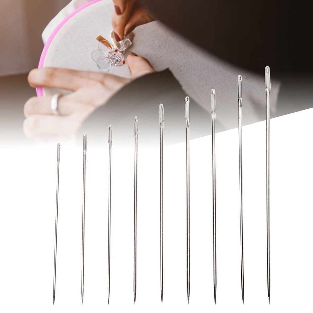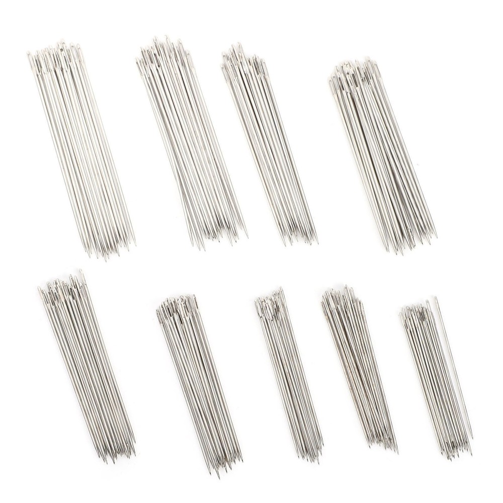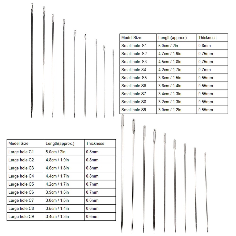 Feature: 1. The perfect sewing needle is made of good-quality stainless steel, has anti-rust and anti-corrosion functions, and a longer service life 2. Each model has 9 different sizes of hand-made sewing needles, use your hands to fix your pet's favorite clothes or your child's stuffed toy 3. Use the needles to teach your children to make some beautiful hand-made crafts will be very interesting 4. Can be used for cross stitch, decorative needle thread and embroidery, and can be used multiple times during the sewing process 5. Hand stitches are suitable for most sewing industry, leather, denim, silk, canvas and cotton, embroidery, sewing, handwork, etc. Specification: Item Type: Sewing Needles Specification: C# Large Hole: 9 Packs, 24pcs/pack, 216pcs in total S# Small Hole: 9 Packs, 24pcs/pack, 216pcs in total Model Size Length(approx.) Thickness Small hole S1 5.0cm / 2in 0.8mm Small hole S2 4.7cm / 1.9in 0.75mm Small hole S3 4.5cm / 1.8in 0.75mm Small hole S4 4.2cm / 1.7in 0.7mm Small hole S5 3.8cm / 1.5in 0.55mm Small hole S6 3.6cm / 1.4in 0.55mm Small hole S7 3.4cm / 1.3in 0.55mm Small hole S8 3.2cm / 1.3in 0.55mm Small hole S9 3.0cm / 1.2in 0.55mm Large hole C1 5.0cm / 2in 0.8mm Large hole C2 4.8cm / 1.9in 0.8mm Large hole C3 4.6cm / 1.8in 0.8mm Large hole C4 4.4cm / 1.7in 0.8mm Large hole C5 4.2cm / 1.7in 0.7mm Large hole C6 3.9cm / 1.5in 0.7mm Large hole C7 3.8cm / 1.5in 0.6mm Large hole C8 3.5cm / 1.4in 0.6mm Large hole C9 3.4cm / 1.3in 0.6mm Package List: 216 x Sewing Needles