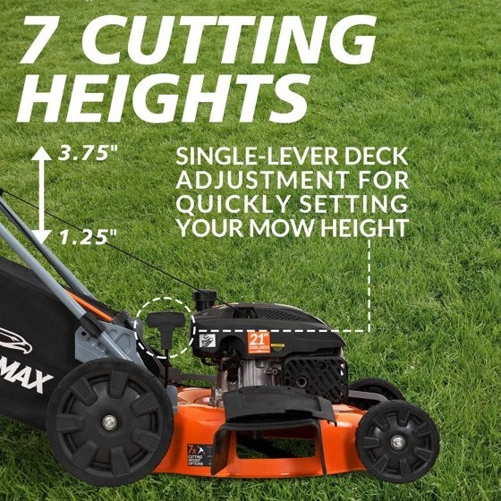 The YARDMAX 21” 3-in-1 push mower is perfect for the homeowner that wants a mower with all the features and is easy to use, but doesn’t mind pushing. The 170cc OHV Yardmax engine delivers maximum performance in this class of mower. The YG1650 features a high-rear-wheel design, and all wheels are equipped with durable 1.5” wide treads and with double ball bearings, all of which makes for easier pushing and for even cuts. Cut your lawn to your specifications by using a single convenient lever to select one of seven cutting heights, from 1.25” to 3.75”. The MaxFlow™ volute deck is designed to keep grass clippings airborne longer for superior mulching, or for flowing into the rear bag when needed. The entire mower can be compactly folded for stowing in tight garage spaces. Only limited assembly required. Key Features: Single-lever deck adjustment for quickly setting your mow height MAXFlow™ Deck Technology – volute spiral deck design for better airflow and mulching Seven cutting heights from 1.25″ to 3.75″ 21″ cutting blade lets you cut a wide area of lawn with each pass Large rear bag capacity Folds for space-saving storage Double-ball-bearing wheels for easy, smooth mowing with less pushing effort Heavy-duty, 16-guage stamped steel deck Durable, one-piece seamless steel deck reduces vibration Choose side discharge, mulching, or rear bagging 7″ front & 11″ rear wheels for stability and control Adjustable, durable 3-position handle height Specifications: Carton Size (L x W x H): 31.5″ x 24.1″ x 16.2″ Blade Length: 21″ Cutting Width: 21″ Mower Deck Width: 21″″ Front Wheel Size: 7″ Rear Wheel Size: 11″ Rear Wheel Height: High Wheel Wheel Width: 1.58″ Double Ball Bearing: Yes Wheels: Yes Assembled Required: Yes Power Type: Gas Engine Displacement: 170cc Engine Make: OEM Branded Engine Torque (ft.-lb.): 6.50 ft-lb Start Type: Pull Cord Fuel Tank Capacity (gallons): 0.21 gal Oil Capacity (oz.): 16.9 oz Recommended Oil Type: SAE 10W-30 CA (CARB) Compliant: Yes Walk Behind Mower Type: Manual Push Recommended Terrain: Flat, Sloped Size of Yard: 1/4 – 1/2 Acre Cutting Option: Bag, Mulch, Side-Discharge Mower Size Type: Standard Number of Blades: 1 Cutting Height Options: 7-position Deck Material: 16 Gauge Deck Type: Stamped Maximum Cutting Height: 3.75″Minimum Cutting Height: 1.25″ Number of Handlebar Positions: 3 Rear Bag Capacity: 1.88 bushel″