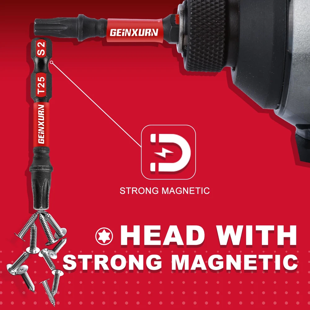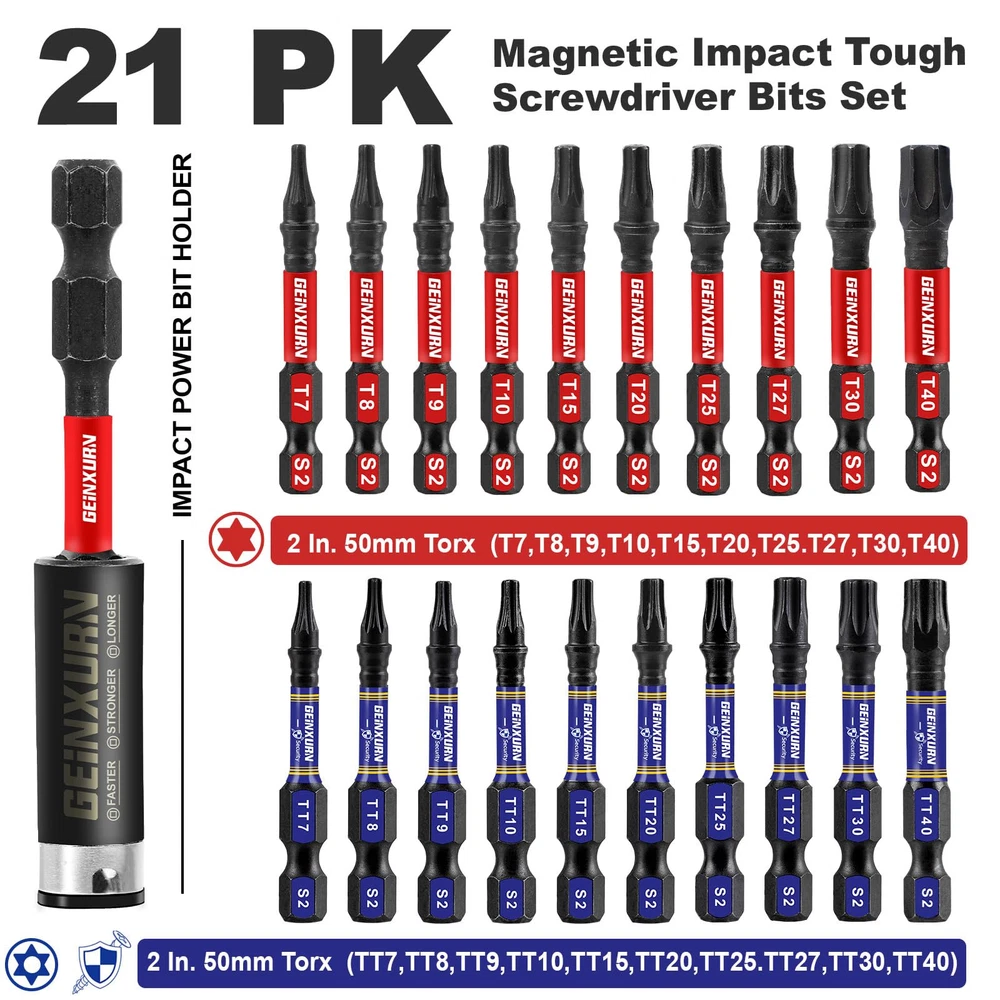 Star Screwdriver Bit: 21 Pieces mixed Torx Head Bits and Impact Magnetic Bit Holder, Impact Shock Absorbent Zone stands up to punishment from high-torque impact driver Package Include: 2 inches General Torx Bits (T7x1, T8 x1, T9x1, T10x1, T15x1, T20x1, T25x1, T27, T30x1,T40x1), 2inches Hollow Torx Bits (TT7x1, TT8 x1, TT9x1, TT10x1, TT15x1, TT20x1, TT25x1, TT27X1, TT30x1,TT40x1) Strong Magnetic Bit Set: Strong magnetic to pick up and hold screws easily with no slipping or stripping S2 Alloy Steel: it owns the features of high hardness and good toughness and resistance through strictly heat treatment, durable and suitable for any industrial use. In addition, magnetic star tips could conveniently attract screws Wide Used: Made to fit 1/4 In. hex impact drivers drill screw bit set is not only work with impact driver, but also perfect for any regular drill, electric and hand screwdrivers. This magnetic bit set are widely used in any wood working