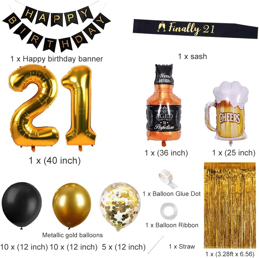 Store New Arrivals Add to Favorite View Feedback Contact Fast deliveries to the customer's home Quality customer service John Make the customers happy! 21St Birthday Decorations for Him Men, Happy 21 Bday Decor Black and Gold for Her Women Party Supplies Description 21st Birthday Party Supplies: This black gold theme birthday decorations are indeed a perfect 21st birthday gift for her or him . The birthday party kit is suitable for birthday, the birthday party decor, will definitely bring more joy to your party. Quality 21st Birthday Decorations: The 21st birthday kits are made of safe, eco-friendly premium material: a set of recyclable birthday banner, long-lasting thick balloons, a gold curtain as a shining backdrop and a sash to indicate your important 21st birthday is coming. Happy 21st Birthday Decor Set Includes: 1 x Happy Birthday banner, 10 x metallic gold balloons (12 inch), 10 x black balloons(12 inch), 5 x gold confetti balloons (12 inch), 1 x gold number balloon "2" (40 inch), 1 x gold number balloon "1" (40 inch), 1 x gold fringe curtain (3.28 X 6.56ft), 1 x "Finally 21 "sash, 1 x roll glue dot, 1 x ribbon, 1 x straw. Easy to Use 21st Birthday Decor: No need to assemble, just use a straw to blow the foil balloon and a pump for the latex balloons. Our Promise for 21st Bday Decoration: To celebrate a new life period, it's worth preparing a distinctive 21st birthday party for yourself or your family. Also, each 21st birthday decorations set has been carefully inspected to ensure a satisfactory 21st birthday decoration for her or him. Product description Unit Count 43.0 Count Color Black, Gold Pattern Letter Print Product Dimensions 9.09 x 6.77 x 0.07 inches Material Latex Theme 21st Birthday, Black and Gold Item Weight 9.5 ounces Shape Rectangular Manufacturer recommended age 8 years and up Occasion 21st birthday decorations Cartoon Character Whiskey Included Components Fringe Curtain ABOUT US We offer the best prices around on high quality products. Our E-store includes media such as books, movies, music and games while offering electronics, toys, sporting apparel, clothing, tools, general home, garden items and more. SHIPPING We are always working hard to ensure your package arrives as soon as possible. Please understand that some factors like weather, high postal traffic, and the performance of shipping companies are outside of our control. We offer free shipping to the lower 48 states and ship within 2 business days of payment, usually sooner. We do not accept P.O. Boxes. Please provide a physical address. For shipping outside of the continental USA, we only use eBay's Global Shipping Program. The item is shipped to KY and then sent to the rest of the world. International customers are responsible for all duties and taxes. Continue to 'check out' to calculate costs for shipping the item to your country. Messages regarding eBay's Global Shipping Program MUST be directed at eBay EXCLUSIVELY. RETURNS We offer a 30-Day Return Policy on items in which you are not completely satisfied with. You have the option of a full-refund or an exchange of the item. No returns are available on items shipped outside of the USA PAYMENT We accept PayPal. CONTACT US This page content is yet to come Please ad us to your favorite seller and visit again later Thank You CUSTOMER SATISFACTION We try our very best to make sure every customer is completely satisfied. If there's a problem, message us! We're happy to help. WE ACCEPT