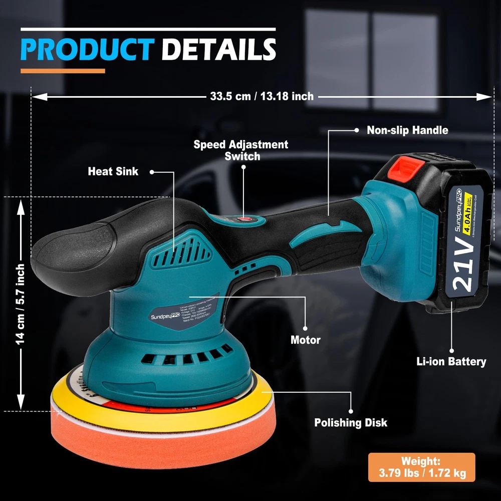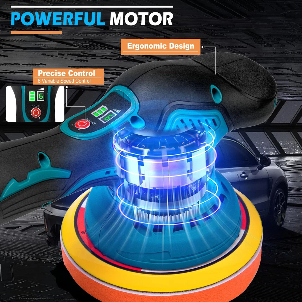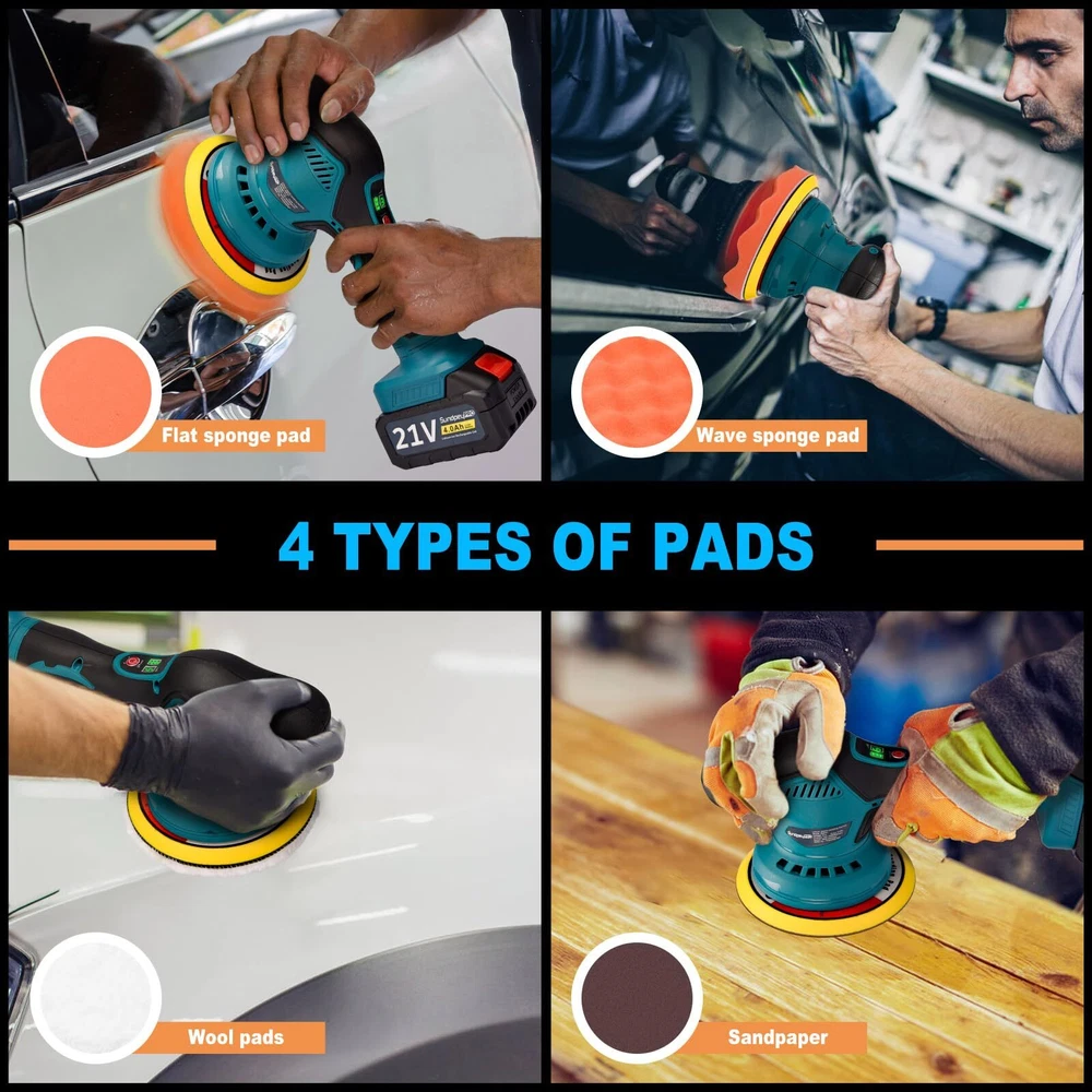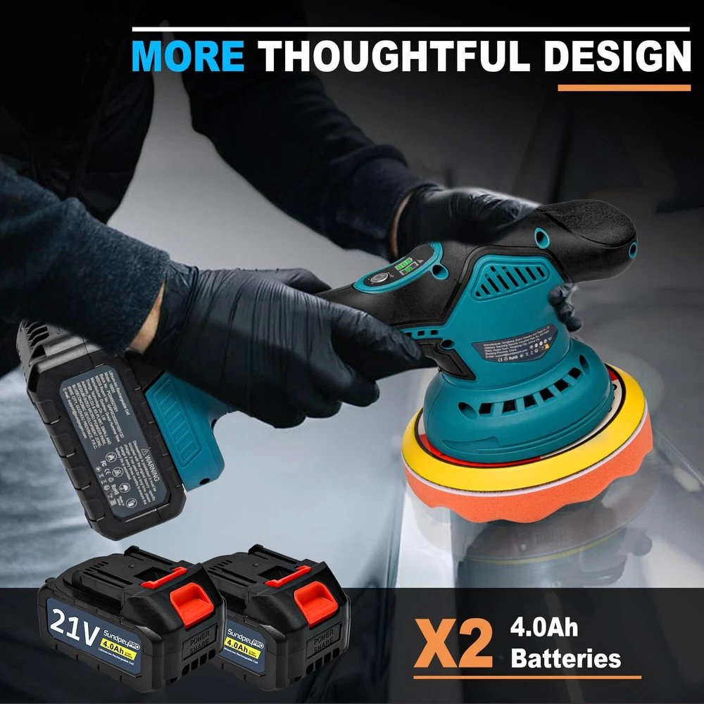 【Powerful Motor & 6 Variable Speed Control】 Orbital buffer is composed of powerful motor and pure copper wire, polishing machine eusures longer service life, but lower noise. The speed range is from 2800 rpm to 5500 rpm to meet different usage requirements. Variable speed polisher has 3 levels, low speed (1-2) can be used for waxing and polishing; medium speed (3-4) for buffing and cleaning; high speed (5-6) for removing paint defects and oxides. 【2 x 4000mAh Rechargeable Batteries】 The rechargeable dual action polisher is equipped with 2*21V 4000mAh rechargeable li-ion batteries and charger, small size and large battery capacity. The batteries can be used alternately without worrying about running out of power. Sanding machine also has anti-overload, anti-overcharge and anti-overheat functions to provide more safety protection. Please retain power for the battery when not use, to better protect the battery life. 【Lightweight & Portable】 The cordless polisher weighs only 1.72 kg, making it easy to carry and . The ergonomic, non-slip handle of the polisher machine is comfortable to the touch and easy to hold for a secure grip and precise control. 【Easy to Use】rotary polisher can be used anywhere by simply plugging in the battery. Before use, align the required pads or sandpaper to the polishing disk, after installing firmly, then select the required gear according to the actual scene, the push switch design is easy to control. 【What You Will Get】 Car buffers and polishers kit includes: 1 x buffing machine, 2 x 21V 4.0Ah lithium batteries, 1 x fast charger, 1 x flat sponge pad, 1 x wave sponge pad, 1 x wool pads, 1 x sandpaper. It is an ideal choice for car polishing, waxing, buffering, and is friendly to both professionals and beginners. 【Friendly 】 provide 12 months after-sales service! If you have any questions about the product or order, please feel release to let us know, we will provide you with good within 24 hours to solve the problem.