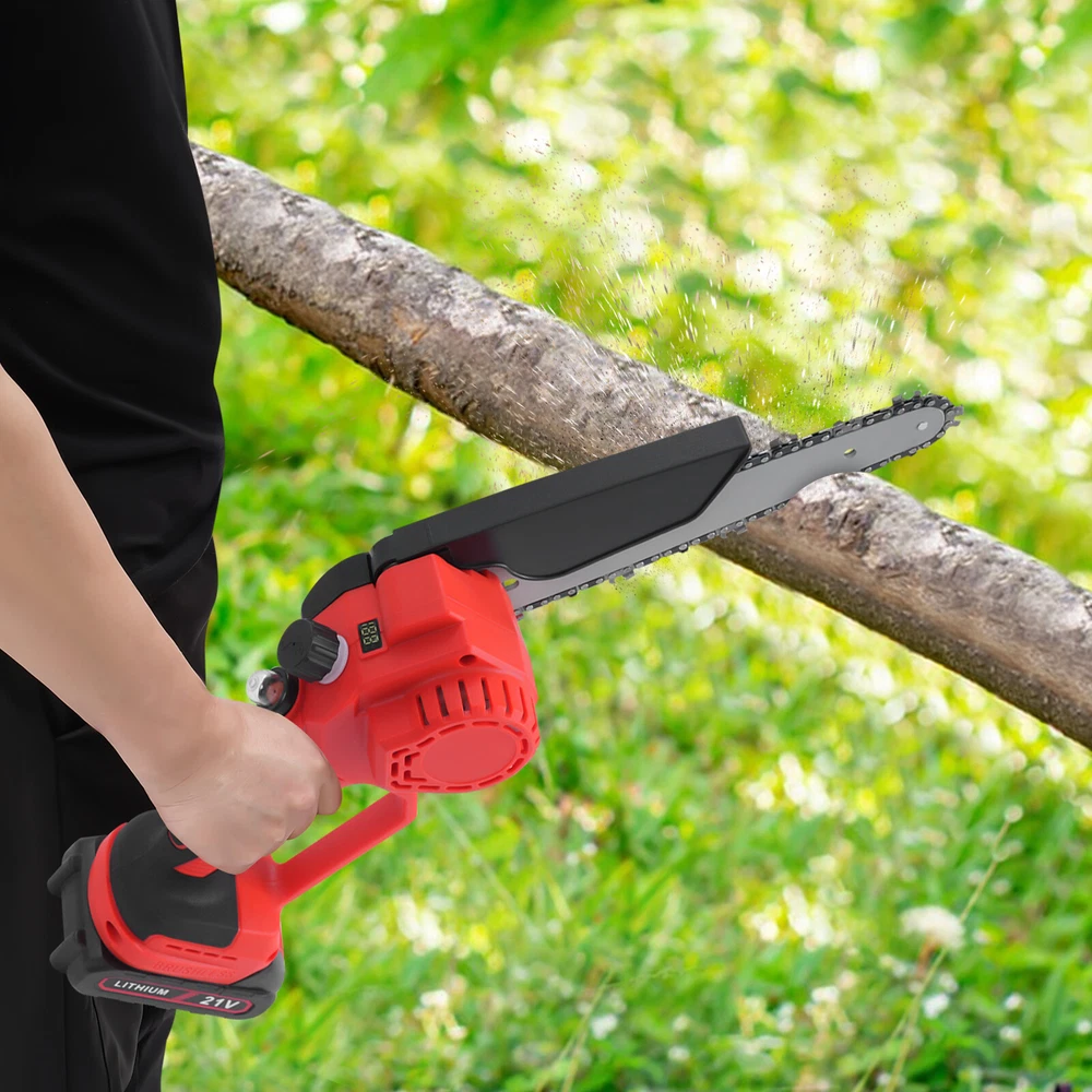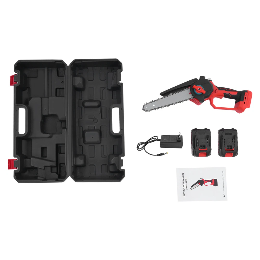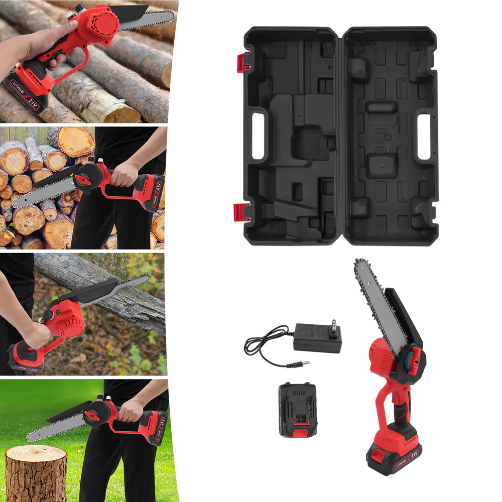 21V Mini Chainsaw Cordless Chainsaw, Handheld Electric Chain Saw 1500mAh Battery Description Using traditional axes to cut wood is inefficient and very tiring, so you can choose our mini handheld electric chain saw for improving efficiency in pruning, wood cutting, and gardening. It provides a great cutting effect and features a lightweight and compact design. With a battery-powered power source, it can be conveniently used for outdoor operations, and in locations without access to sockets. Having it will make your work easier and simpler! Key Features Sturdy and Durable: It is made of high-class steel and adopts a quenching process, which is rustproof , not easy to deform and damage, and has a long service life. Excellent Performance: With up to 1000W of power and 4000 rpm, it can effici ently cut wood with a diameter of up to 11.81 inches to give you outstanding performance. High Safety: It has overheat protection and self-locking function, which can ensure the safety of use, and the heat dissipation holes on the machine can ensure good heat dissipation. In addition, the chain guard prevents the splashing of wood chips. Economical and Practical: With it, you can cut down wood yourself without having to pay the carpenter, making it very cost-effective. Additionally, these two replaceable batteries can keep you using them for a long time! Convenient and Comfortable: Its cordless design and ergonomic handle provide you with a more comfortable user experience and allow you to operate with greater ease. Seniors, women, and beginners will appreciate how simple it is to use for pruning branches, shaping bushes, or clearing small logs. Easy to Carry: The carrying case and its lightweight (6.7 lbs) make it very easy to carry, and it also makes it easy for you to organize your product and prevent your batteries or charger from getting lost! Ideal Gift: With its great features and practicality, you can give it to your carpentry friends for a holiday or a housewarming gift! Customer Service: We aim to provide quality products and services. If you have problems, please feel free to contact us. We will reply and solve the problem for you as soon as possible. Details Clear Screen: It displays the power level clearly for your convenience. Lubricant Oil Tank and Oil Bulb: They make it easy for you to add lubricant oil to make the chain's operation more smooth (not included). Application It can cut wood with a diameter of up to 11.81 inches. It is suitable for wood cutting, gardening pruning, twig cutting, and shrub pruning. It is widely used in gardens, farms, parks, forests, greenhouses, pastures, and orchards. It is ideal for home repairs and maintenance, outdoor camping, and adventures. Specification Color: Black and Red Assembly Required: Yes Mount Type: Handheld Power Source: Battery Powered Plug Type: US Standard Motor Type: Brushless Motor Material: Steel Process: Quenching Power: 1000W Speed: 4000RPM Adapter Model: SRJ21F-48F Input: 100-240V AC Output: 21V, 0.8A Each Battery Capacity: 1500mAh Battery Type: 2* 21V Li-on Batteries Chain Length: 20.32cm/8inch Max. Cutting Diameter: 25-30 cm/9.84-11.81inch Product Size: 8*11.5*58cm/3.15*4.53*22.83inch Package Size: 48*13*19cm/ 18.9*5.12*7.48inch Gross Weight: 3.2kg/7.05lbs Net Weight: 3.04kg/6.7lbs Package Included 1* Handheld Electric Chain Saw 2* Batteries 1* Carrying Case 1* Power Adapter 1* English Manual Notes Please clean and lubricate the chain regularly. Please note that the product does not include chain lubricant. Please note that there are two batteries inside the package, only one needs to be used at a time, and the other is a backup. Please pay attention to the tightness of the chain at all times. Please read the English manual completely before use, and pay particular attention to the safety instructions included. Please allow the slight color difference caused by the shooting light and 1-3cm error due to manual measurement, and make sure you do not mind before ordering. Payment Delivery details Terms of sales About us Contact us Payment We accept ebay payment 。 Fees such as import duties, taxes are not included in the item price or shipping costs. These charges are the buyer's responsibility. Delivery details Shipping: 2-9 working days to: USA Terms of sales We maintain high standards of excellence and strive for hundred percent customer satisfaction. Feedback is very important to us. We hope that you contact us immediately before you give neutral or negative feedback, so that we can address your concerns. It is impossible to address issues if we do not know about them! About us Your satis faction is our ultimate goal. We work hard to earn your trust and future business. Our certified technicians have tested each item before shipping. The unit comes with 1 year limited warranty on all manufacturing defects. a) If you receive a defective item, you may return it or ask for a discount. Please contact us within 14 days after you receive the package. b) What you returned must be intact and in its original packaging as re? u. Customer is responsible for shipping costs of the returned item. c) We will cover the cost of shipping back t with the shipping rate indicated in the registration page. We will send you a new unit or refund the full payment you paid. Thank you. Contact us Business Hour Business Hour: Monday To Friday: 8:30 AM to 5:00 PM (Beijing China time) Due to time zones, our reply to your questions may not be immediately. But within above working time, we will reply your email within 24 hours. If it's non-workdays, please kindly be patient and wait till Monday. Please contact us with ebay message. Please feel free to contact us if you have any questions. Monday To Friday: 8:30 AM to 5:00 PM (Beijing China time) Due to time zones, our reply to your questions may not be immediately. But within above working time, we will reply your email within 24 hours. If it's non-workdays, please kindly be patient and wait till Monday. Please 