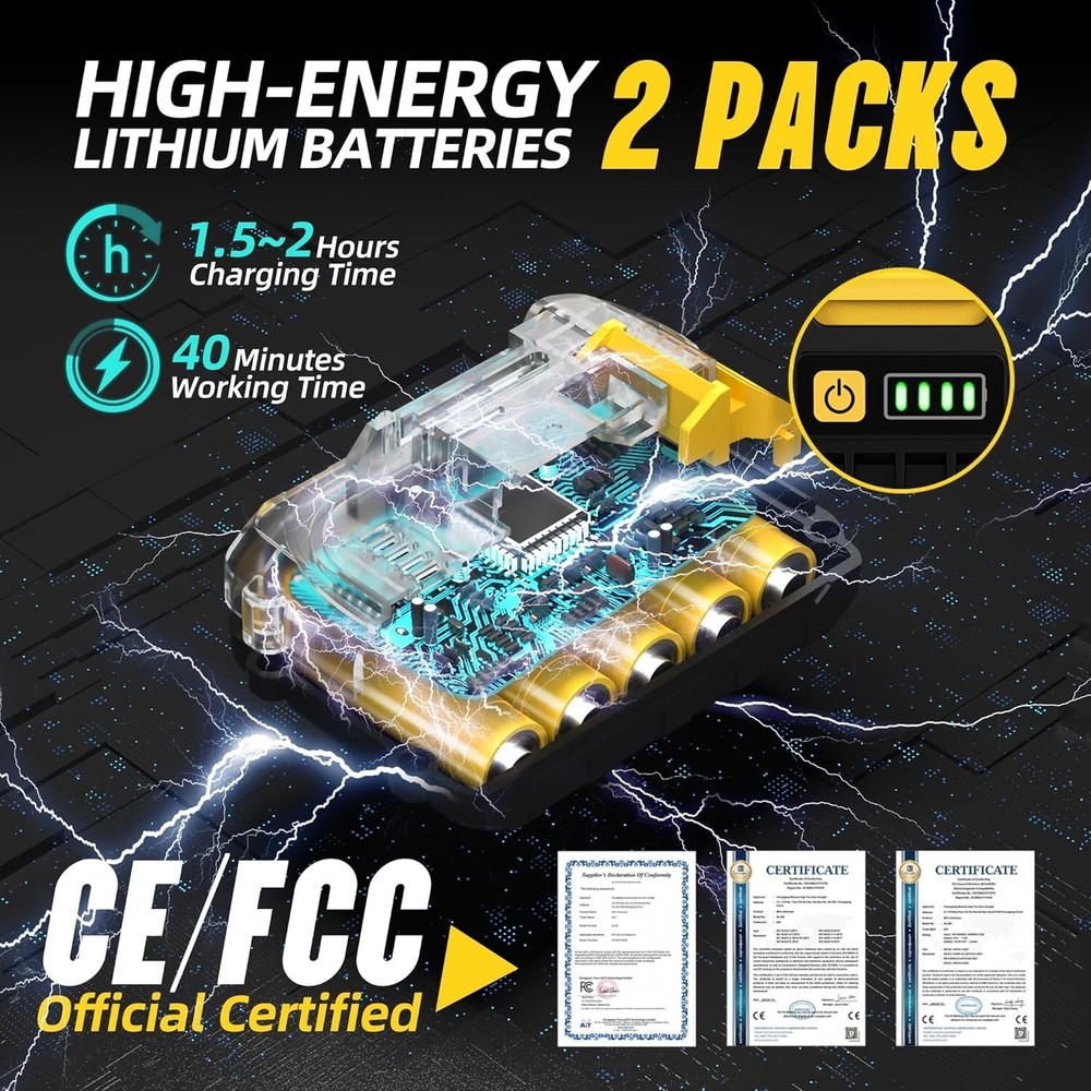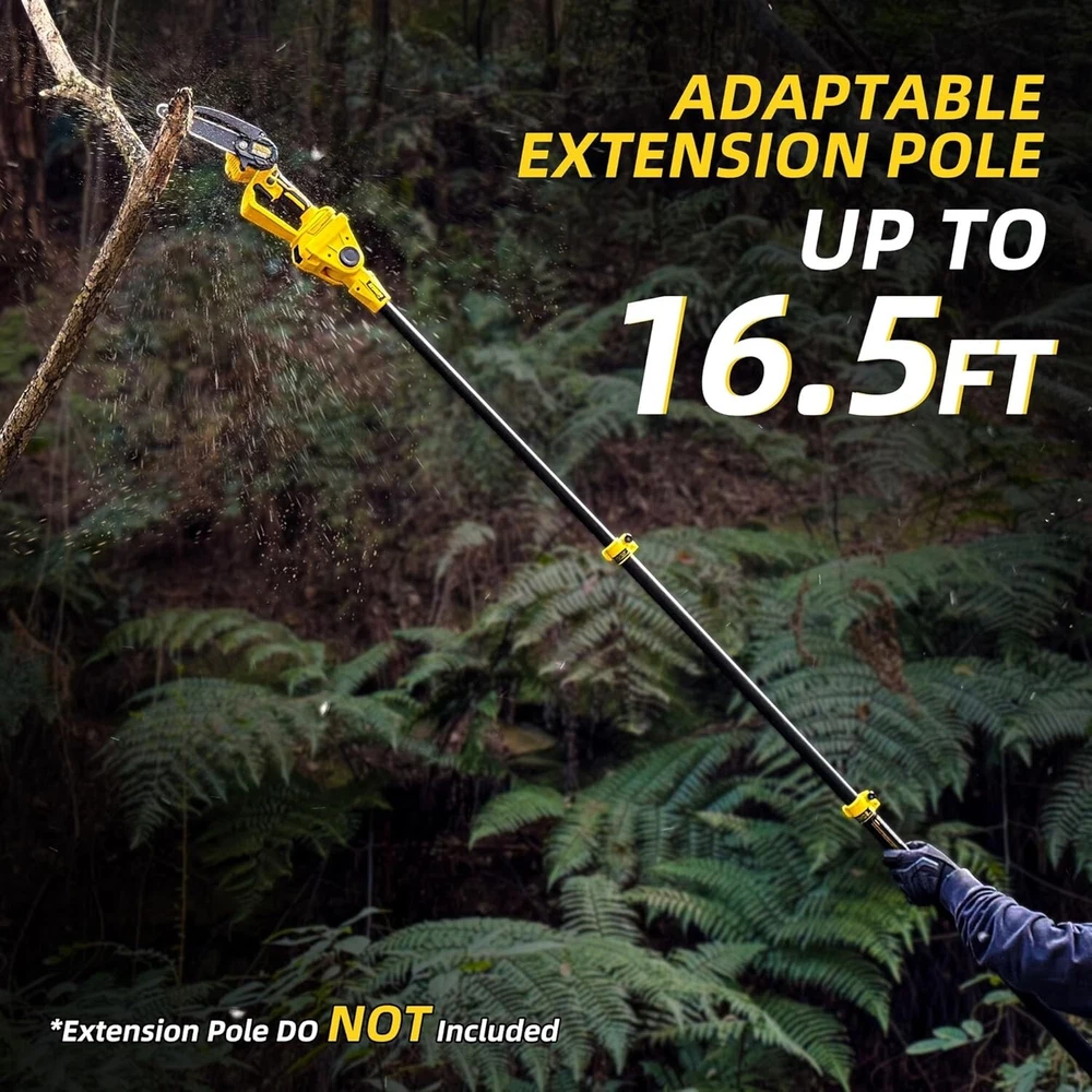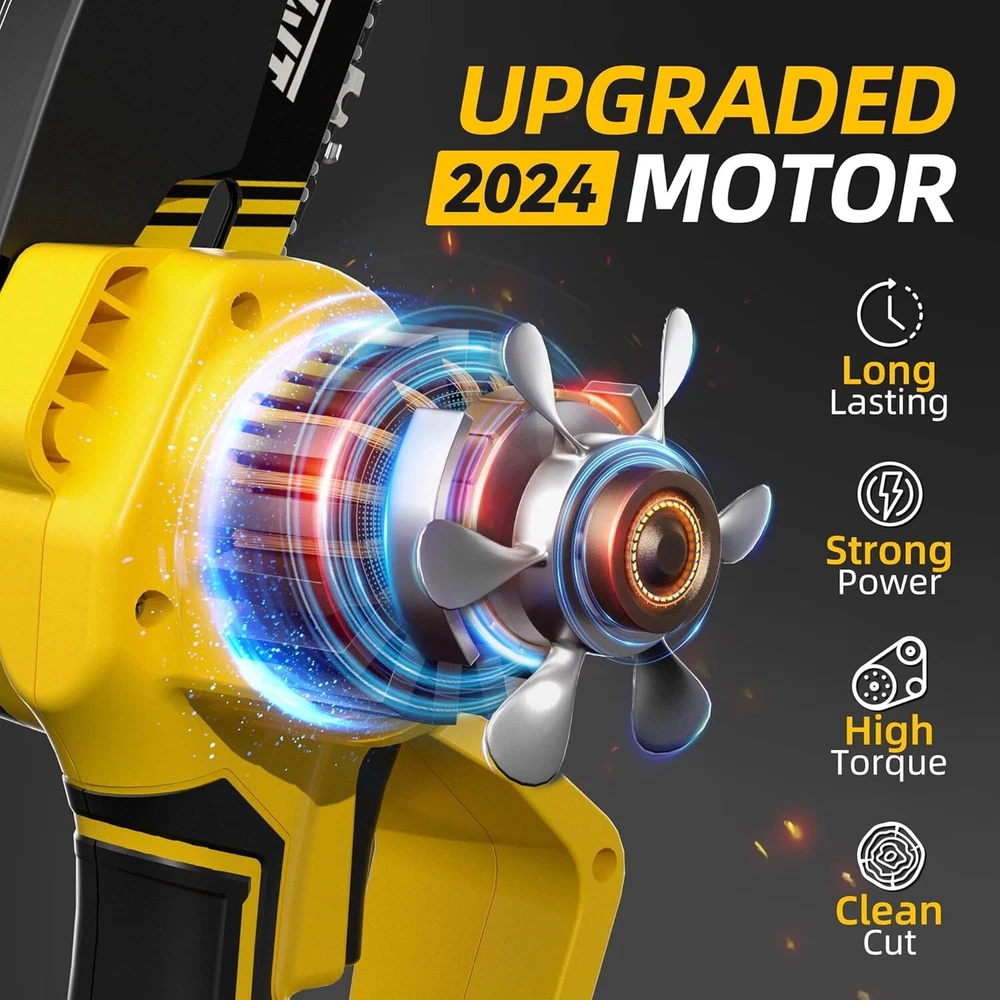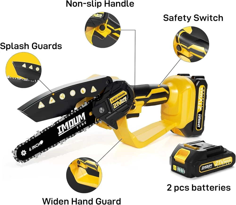 Cordless Chainsaw for DeWALT 20V Max Battery 6-Inch Hand-held Mini Pruning Saw Description A cool gift gadget for dad, elderly men, husband, yard work lovers, DIYers Powerful & Efficient Cutting: The mini chainsaw features a newly upgraded 2024 550W motor, allowing for up to 30 cuts per charge. Adequate for trimming, pruning, and cutting in the garden or yard Ultra-Lightweight Chainsaw: Only 2lb, its lightweight nature ensures that you can keep going this electric saw without any fatigue, making it ideal for seniors and women 2 Packs Batteries: This cordless chainsaw comes with 2 FCC & CE certified lithium-ion batteries, provides an impressive 100 minutes of continuous use for outdoor tasks Pole Saw Attainable: Compatible with the exclusive IMOUMLIVE extension pole, this electric chainsaw can reach up to 16.5ft for easier trimming of higher tree branches (the pole sells separately) Safety-First: Featuring a safety lock to prevent accidental starting, this handheld chainsaw also includes a widened hand guard for added protection. Keep your hands safe while working 365-day NO Worry Quality Service: Enjoy a one-year customer service for the chainsaw and batteries, with returns or exchanges available within this period. Your satisfaction is our priority Out of the Box: This electric saw comes fully assembled and ready to use. Includes a chainsaw, 2 chains (one installed), 2 batteries, a charger, and a pot of lubricant. Get started on your projects right away