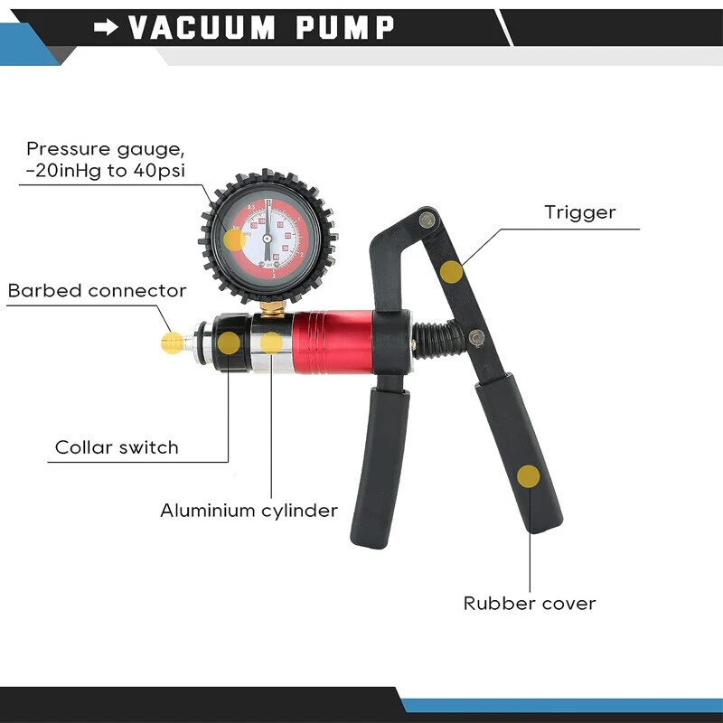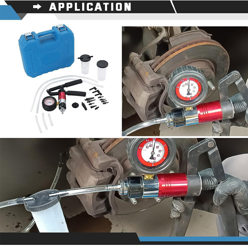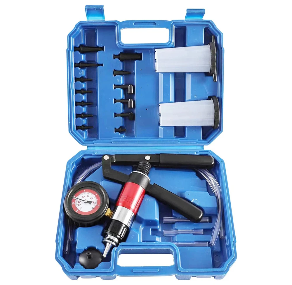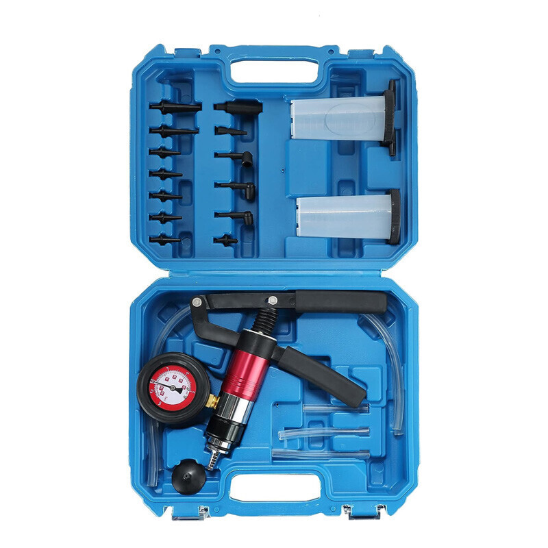21Pcs Hand Held Vacuum and Pressure Pump Tester Tool Brake Bleeder Kit + Case Item Description Multifunction: The 2-in-1 Vacuum Pump Tester Suite is equipped with a vacuum gauge to help you accurately read data. Pressure 40 PSI, vacuum 20 HG. It includes accessories for brake deflating and automotive diagnostics. Vacuum Pump Kits test and diagnose various components and universal systems on bicycles, motorcycles, trucks, pickups or any other vehicle. Rugged construction: made of high-quality stainless steel to ensure the durability and high performance of the brake relief kit, a comprehensive vacuum pump tester kit allows the testing of many vacuum operating systems Single operation: Our brake bleeder kit is suitable for sucking out waste oil and air, and guiding the new oil to fill all the system. The biggest advantage is that you can operate the bleeder by yourself without any assistant! Easy to carry: The portable storage case is made of high quality materials and is durable. Suitable for home and business applications, easy to transport and store. 100% Satisfaction: We are responsible for every product. If you have any problems with our products or services, please contact us immediately and we will provide you with exceptional responses to your every concern. Features A set comprehensive vacuum pump & vacuum tester brake bleeder kit allows testing of many vacuum operated systems. Made of high quality alloy steel and plastics, which is resistant to corrosion, durable and practical. Portable tool includes different adapters designed for most vehicles, the control switch can be switched on the positive and negative pressure mode. Equipped with vacuum gauge, convenient readout of pressure. Handheld vacuum pump is easy to bleed your car brakes by yourself. Suitable for testing boost pressure, vacuum solenoid valves, tank ventilation, MAP sensors, etc. All the tools are well organized in a blow molded case to store the components and easy to carry. How To Use 1. Make sure vehicles master cylinder reservoir is full 2. Bleed the wheel cylinders and calipers from front wheels to rear ones 3. Assemble the brake clutch fluid bleeder tool according to following sequence: Hand pump - 4" hose - transfer cover "To Pump" side - 4" hose to the bottom of the transfer cover & storage jar - 20" hose - proper size adapter - vehicle brake bleeder valve 4. Attach the brake bleeding fitting to the bleed screw and pump the brake bleeder pump 10-15 times to create a vacuum in the storage jar 5. Open the vehicle’s brake bleeding fitting 1/4-1/2 turn and allow about 2 in of fluid to flow into the storage jar 6. Fill the master cylinder reservoir back to normal with fresh fluid and proceed to the vehicle’s next brake and perform the same steps Specifications Condition:100% Brand New Warranty: 90 Day Free Return:30 Day Material: plastic, metal Quantity: 21pcs (1 set) Package Weight: approx.1742g Fitment: Universal for most of cars Package Included As pictures show FAQ: I purchased by mistake, how do I cancel the order? Please contact us ASAP. If the item has not been shipped out we can cancel the order for you. If the item was shipped out you can refuse the package and wait for the item to return to us. I received your item but it does not fit or is defective Please contact us so we can assist you on the matter. Buy with confidence Our quality is based on meeting the requirements of the manufacturer and improvement them in design problems manufacture. NOTE: (1)It would be highly appreciated if you might contact us first once you have any problems concerning the items. And you can expect all the issues would be resolved ASAP! (2)Please let us know before you send us the neutral/negative feedback that wont help to finish the issues. And I will definitely try my best to provide the best solutions which would meet our satisfactory! (3)According to the distance of the receipt address items would be sent from CA or NJ