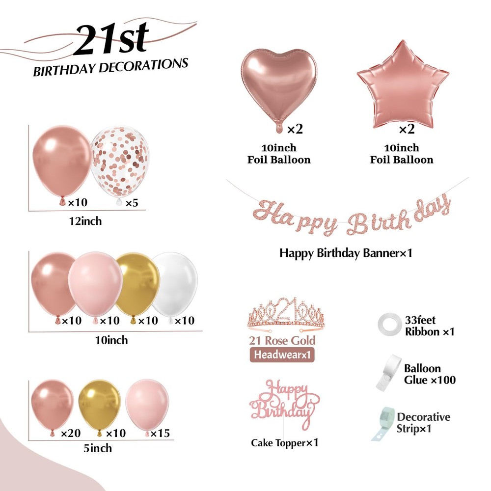 21st Birthday Decorations for Her, Rose Gold Birthday Decorations with Backdrop, Tablecloth Birthday Sash Birthday Banner Foil Balloons for Women 21st Birthday Party Decorations Package Include: The 21st birthday decorations includes 40 metallic rose gold balloons (12", 10", 5"), 20 metallic gold balloons (10", 5"), 25 light pink balloons (10", 5"), 10 white balloons (10"), 5 rose gold confetti balloons (12"), happy birthday background backdrop, sash, tablecloth, 1 happy birthday banner, butterfly birthday decorations, glue dots, ribbon, decorative strip Well-made: Each set of happy 21st birthday decorations is carefully inspected to ensure the following: well-made balloons that are long-lasting, not easily popped, free from annoying holes and odors. No more misspelled rose gold happy birthday banners! Ensure that every women has a happy 21st birthday Easy to Use: We will provide 3 balloon tools, including ribbon, glue dots, and decorating strip. Decorating her 21st birthday with 21st birthday balloons requires some patience. After inflating the balloons, use the decorating strip tool to tie the latex balloons together, then secure them to the wall with ribbon and glue dots, creating a beautiful balloon arch. Just take it home and enjoy a 21st birthday party for yourself or your family All-in-One Package:The rose gold birthday decoration kit for women include metallic rose gold balloons and a glittering rose gold happy birthday banner and 21st birthday sash, foil balloons, rose gold backdrop for your 21st birthday party. This will surely leave a lasting impression on every 21st birthday. A great birthday party gift for you Warm Reminder: If you're not happy with the balloon arch kit for any reason,we will work hard to solve the problem until the problem is resolved. We're committed to providing you with great service and helping you create the great party atmosphere Package Include: The 21st birthday decorations includes 40 metallic rose gold balloons (12", 10", 5"), 20 metallic gold balloons (10", 5"), 25 light pink balloons (10", 5"), 10 white balloons (10"), 5 rose gold confetti balloons (12"), happy birthday background backdrop, sash, tablecloth, 1 happy birthday banner, butterfly birthday decorations, glue dots, ribbon, decorative strip Well-made: Each set of happy 21st birthday decorations is carefully inspected to ensure the following: well-made balloons that are long-lasting, not easily popped, free from annoying holes and odors. No more misspelled rose gold happy birthday banners! Ensure that every women has a happy 21st birthday Easy to Use: We will provide 3 balloon tools, including ribbon, glue dots, and decorating strip. Decorating her 21st birthday with 21st birthday balloons requires some patience. After inflating the balloons, use the decorating strip tool to tie the latex balloons together, then secure them to the wall with ribbon and glue dots, creating a beautiful balloon arch. Just take it home and enjoy a 21st birthday party for yourself or your family All-in-One Package:The rose gold birthday decoration kit for women include metallic rose gold balloons and a glittering rose gold happy birthday banner and 21st birthday sash, foil balloons, rose gold backdrop for your 21st birthday party. This will surely leave a lasting impression on every 21st birthday. A great birthday party gift for you Warm Reminder: If you're not happy with the balloon arch kit for any reason,we will work hard to solve the problem until the problem is resolved. We're committed to providing you with great service and helping you create the great party atmosphere Shipping from the USA All of our products are shipped from the USA, ensuring quick delivery to your destination. Payment We offer the following payment methods: PayPal, credit card, bank transfer, and eBay's secure payment system. Free Shipping & Free Returns Shipping within the USA is FREE. Additionally, any return is absolutely free for you. Risk-Free Purchase You have the option to return an item within 30 days without any justification. We cover the return shipping costs! Fast Shipping We ship immediately upon receipt of payment. Generally, the package is delivered within 2-3 days in the USA. If it takes longer, we will contact you. Quality and Costs Made in Europe, USA, China No customs fees or additional charges Total satisfaction guarantee Invoice with declared VAT available upon request in .pdf format Feedback Your feedback is very important to us. After you pay for your purchase, you will automatically receive positive feedback from us.